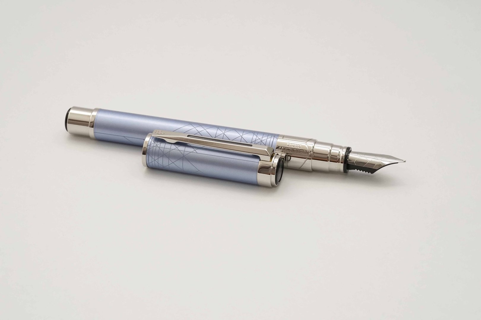 Bút máy Waterman Perspective Decoration Blue là model tiêu biểu và đặc sắc của dòng Perspective, mang đến vẻ đẹp khó cưỡng trong từng chi tiết tinh xảo. Bút có kích thước midsize và trọng lượng khá vừa tay. Phần thân và nắp bút bằng hợp kim đồng thau, bề mặt vỏ bút được hoàn thiện bởi lớp sơn mài màu xanh lam rất đẹp, xen kẽ là các đường phối cảnh hình học mô phỏng sự thuần khiết của kiến trúc hiện đại, đó là các góc độ và tỷ lệ hoàn hảo của các tòa nhà đô thị nổi tiếng. Nắp khi đậy tạo tiếng “tách” khá thanh, cài bút bằng kim loại mạ chrome được tạo dáng góc cạnh rất tinh tế, đỉnh nắp và đuôi cài có trang trí logo Waterman. Thân bút có chiều dài và kích thước hợp lý nên tạo cảm giác thoải mái khi sử dụng. Cụm section được mạ chrome trắng sáng tạo sự liền mạch với ngòi bút, bề mặt section có khắc chữ Waterman Paris rất chi tiết. Ngòi bút hoàn thiện từ hợp kim thép cao cấp, lưng ngòi trang trí các đường đồ hoạ cách điệu cùng logo Waterman, ngòi bút cỡ M cho ra nét chữ trơn mượt khi viết hoặc ký. Bút bơm mực bằng converter Waterman đi kèm.