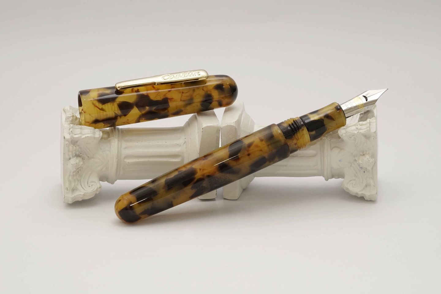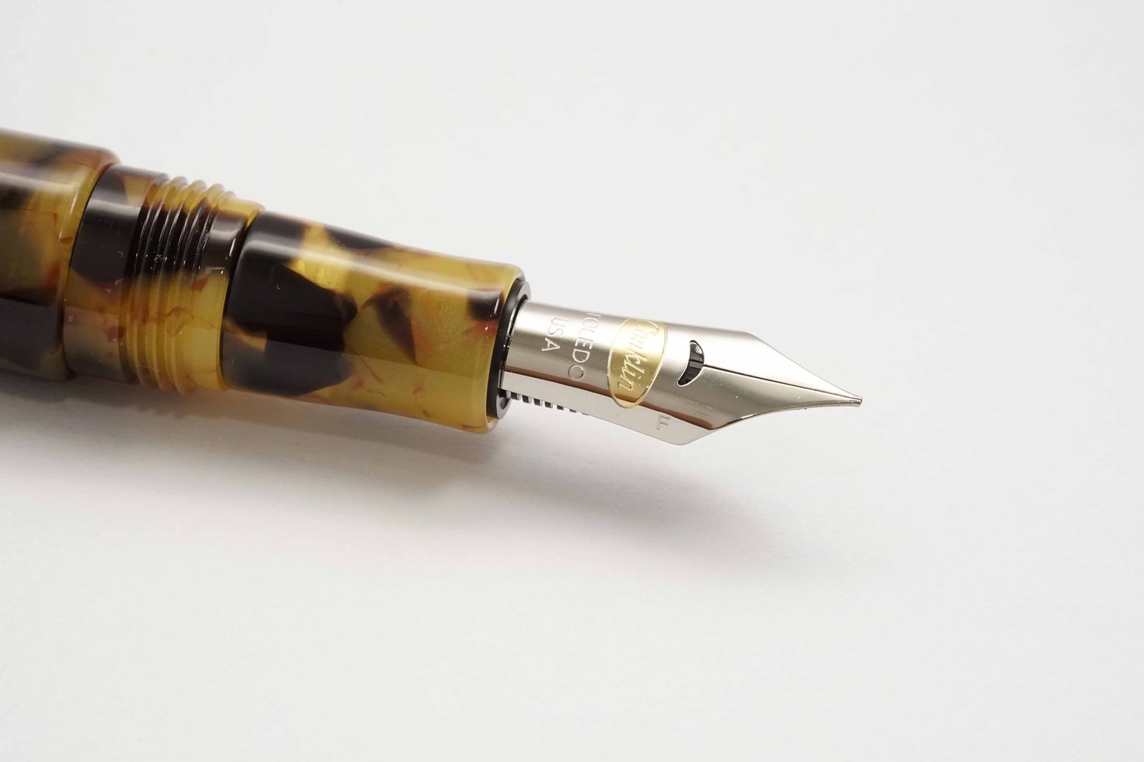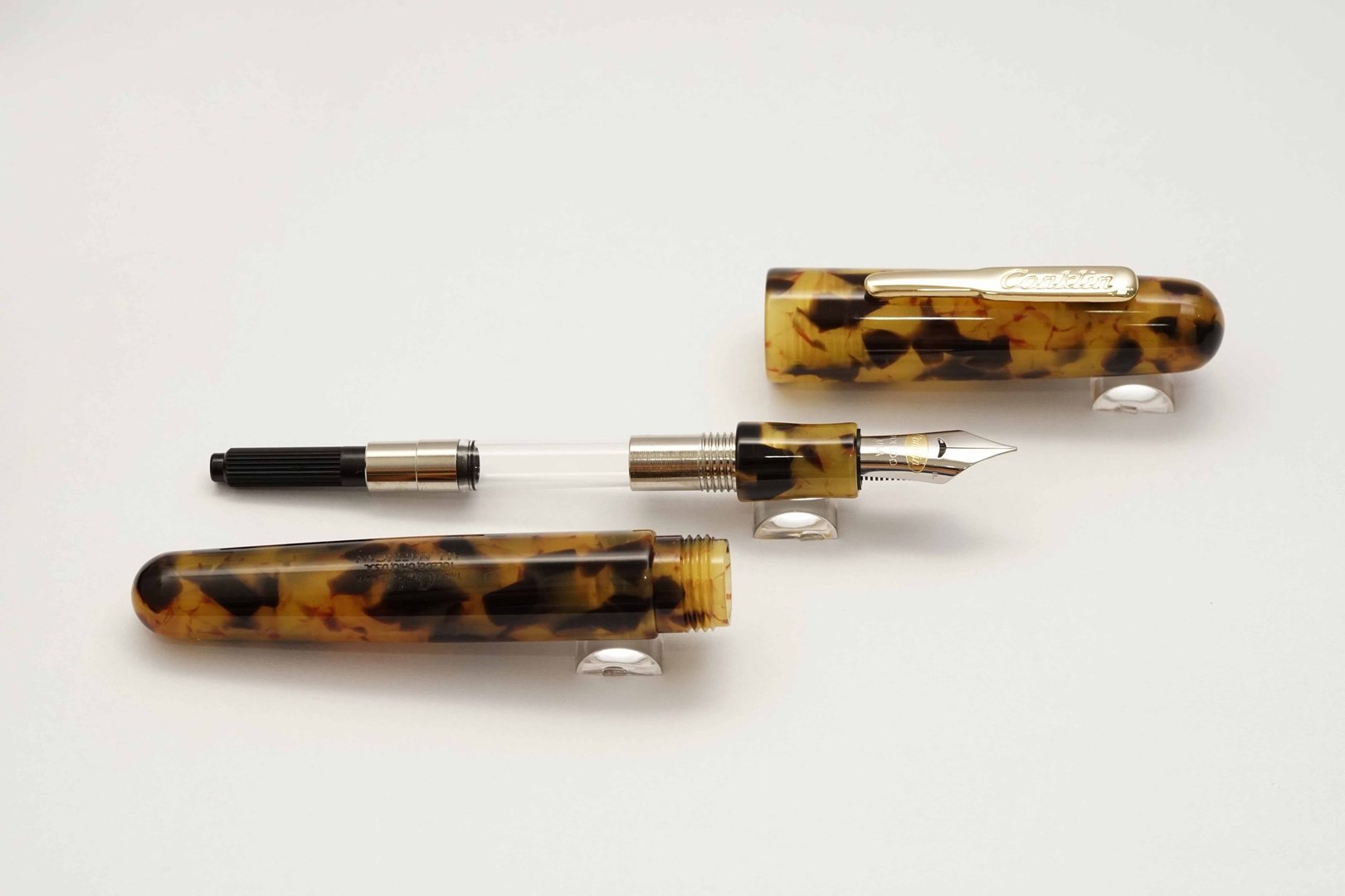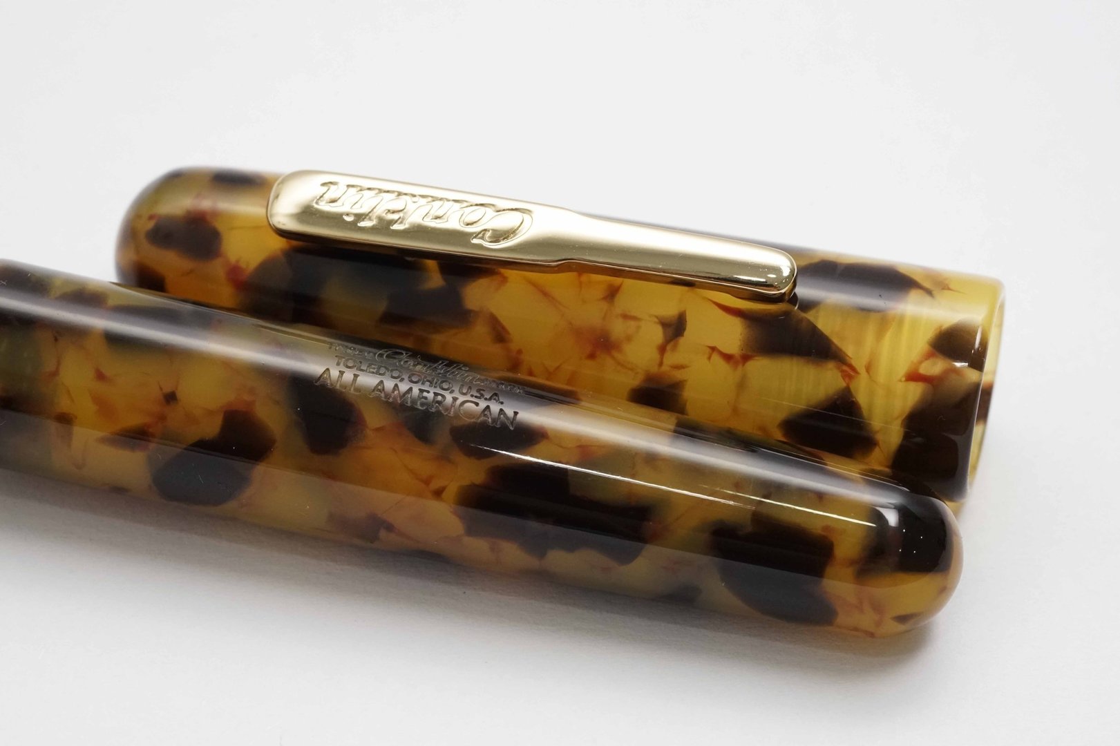 Conklin All American Tote Island Stella là phiên bản bút máy được làm thủ công với chất lượng hoàn hảo và độ thẩm mỹ cao. Bút có kích thước lớn ấn tượng nhưng không quá to để gây khó chịu khi cầm trên tay. Phần thân và nắp bút bằng hỗn hợp nhựa resin màu hổ phách xen lẫn các đốm màu đen ngẫu nhiên. Nắp bút đậy kiểu vặn và tạo điểm nhấn với thanh cài “rocker clip” đặc trưng của Conklin cho phép người dùng dễ dàng giắt bút cố định trong túi áo sơ mi hoặc áo khoác. Thân bút có chiều cân đối tạo cảm giác thoải mái khi cầm. Ngòi bút của Conklin All American Tote Island Stella khá đặc sắc khi được chế tác từ hợp kim thép cao cấp do Đức sản xuất mang lại cảm giác viết vượt trội, lưng ngòi trang trí logo Conklin mạ vàng bắt mắt, ngòi bút cỡ F cho ra nét chữ khá gọn và bám giấy khi viết. Bút bơm mực bằng converter loại tiêu chuẩn đi kèm.