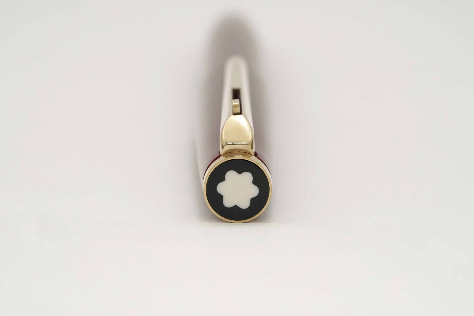 Là phiên bản có màu sắc nổi bật với tone màu đỏ Burgundy bắt mắt, set bút bi và bút máy Montblanc Classic Burgundy thuộc series Montblanc vintage nổi tiếng những năm 1970s. Bút có thiết kế đơn giản nhưng đem lại hiệu suất cao với kích thước gọn nhẹ, dễ sử dụng. Thân và nắp bằng hỗn hợp nhựa resin màu đỏ khá đẹp. Đỉnh nắp có đính logo Montblanc nhỏ màu trắng. Thanh cài bằng hợp kim mạ vàng thiết kế dáng góc cạnh nam tính và cứng cáp khi cài lên áo, cụm thanh cài được liên kết chắc chắn với thân nắp. Vòng ring nhỏ ở viền nắp bằng hợp kim mạ vàng, có khắc chi tiết chữ Montblanc. Ngòi bút bằng vàng 14K 585 nét F, lưng ngòi có khắc logo hoa tuyết đẹp và sắc nét. Bút bơm mực bằng converter Montblanc đi kèm.