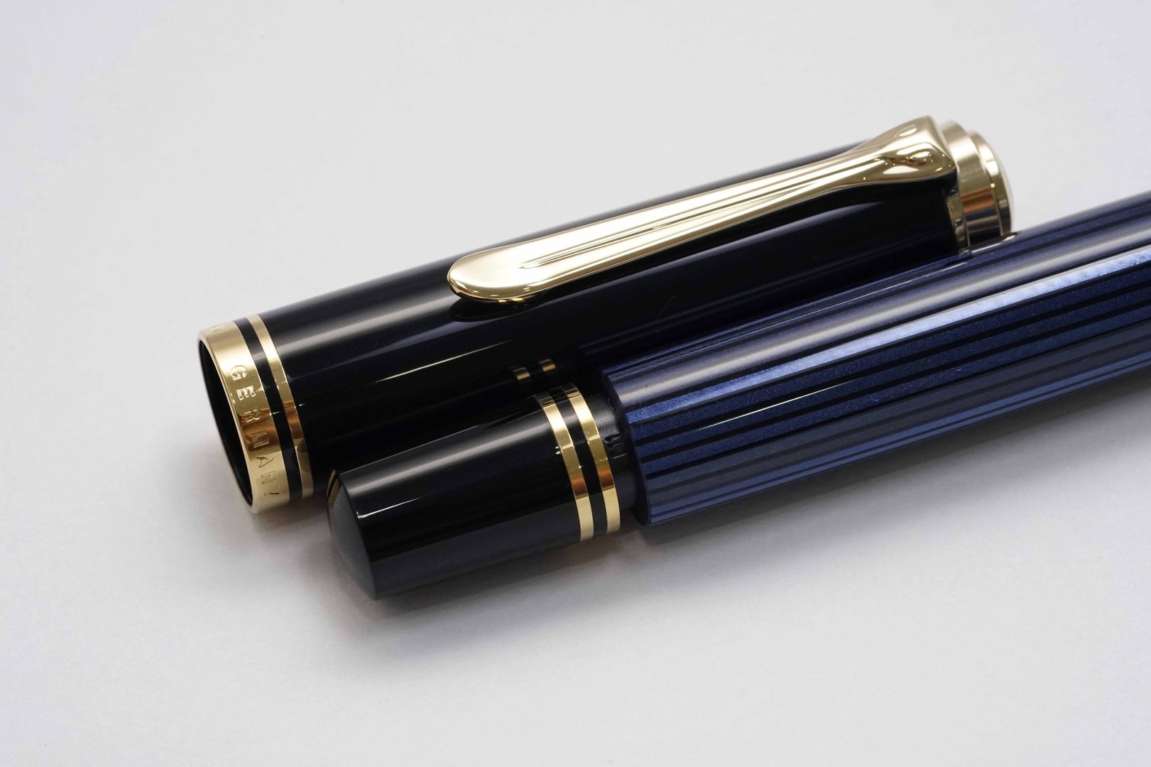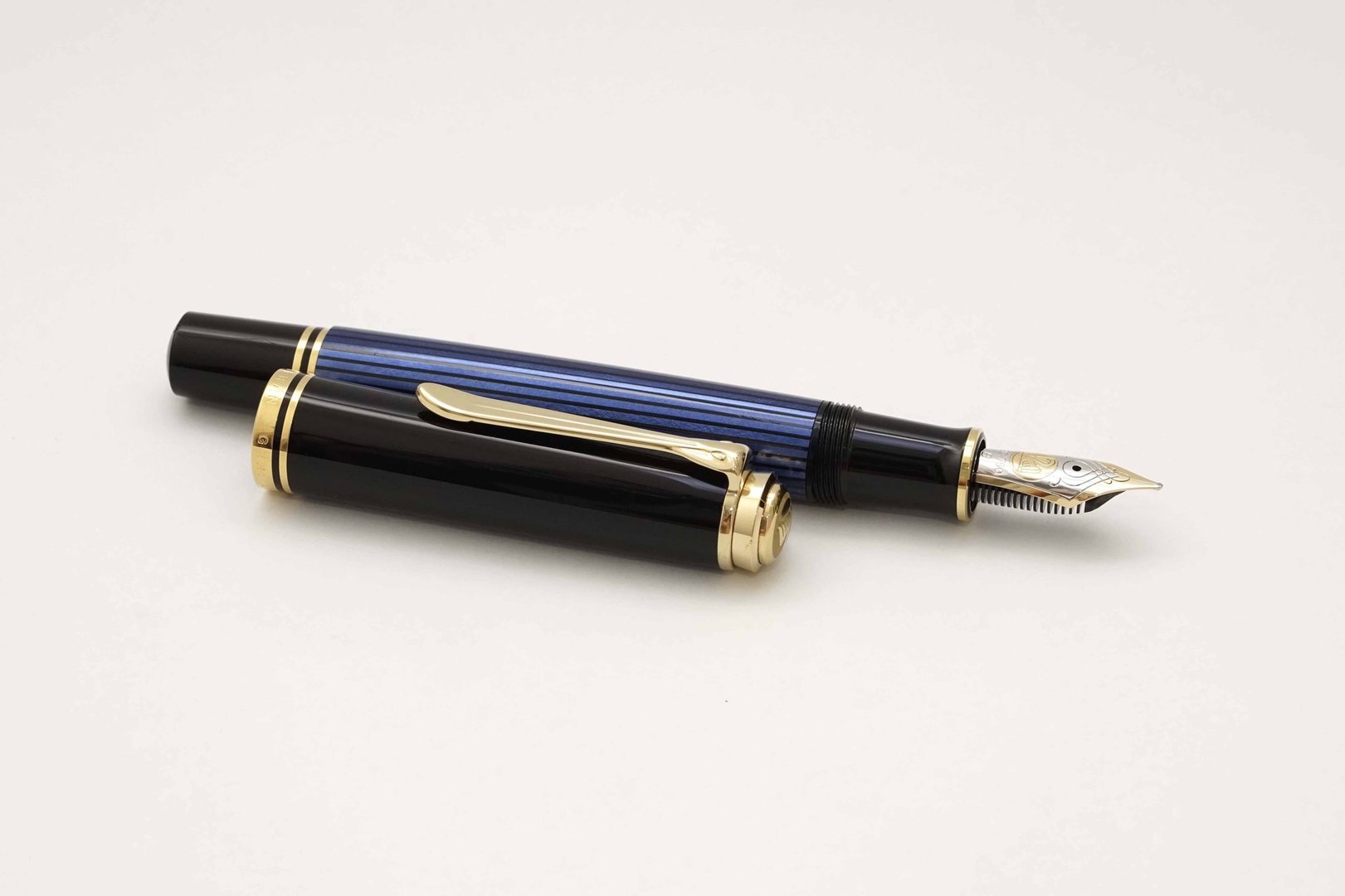 Thuộc phân khúc cao cấp của hãng Pelikan, bút máy Pelikan Souveran M800 Blue Stripe ra mắt lần đầu tiên vào năm 1995 và là phiên bản unisex có màu sắc khá nổi bật. Bút có kích thước tiêu chuẩn và trọng lượng nhẹ nên phù hợp với mọi người dùng. Nắp bút đậy kiểu ren vặn, được làm từ chất liệu nhựa cao cấp màu đen bóng, vòng ring nắp có khắc chữ Pelikan Souveran, đỉnh nắp trang trí logo kim loại khắc hình chim bồ nông. Thanh cài bằng kim loại mạ vàng và gia công tạo hình gương mặt bồ nông đặc trưng. Thân bút có chiều dài phù hợp, phần nhựa thân bút làm từ hỗn hợp nhựa được pha trộn và xử lý theo công nghệ riêng của hãng để tạo các vân sọc màu xanh óng ánh và đều nhau, có thể quan sát được lượng mực bên trong. Phần cụm ngòi của Pelikan khá đặc thù vì có thể dễ dàng tháo cả cụm ngòi ra để vệ sinh khi cần, lá ngòi chế tác từ vàng 14K có độ hoàn thiện cao, lưng ngòi trang trí kiểu twotone với nhiều hoa văn và logo bồ nông tinh xảo, ngòi bút nét B nên cho ra nét chữ mạnh mẽ khi ký và viết trên giấy. Bút bơm mực bằng cơ chế “differential piston filling method” được hãng sáng tạo ra vào năm 1928, chỉ cần xoay nhẹ phần đuôi bút là khoang mực trong thân bút sẽ được làm đầy mà không cần phải dùng đến converter và cartridge rời.
