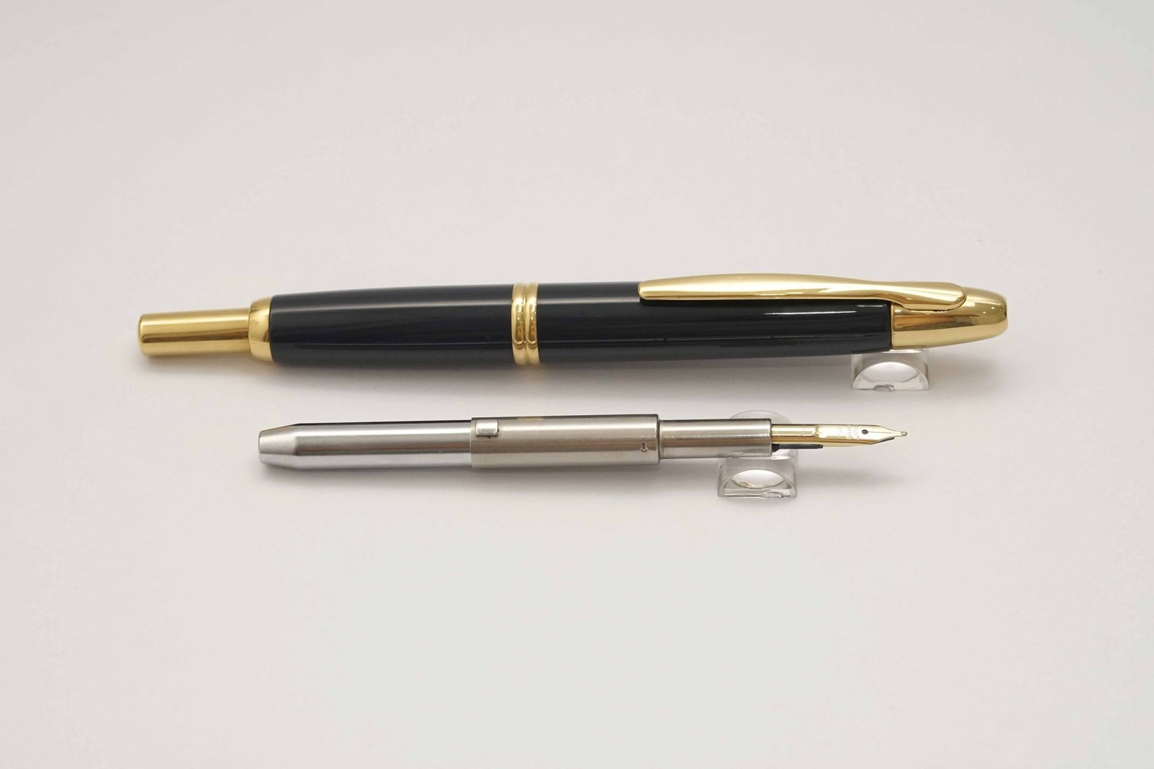 Pilot Capless được xem như là một trong những dòng sản phẩm mang tính sáng tạo độc quyền của hãng Pilot với thiết kế có một không hai và mang tính đột phá trong ngành công nghiệp sản xuất bút. Bút máy Pilot Capless Grey Gold là sự kết hợp tài tình giữa cơ chế hoạt động như bút máy nhưng thao tác sử dụng đơn giản như bút bi. Bút có kích cỡ trung bình nên rất vừa tay khi sử dụng. Phần thân và nắp bút bằng kim loại, bề mặt bên ngoài được hoàn thiện với lớp sơn phủ lacquer màu xám rất đẹp. Cài bút và các chi tiết khác trên thân bút mạ vàng để tạo điểm nhấn. Ngòi bút chế tác từ vàng 14K 585, ngòi bút cỡ M cho ra nét chữ êm mượt khi viết hoặc ký. Bút hoạt động với cơ chế bấm rất êm tay, toàn bộ phần ngòi sẽ ẩn vào trong khi ấn nhả đuôi bút, việc này giúp hạn chế tình trạng mực bị khô hoặc bay hơi sau khi sử dụng, bút đi kèm ống mực Pilot loại tiêu chuẩn.