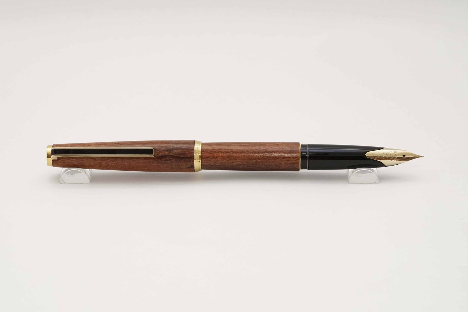 Pilot Elite 95S Pocket Burgundy & Satin Rose Gold là phiên bản bút máy nâng cấp của dòng Elite S 1974. Ký hiệu S là viết tắt của từ “Short” – thể hiện sự gọn gàng, nhỏ nhắn trong thiết kế của dòng Elite Pocket. Bút có dáng thon tròn như một chiếc pocket pen để bỏ gọn vào túi hay cài lên áo mà không sợ bị quá dài. Bút có trọng tâm đặt vào phần nắp khá dài nên thân dưới bút vừa đủ lắp ống mực và phần section có chiều dài tương đương nắp. Nắp bút bằng hợp kim nhôm phối màu satin nhẹ nhàng và đậy rất êm tay, viền nắp có chữ Elite cách điệu. Cài bút bằng kim loại mạ vàng hồng (rose gold), đuôi cài tramg trí chữ Pilot dập chìm rất chi tiết. Thân bút và cụm section được phối nhựa cao cấp màu đỏ burgundy bắt mắt. Ngòi bút chế tác từ vàng 14K, lưng ngòi có khắc ký hiệu Pilot 14K 585 Japan P821, ngòi bút cỡ F cho ra nét chữ khá mảnh khi viết. Bút sử dụng ống mực Pilot loại tiêu chuẩn. Ngoài ra bút đi kèm hộp gift set cao cấp có bao da màu xanh navy rất đẹp.