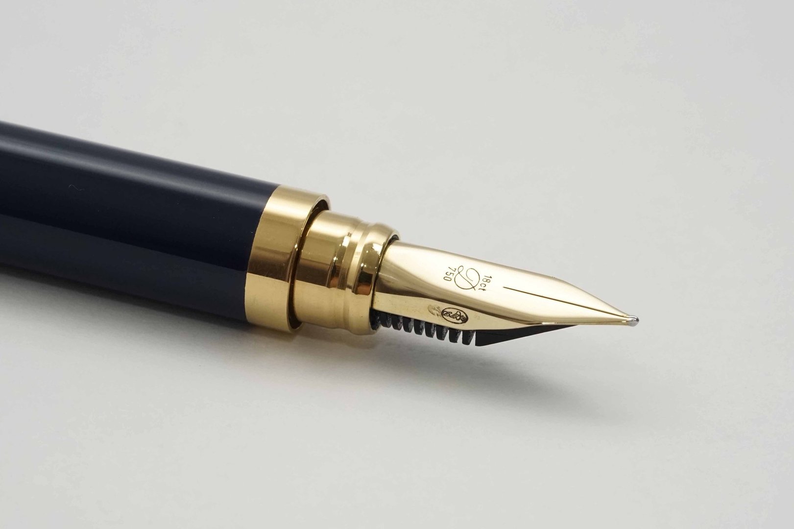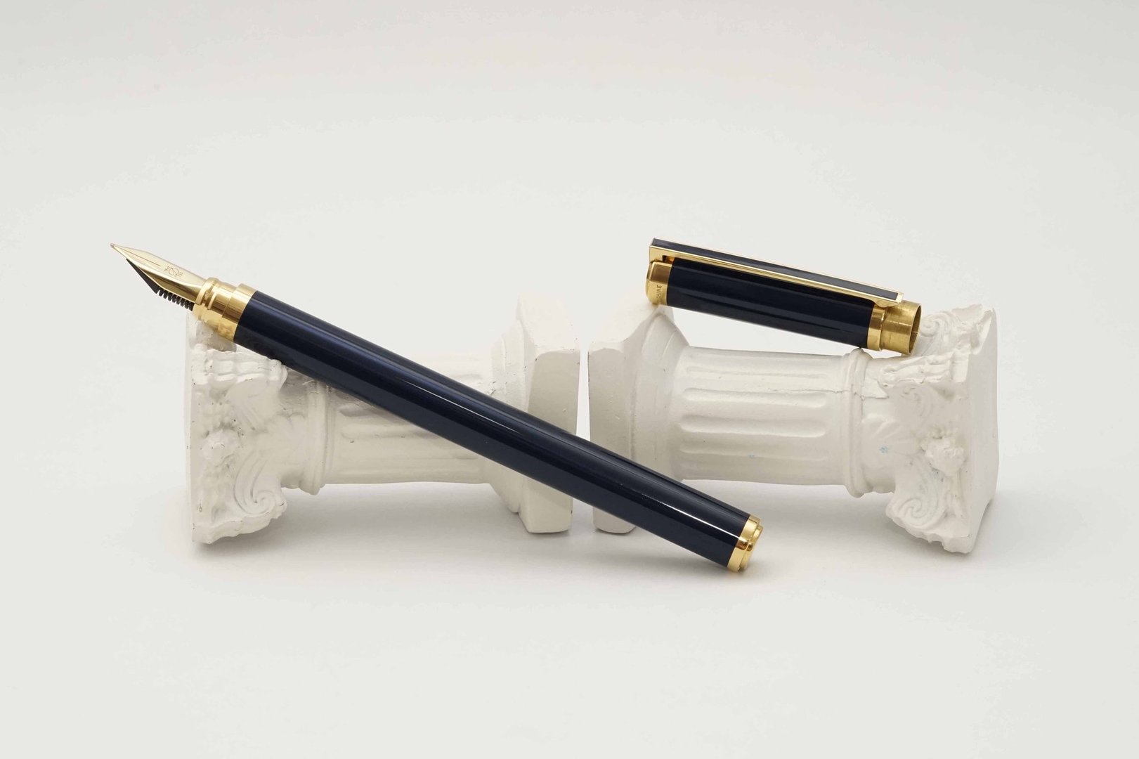 S.T. Dupont Gatsby Dark Blue Lacquer De Chine là model bút máy cổ điển ra mắt từ những năm 1970s với thiết kế hình dáng trụ tròn vát bằng hai đầu. Bút có kiểu dáng thon gọn với thân và nắp bút được gia công từ chất liệu chủ đạo là hợp kim đồng, vỏ ngoài được hoàn thiện với lớp sơn phủ lacquer màu xanh đậm rất đẹp và có chiều sâu. Nắp bút đậy khít và chắc tay, vòng cap band viền nắp có khắc dòng chữ S.T. Dupont Lacque De Chine Paris và dấu hallmark nhỏ. Thanh cài bằng kim loại mạ vàng có kiểu dáng góc cạnh, lưng cài cũng được trang trí sọc men màu xanh đậm, dãy series bên hông cài được khắc chi tiết. Thân bút có chiều dài hợp lý tạo cảm giác thoải mái khi cầm trong tay. Ngòi bút gia công từ vàng 18CT 750, lưng ngòi có khắc logo Dupont và dấu hallmark nhỏ bên hông, ngòi bút cỡ F cho ra nét chữ trơn mượt khi viết. Bút bơm mực bằng converter Dupont đi kèm.