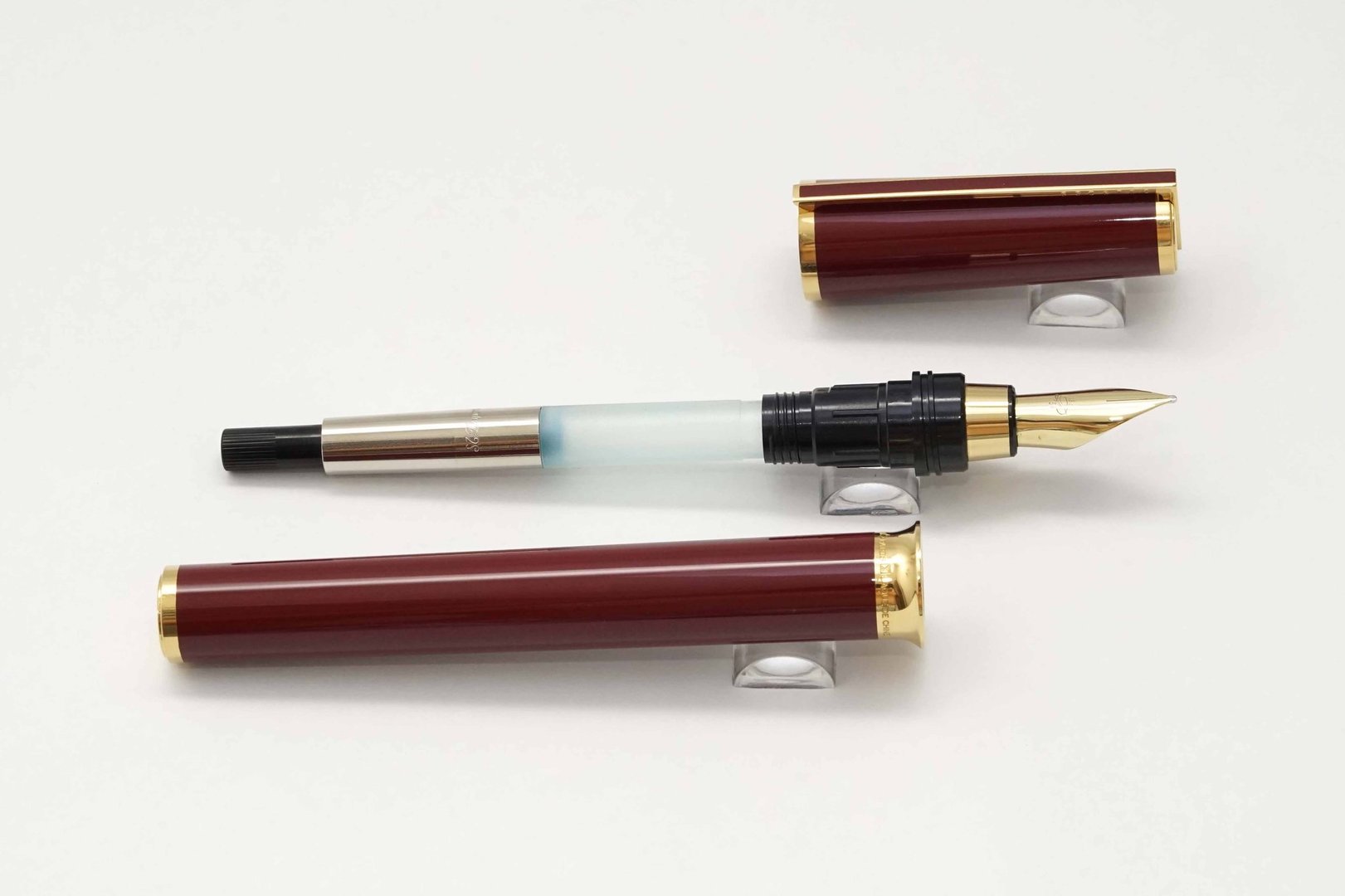 Phiên bản Pelikan Classic MK Burgundy thuộc series Pelikan MK ra mắt thị trường năm 1965, bút có thiết kế khá đẹp và kiểu dáng unisex nên phù hợp cho mọi đối tượng người dùng. Thân và nắp bút gia công từ hỗn hợp nhựa resin cao cấp màu đỏ burgundy bắt mắt. Nắp bút đậy êm và kín hơi, điều này giúp hạn chế tình trạng ngòi không bị khô mực khi không sử dụng trong thời gian dài, vòng ring viền nắp có khắc chữ Pelikan Germany. Cài bút bằng hợp kim mạ vàng tạo dáng góc cạnh tinh tế, đầu cài có đóng logo Pelikan dập chìm khá chi tiết. Thân bút có chiều dài hợp lý và cân đối tạo cảm giác thoải mái khi cầm. Chỗ tiếp xúc giữa section và thân bút là cụm ren màu xanh trong suốt giúp tạo điểm nhấn tổng thể. Ngòi bút chế tác từ vàng 14K dạng bán hở, lưng ngòi có khắc ký hiệu 585, ngòi bút cỡ F cho ra nét chữ êm mượt khi viết. Bút bơm mực bằng converter Pelikan loại xoay đi kèm.