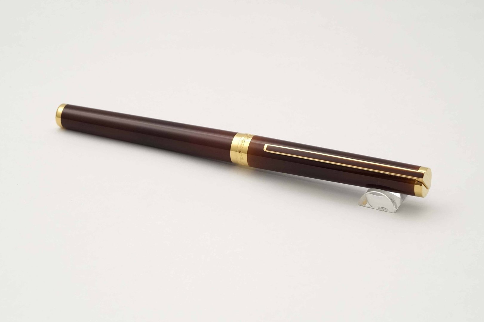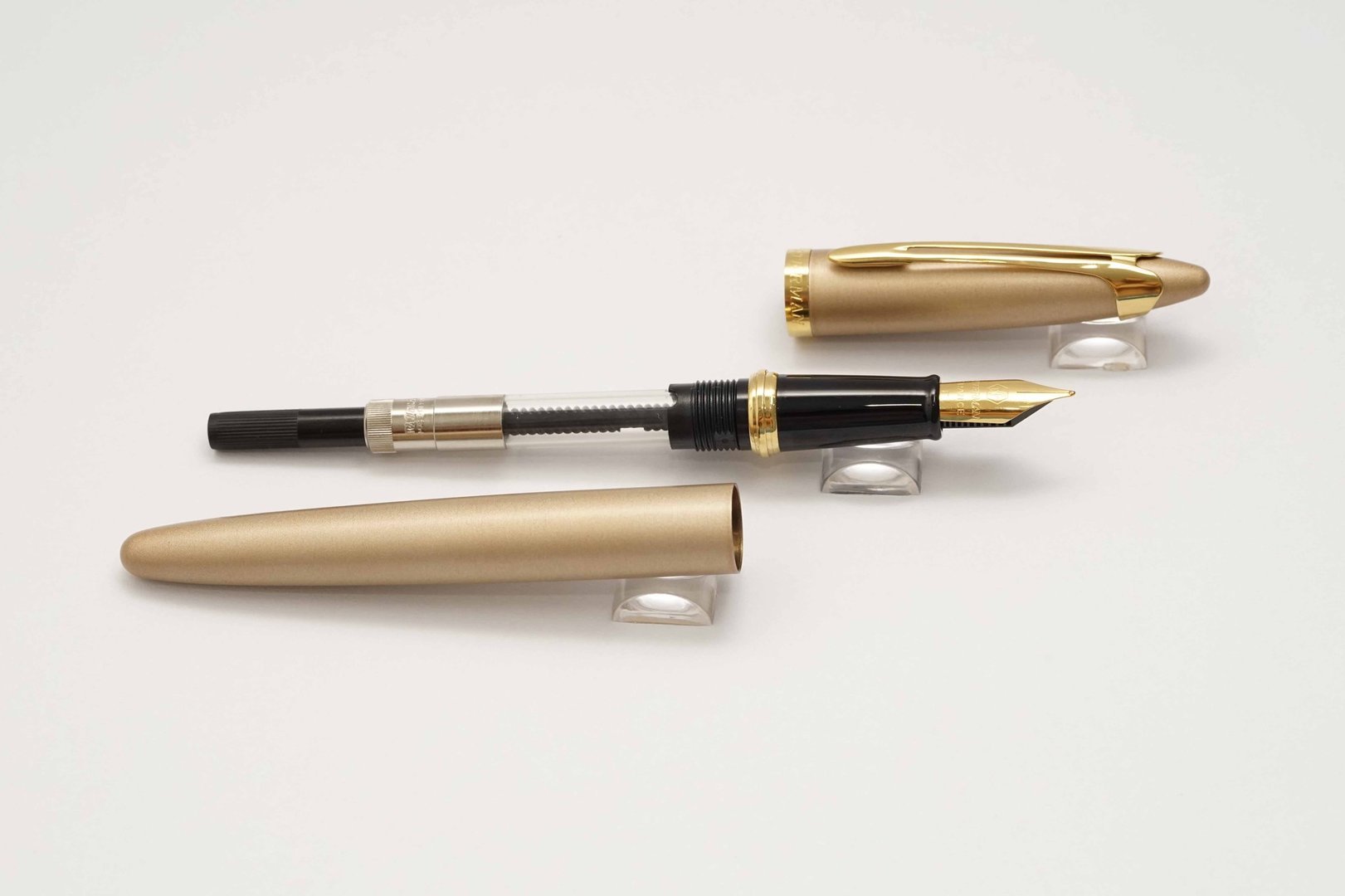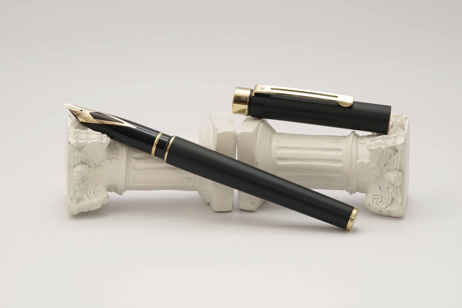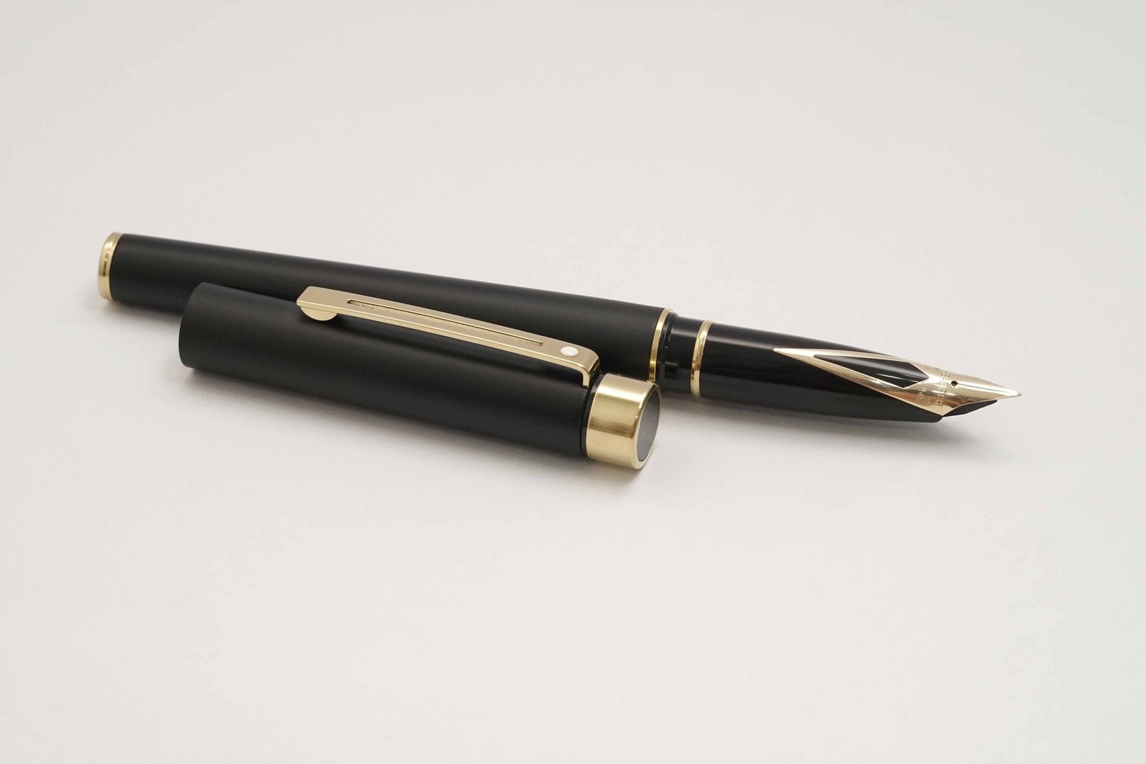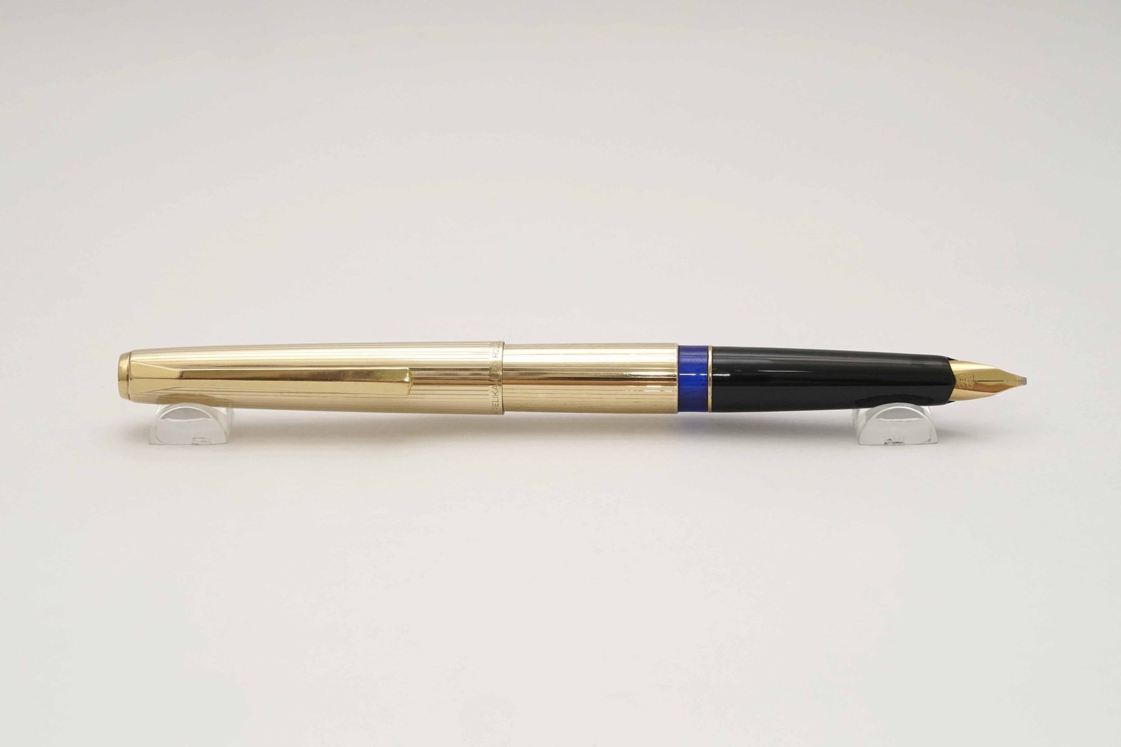 Bút máy Sheaffer Targa 1020 Imperial Brass là model khá hiếm được tung ra thị trường vào năm 1995, đây là biến thể ít gặp và khá cao cấp của series Targa đương đại thời kỳ này. Sheaffer Targa 1020 Imperial Brass có độ hoàn thiện cao về mặt thẩm mỹ với kích thước tiêu chuẩn cùng trọng lượng cân bằng hoàn hảo nên phù hợp với mọi người dùng. Thân và nắp bút bằng hợp kim đồng thau (Imperial Brass) rất dày và tạo ấn tượng sang trọng. Nắp bút đậy rất êm tay, viền nắp có khắc dòng chữ Sheaffer USA Imperial Brass. Cài bút thiết kế cứng cáp và liên kết chắc chắn nắp bút, đầu cài có trang trí chấm “white dot” đặc trưng của Sheaffer. Phần cụm ngòi là điểm nhấn cho toàn bộ cây bút với lá ngòi được khảm liền lạc với section tạo thành một khối liền mạch. Ngòi bút chế tác từ vàng 14K, lưng ngòi có khắc ký hiệu Sheaffer 14K 585 USA, ngòi bút cỡ F cho ra nét chữ êm mượt khi viết hoặc ký. Bút bơm mực bằng piston đi kèm.