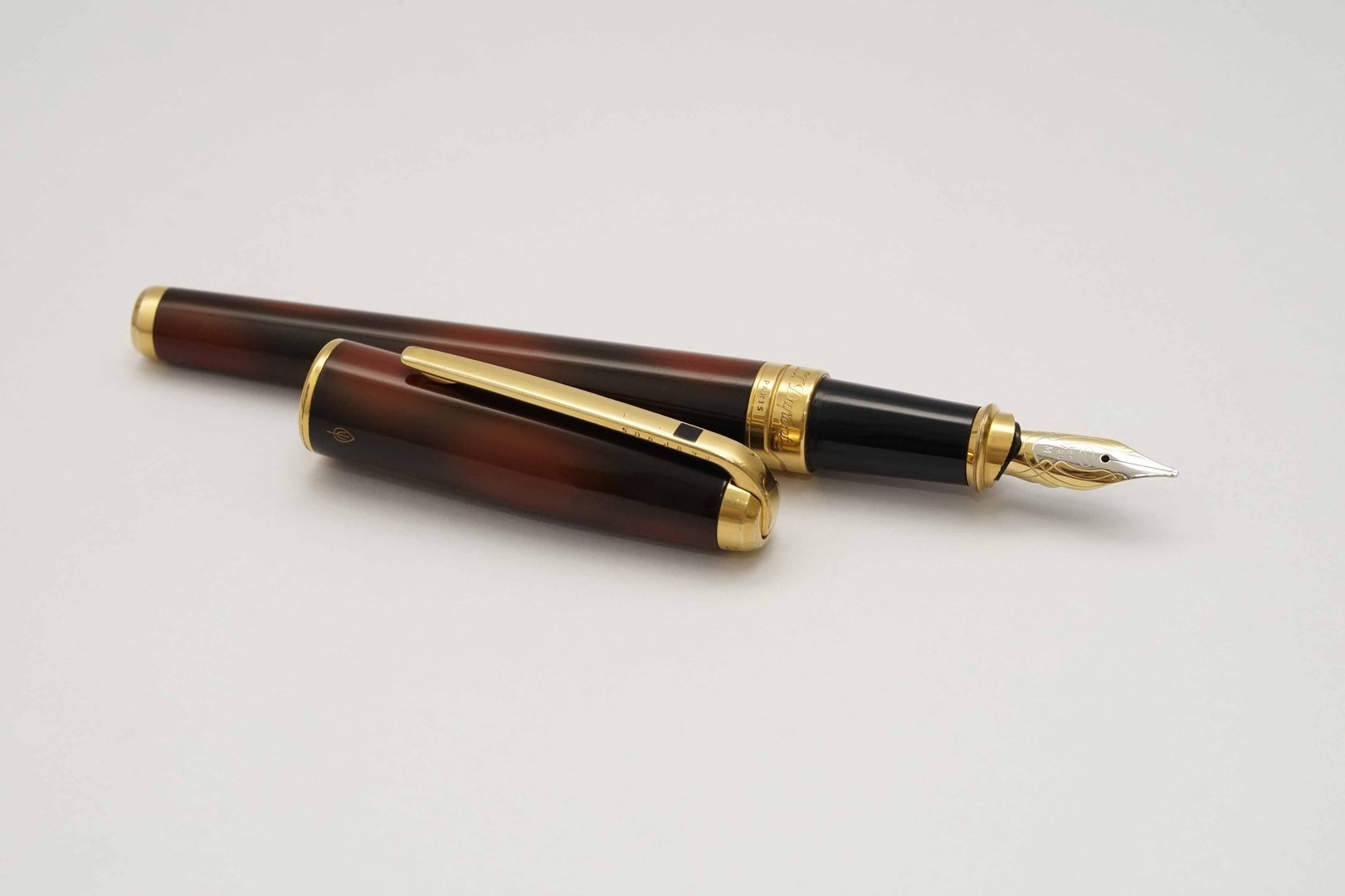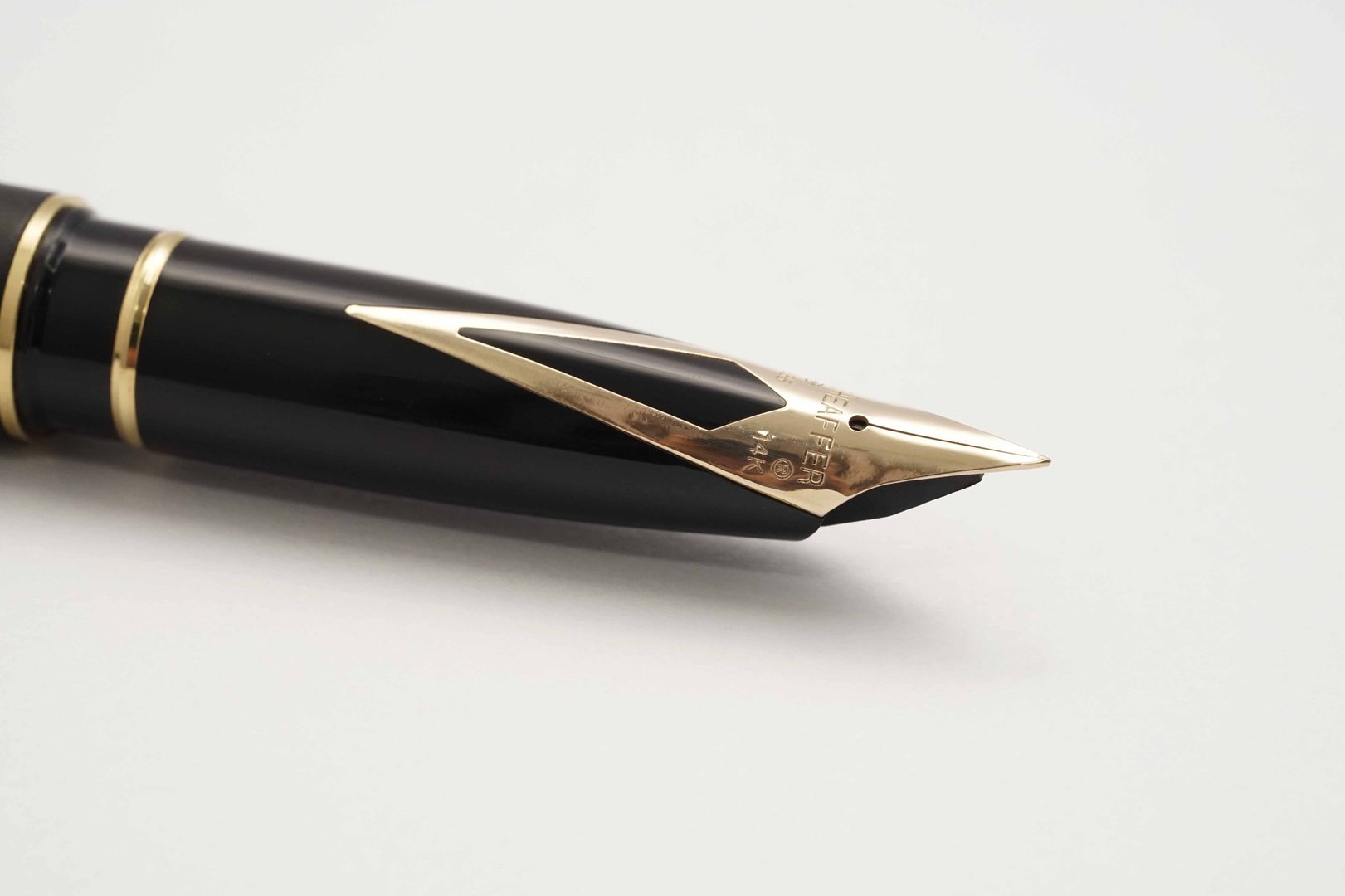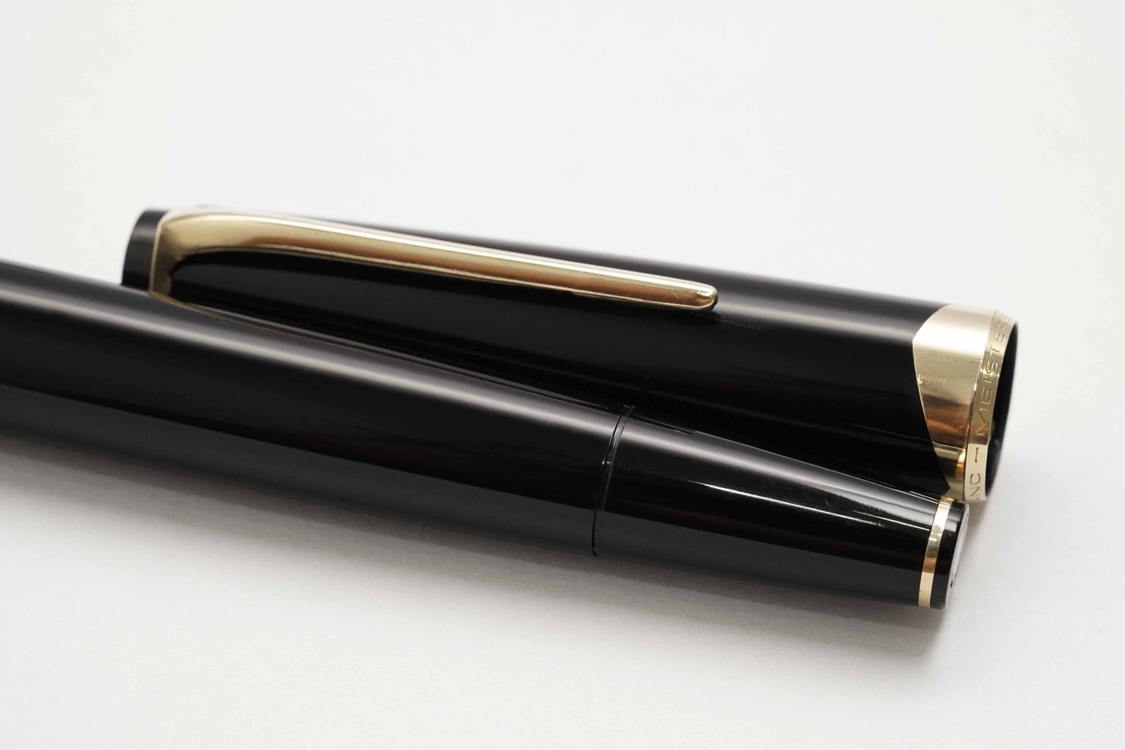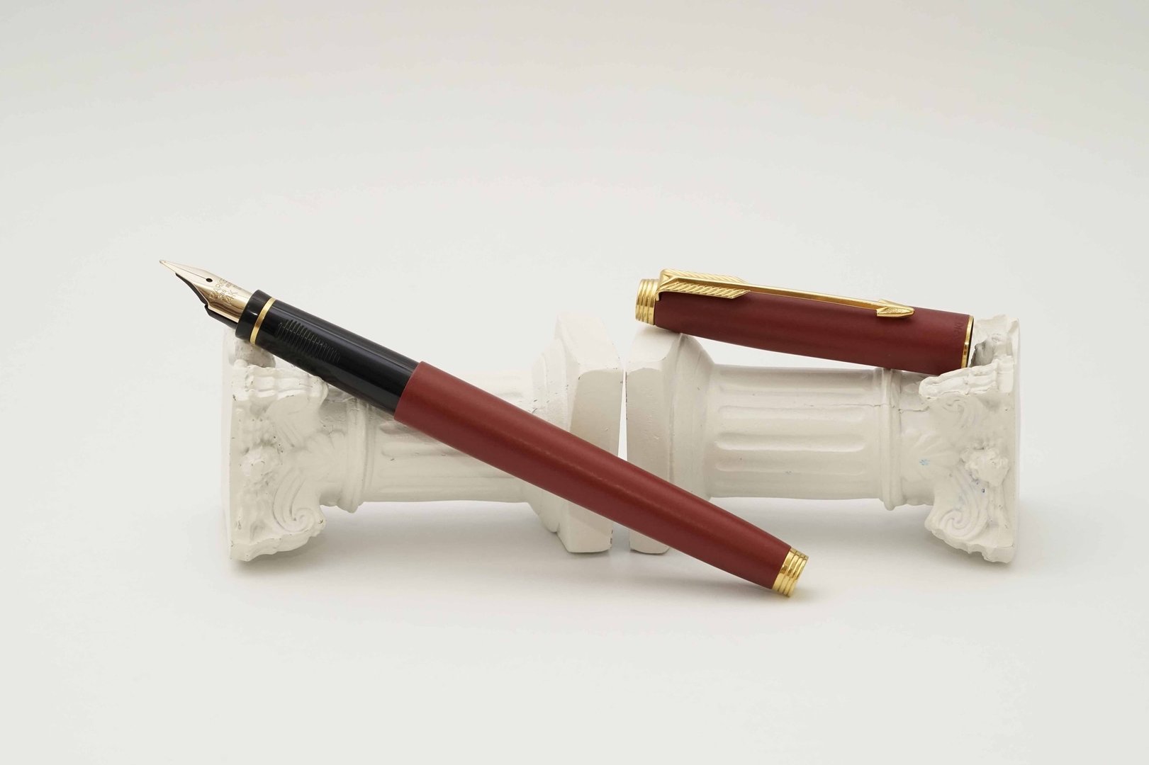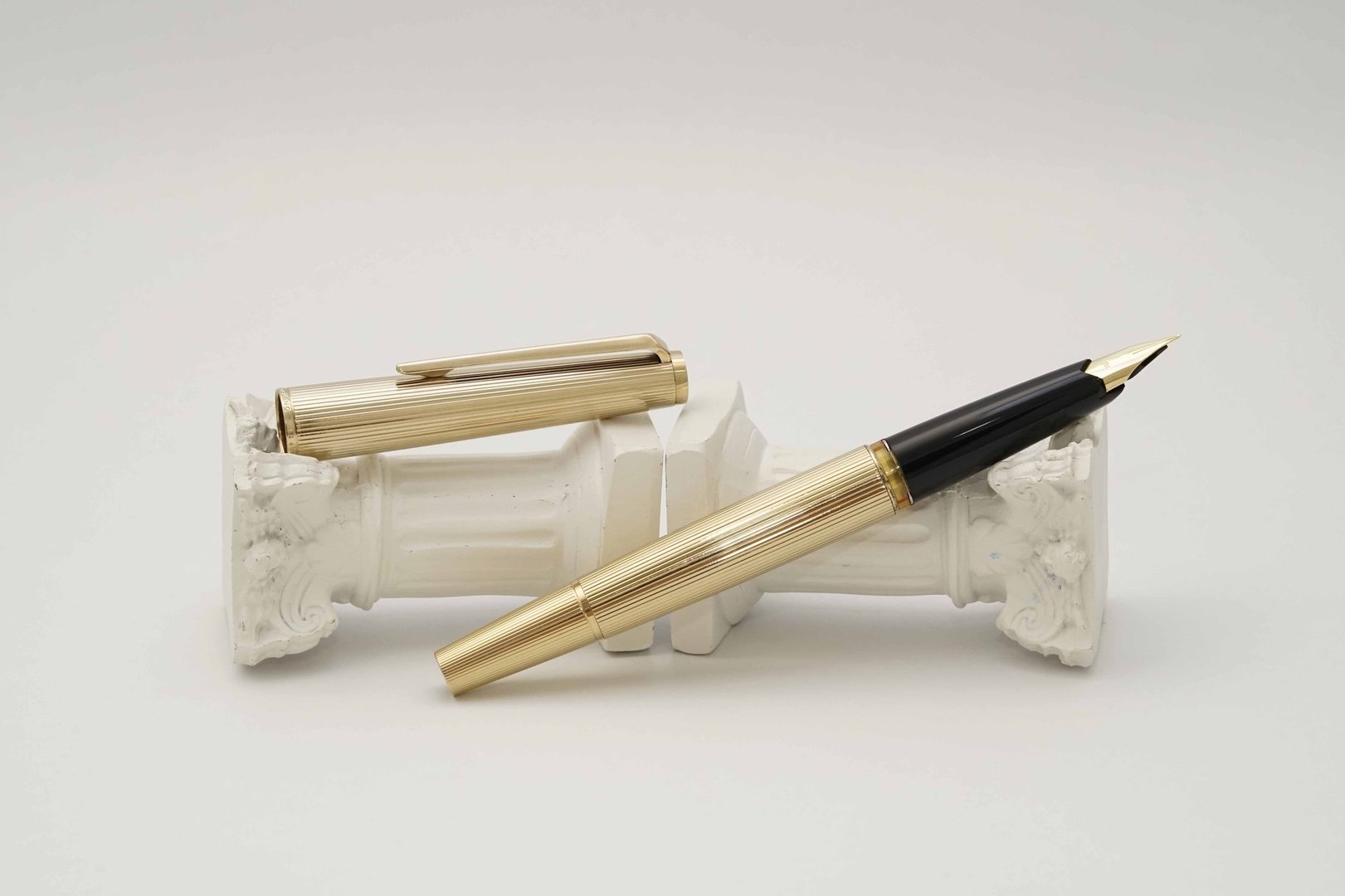 Bút máy Sheaffer Targa 1020 Imperial Brass là model khá hiếm được tung ra thị trường vào năm 1995, đây là biến thể ít gặp và khá cao cấp của series Targa đương đại thời kỳ này. Sheaffer Targa 1020 Imperial Brass có độ hoàn thiện cao về mặt thẩm mỹ với kích thước tiêu chuẩn cùng trọng lượng cân bằng hoàn hảo nên phù hợp với mọi người dùng. Thân và nắp bút bằng hợp kim đồng thau (Imperial Brass) rất dày và tạo ấn tượng sang trọng. Nắp bút đậy rất êm tay, viền nắp có khắc dòng chữ Sheaffer USA Imperial Brass. Cài bút thiết kế cứng cáp và liên kết chắc chắn nắp bút, đầu cài có trang trí chấm “white dot” đặc trưng của Sheaffer. Phần cụm ngòi là điểm nhấn cho toàn bộ cây bút với lá ngòi được khảm liền lạc với section tạo thành một khối liền mạch. Ngòi bút chế tác từ vàng 14K, lưng ngòi có khắc ký hiệu Sheaffer 14K 585 USA, ngòi bút cỡ F cho ra nét chữ êm mượt khi viết hoặc ký. Bút bơm mực bằng piston đi kèm.