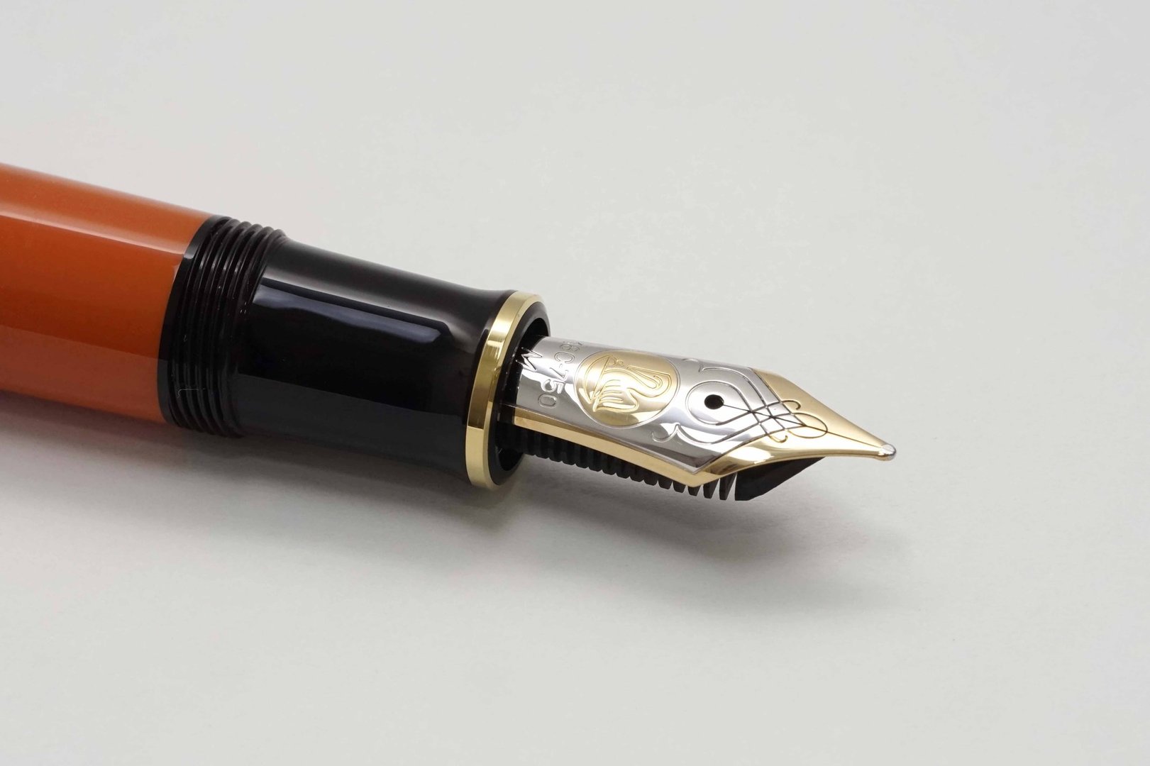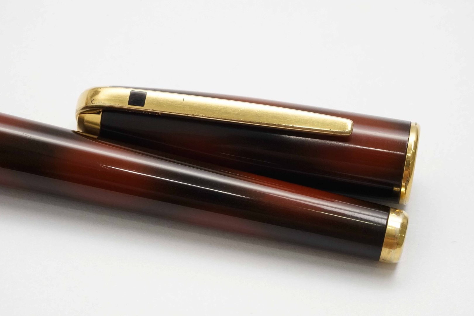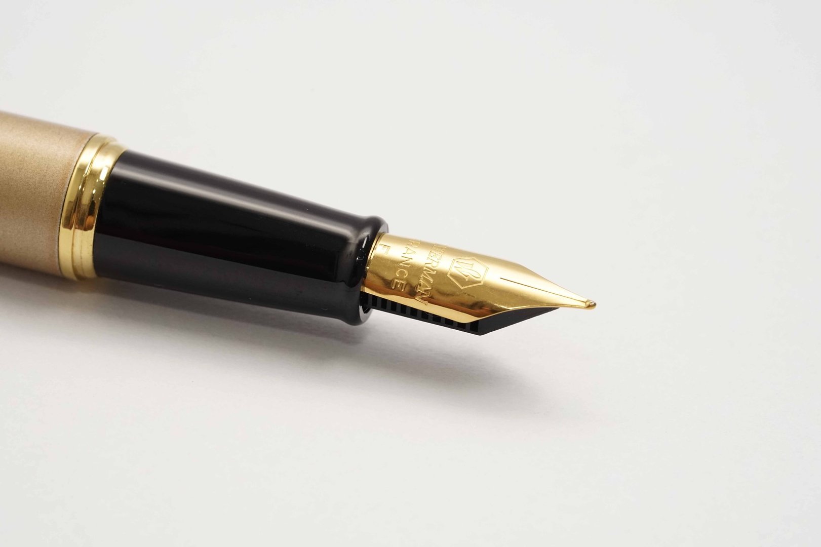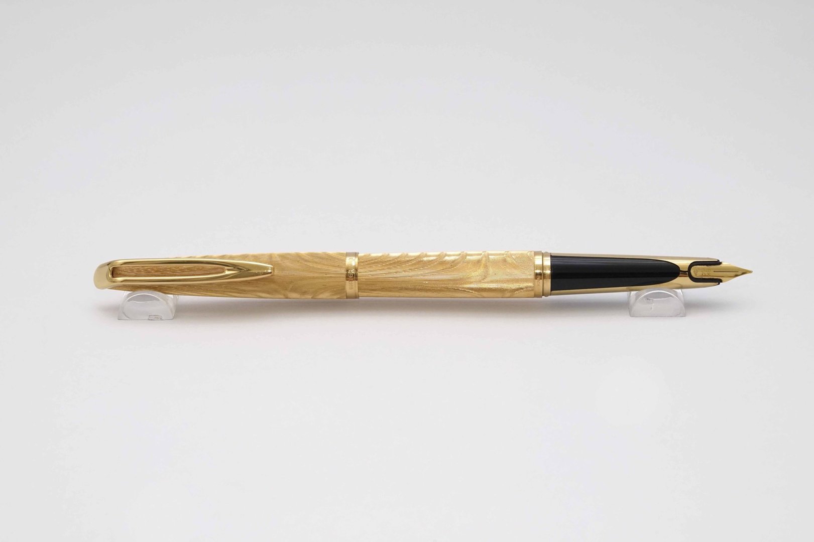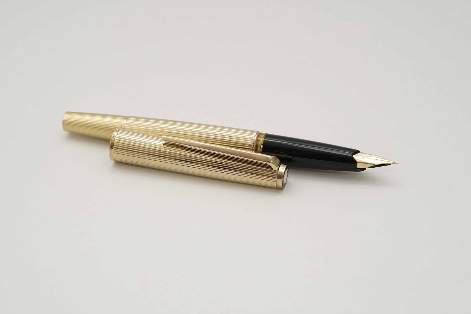 Bút máy Sheaffer Targa 1020 Imperial Brass là model khá hiếm được tung ra thị trường vào năm 1995, đây là biến thể ít gặp và khá cao cấp của series Targa đương đại thời kỳ này. Sheaffer Targa 1020 Imperial Brass có độ hoàn thiện cao về mặt thẩm mỹ với kích thước tiêu chuẩn cùng trọng lượng cân bằng hoàn hảo nên phù hợp với mọi người dùng. Thân và nắp bút bằng hợp kim đồng thau (Imperial Brass) rất dày và tạo ấn tượng sang trọng. Nắp bút đậy rất êm tay, viền nắp có khắc dòng chữ Sheaffer USA Imperial Brass. Cài bút thiết kế cứng cáp và liên kết chắc chắn nắp bút, đầu cài có trang trí chấm “white dot” đặc trưng của Sheaffer. Phần cụm ngòi là điểm nhấn cho toàn bộ cây bút với lá ngòi được khảm liền lạc với section tạo thành một khối liền mạch. Ngòi bút chế tác từ vàng 14K, lưng ngòi có khắc ký hiệu Sheaffer 14K 585 USA, ngòi bút cỡ F cho ra nét chữ êm mượt khi viết hoặc ký. Bút bơm mực bằng piston đi kèm.