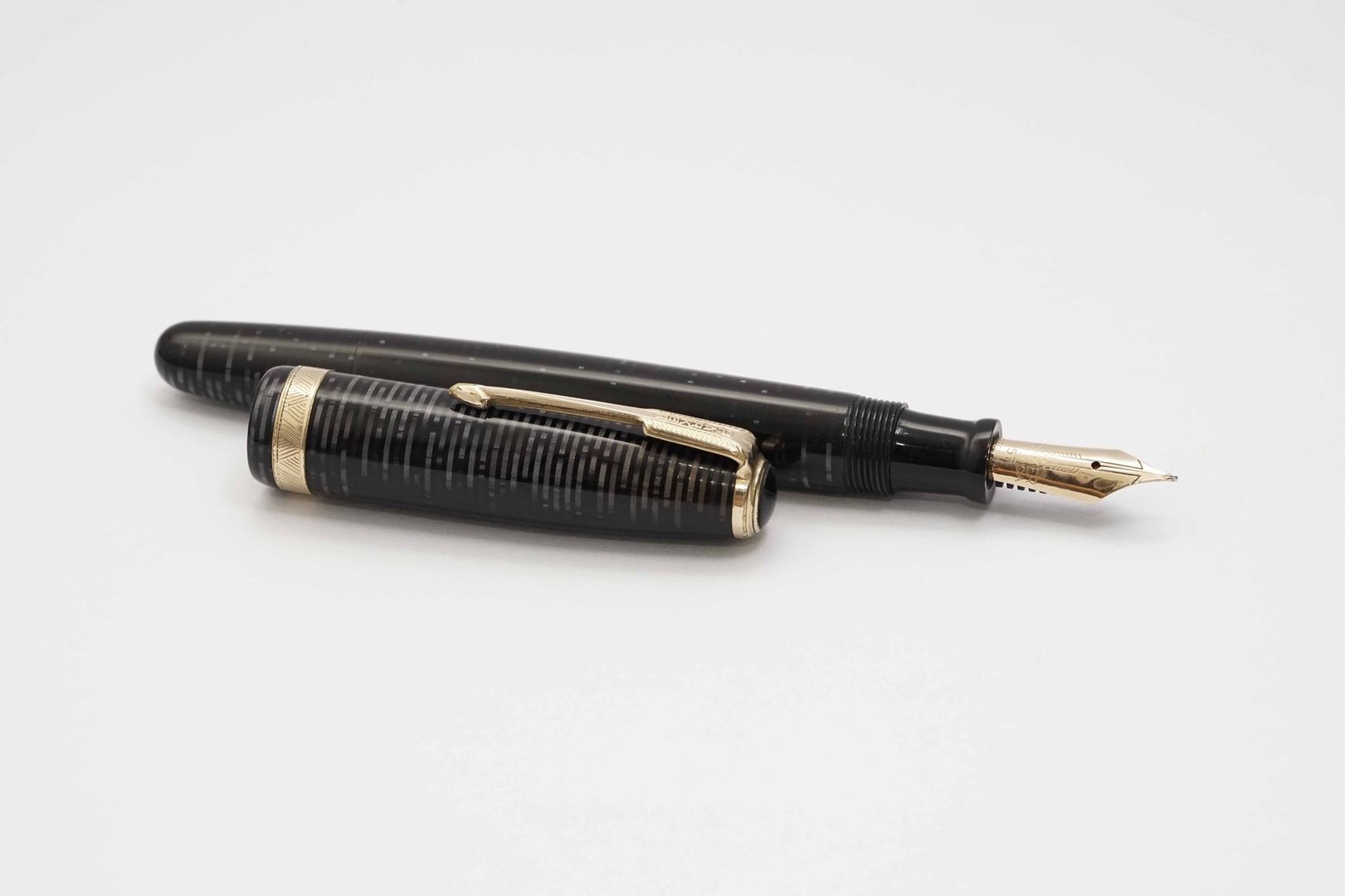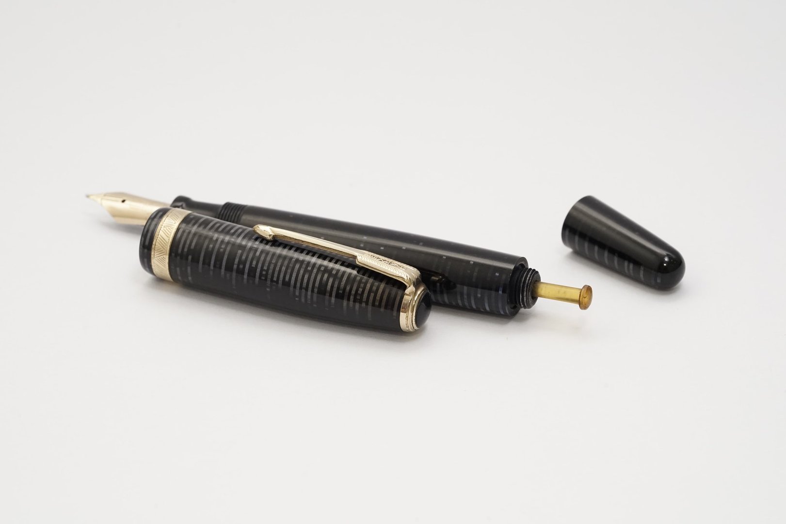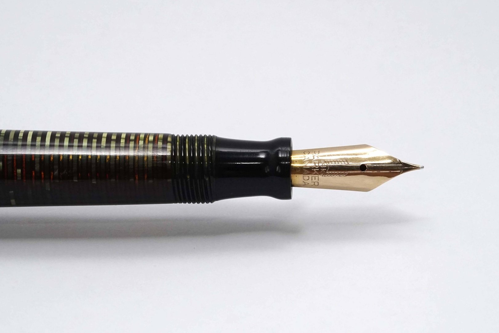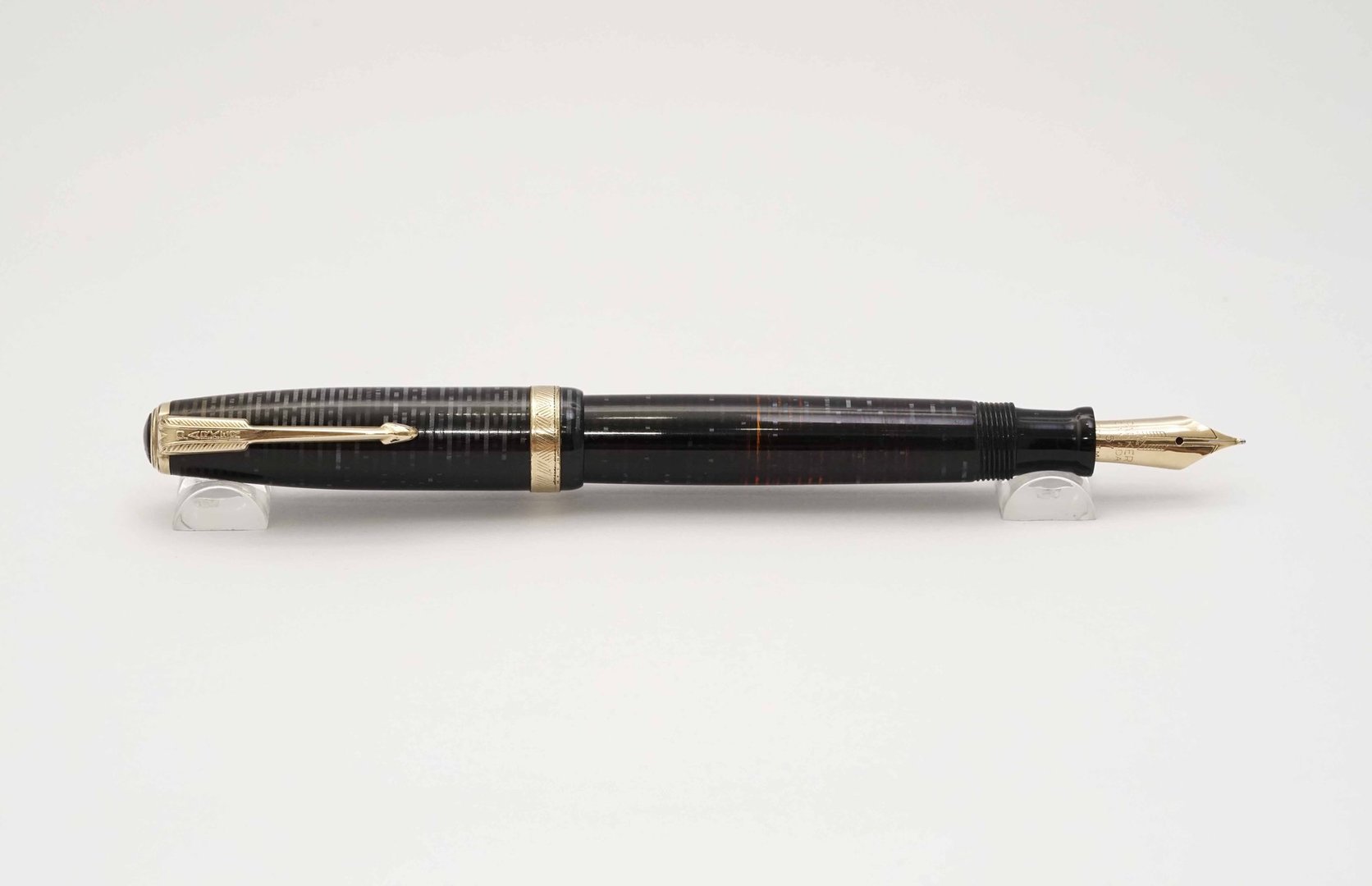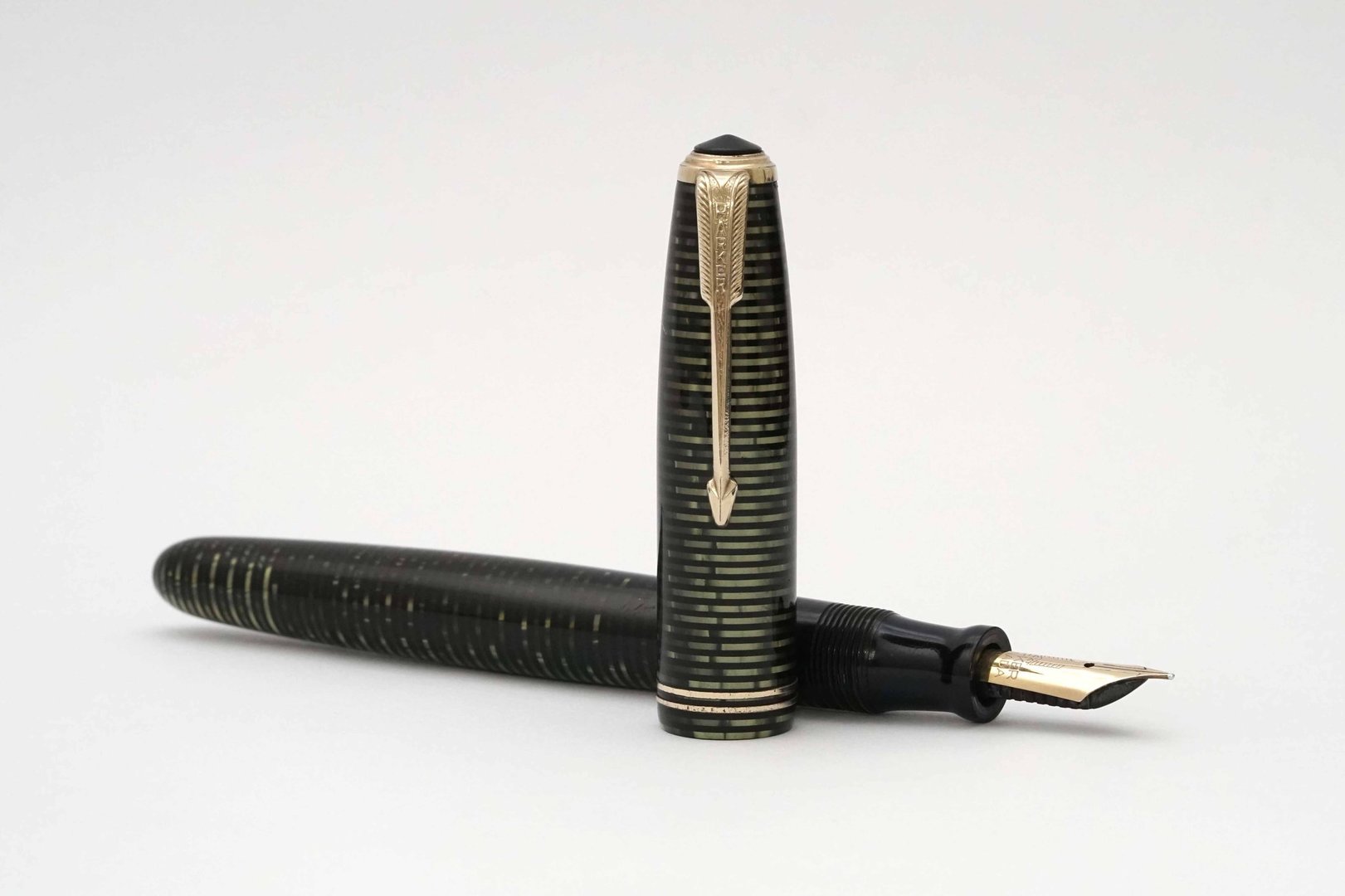 Parker Vacumatic 53 Pearl Green Striped Celluloid thuộc series Vacumatic nổi tiếng giai đoạn những năm 1940s của hãng Parker. Bút có kích thước khá gọn đặc trưng của dòng Parker vintage. Thiết kế của bút đáp ứng được cả yêu cầu về công năng sử dụng lẫn tính thẩm mỹ cao, đây cũng là cây bút tiên phong trong việc sử dụng hỗn hợp nhựa celluloid nhiều lớp để gia công vỏ bút với các vân nhựa màu ngọc trai xanh lá đan xen tạo hiệu ứng thị giác bắt mắt cũng như có thể quan sát lượng mực bên trong. Cài bút bằng hợp kim mạ vàng có hình dáng mũi tên Parker truyền thống rất mộc mạc. Nắp bút đậy kiểu ren vặn, đỉnh nắp có trang trí hạt jewel bằng nhựa màu đen, vòng cap band viền nắp bằng hợp kim mạ vàng. Ngòi bút chế tác từ vàng 14K có độ hoàn thiện cao, lưng ngòi có hoạ tiết mũi tên khắc chìm, bên dưới khắc chữ “Parker Canada 53”, ngòi bút cỡ F cho ra nét chữ êm và trơn mượt khi viết. Bút bơm mực bằng cơ chế vacumatic filler, bấm nhả đuôi bút để xả và hút mực.