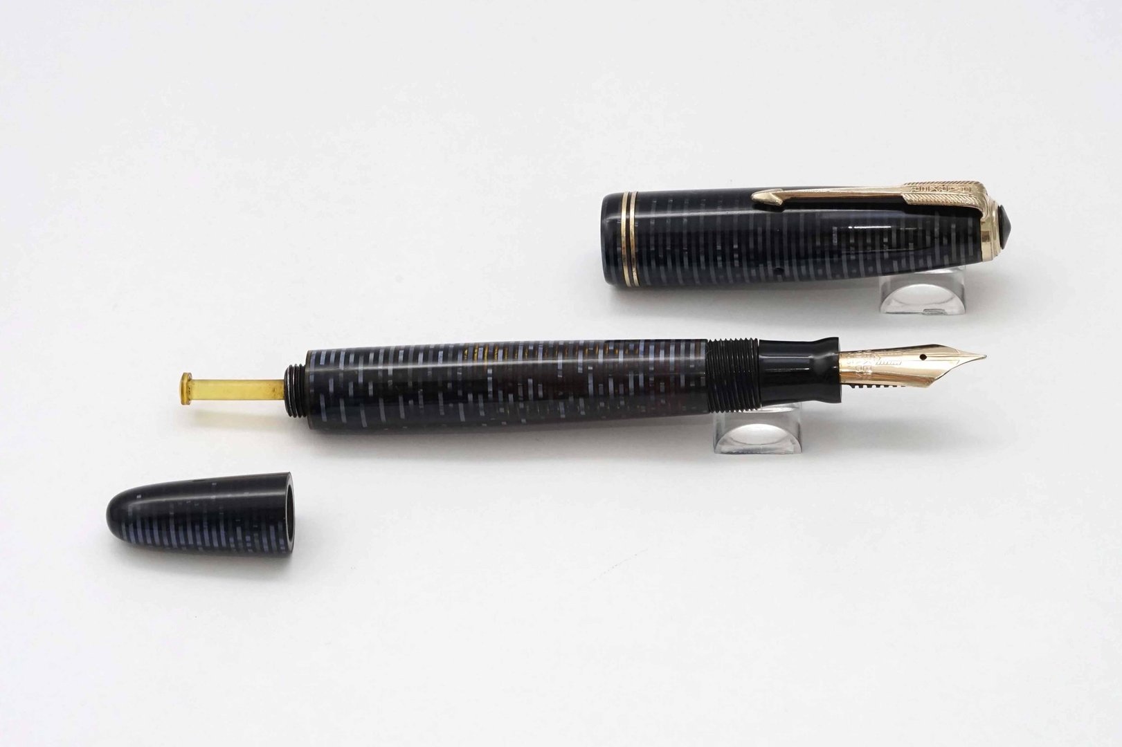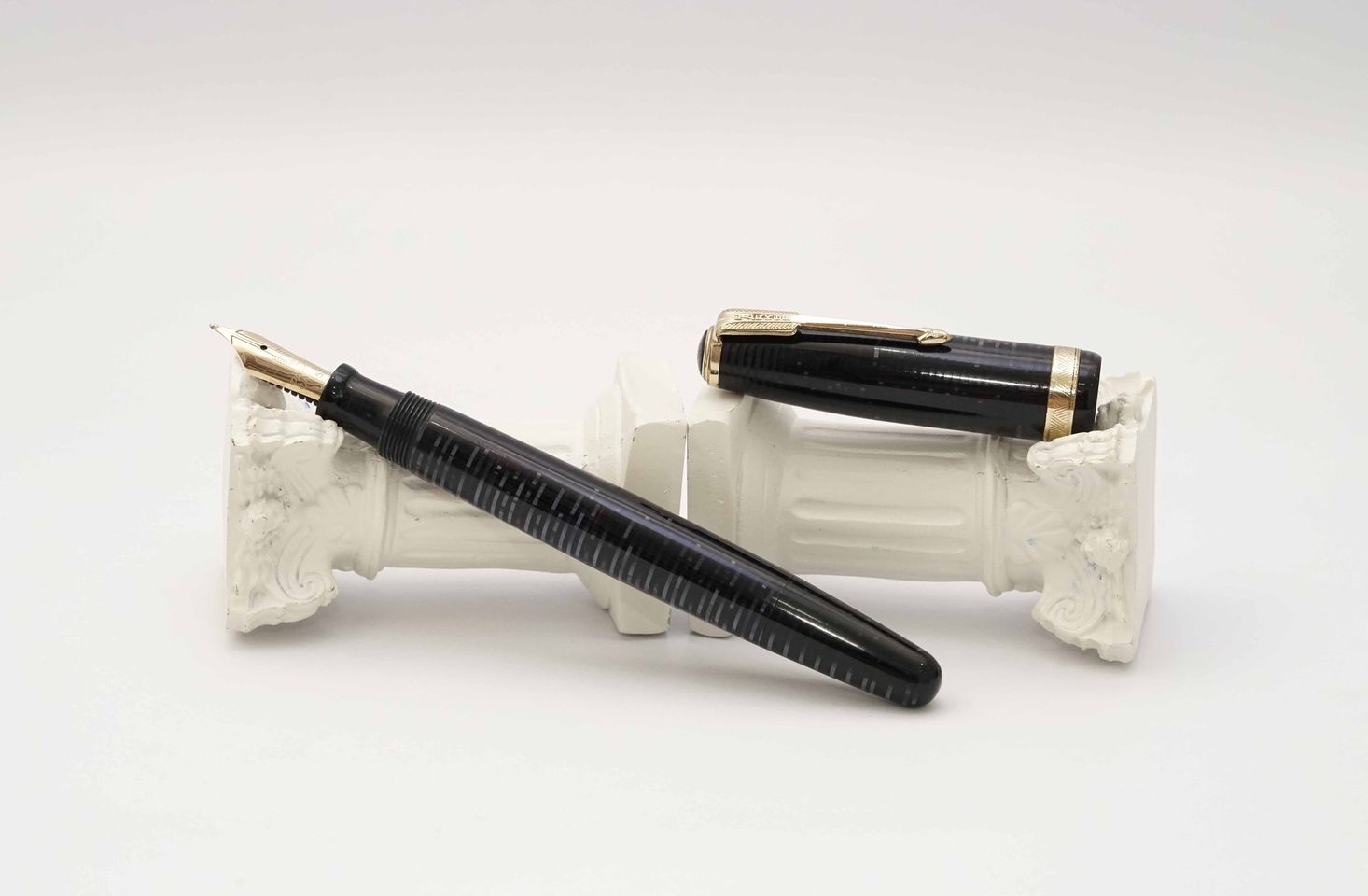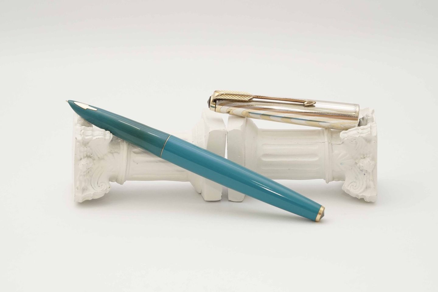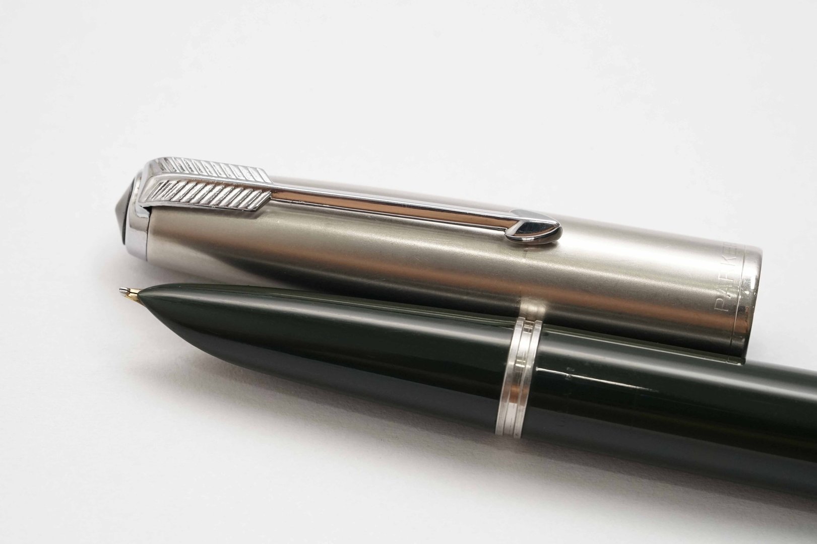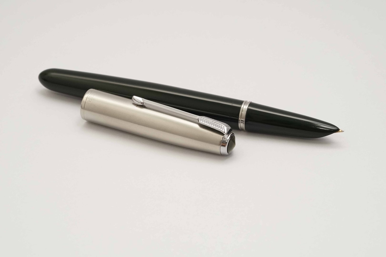 Parker Vacumatic 53 Pearl Green Striped Celluloid thuộc series Vacumatic nổi tiếng giai đoạn những năm 1940s của hãng Parker. Bút có kích thước khá gọn đặc trưng của dòng Parker vintage. Thiết kế của bút đáp ứng được cả yêu cầu về công năng sử dụng lẫn tính thẩm mỹ cao, đây cũng là cây bút tiên phong trong việc sử dụng hỗn hợp nhựa celluloid nhiều lớp để gia công vỏ bút với các vân nhựa màu ngọc trai xanh lá đan xen tạo hiệu ứng thị giác bắt mắt cũng như có thể quan sát lượng mực bên trong. Cài bút bằng hợp kim mạ vàng có hình dáng mũi tên Parker truyền thống rất mộc mạc. Nắp bút đậy kiểu ren vặn, đỉnh nắp có trang trí hạt jewel bằng nhựa màu đen, vòng cap band viền nắp bằng hợp kim mạ vàng. Ngòi bút chế tác từ vàng 14K có độ hoàn thiện cao, lưng ngòi có hoạ tiết mũi tên khắc chìm, bên dưới khắc chữ “Parker Canada 53”, ngòi bút cỡ F cho ra nét chữ êm và trơn mượt khi viết. Bút bơm mực bằng cơ chế vacumatic filler, bấm nhả đuôi bút để xả và hút mực.