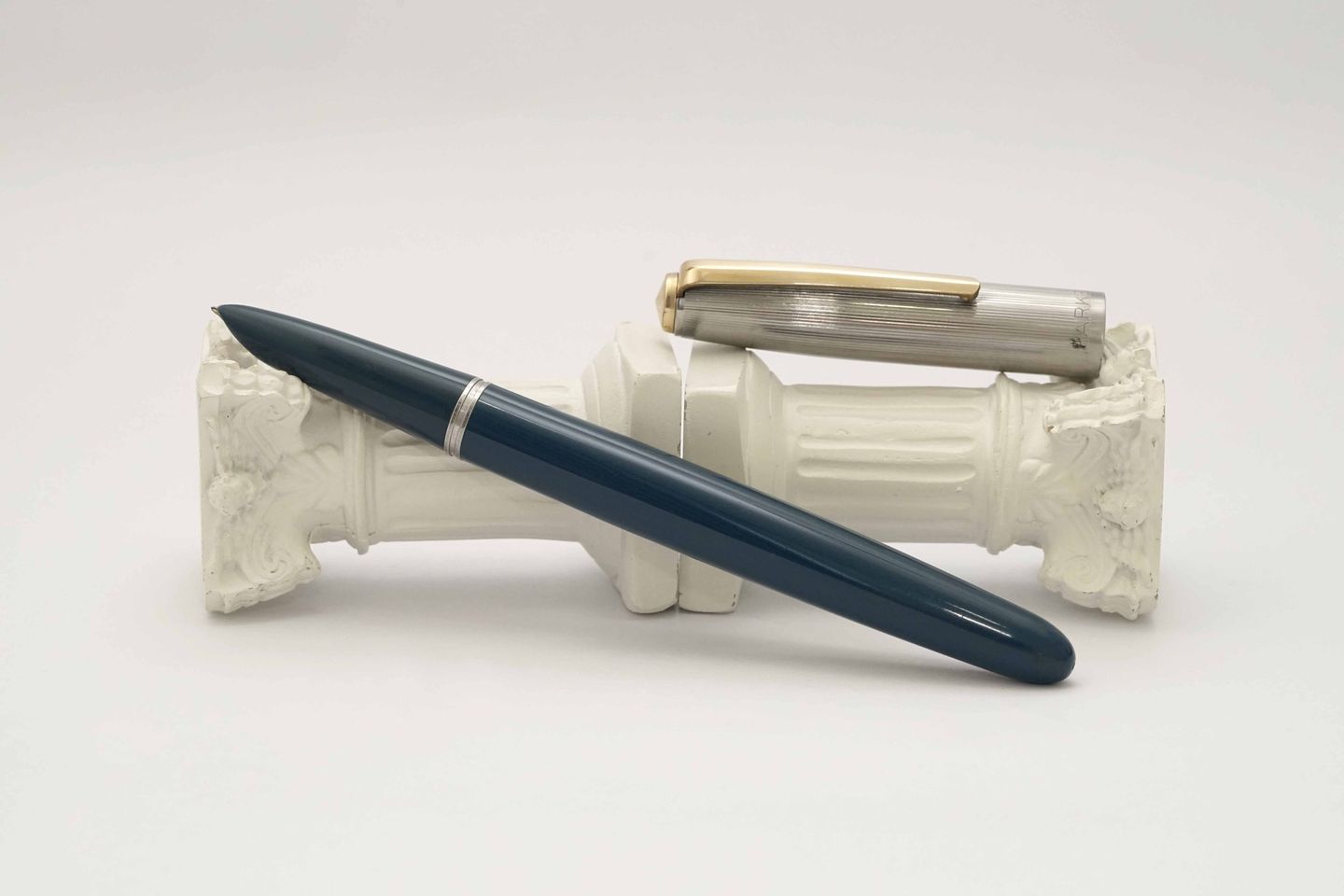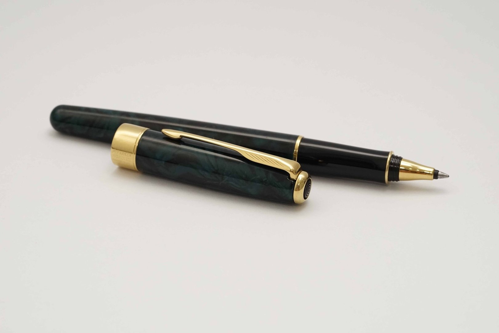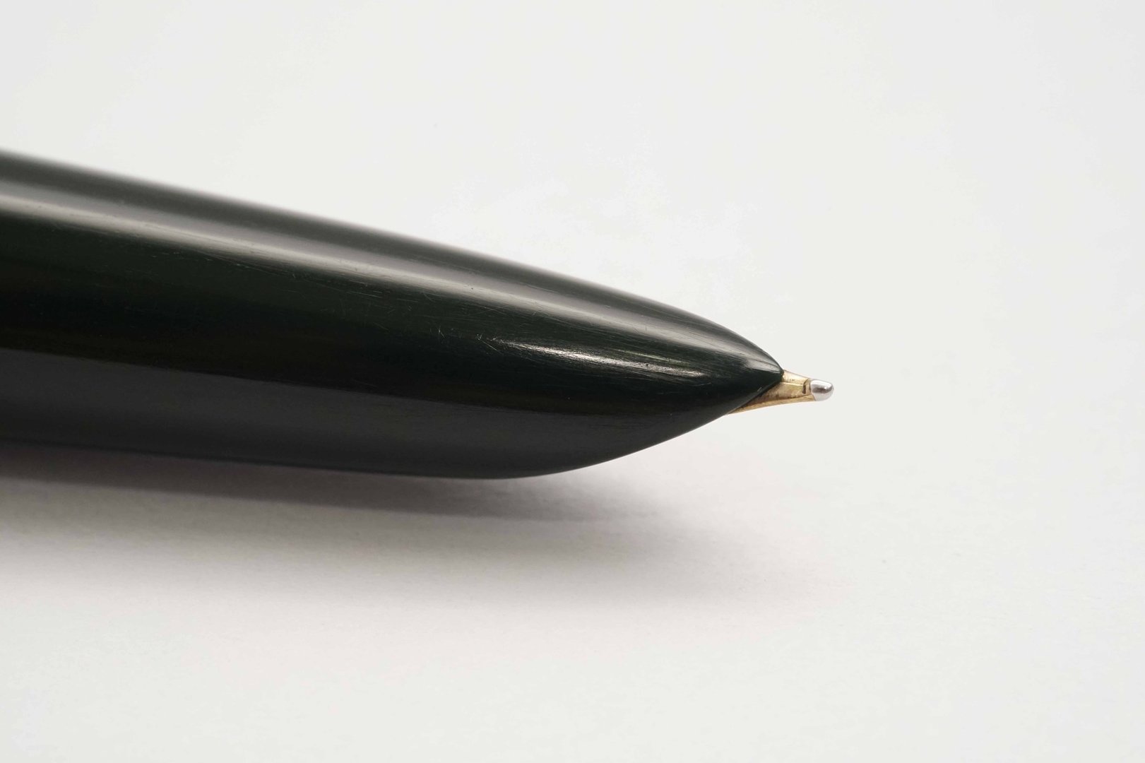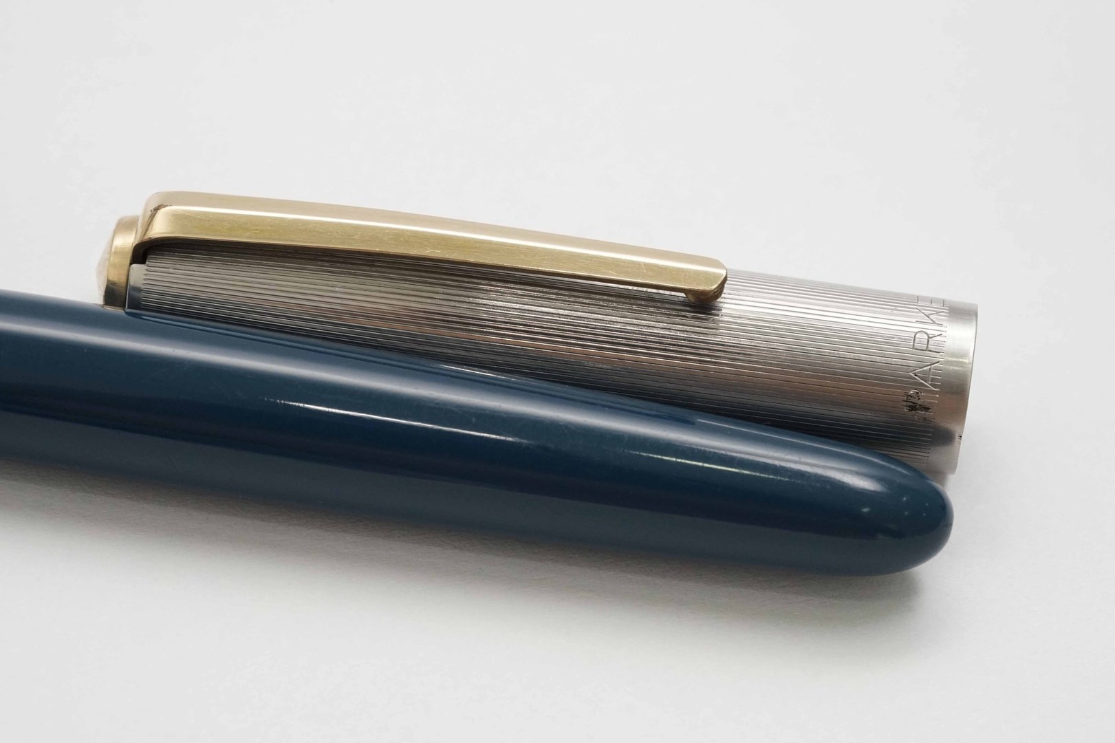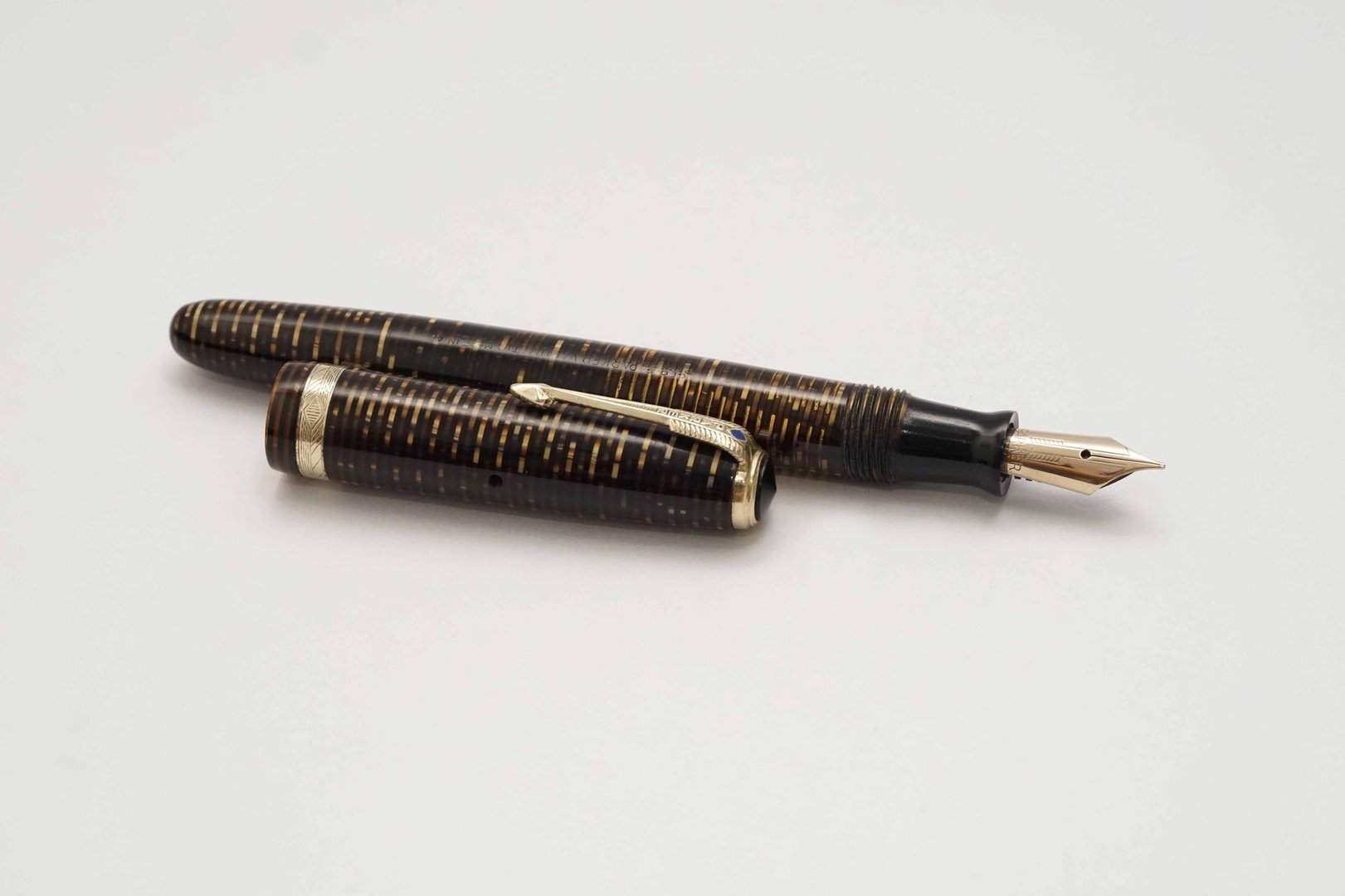 Parker Vacumatic 53 Pearl Green Striped Celluloid thuộc series Vacumatic nổi tiếng giai đoạn những năm 1940s của hãng Parker. Bút có kích thước khá gọn đặc trưng của dòng Parker vintage. Thiết kế của bút đáp ứng được cả yêu cầu về công năng sử dụng lẫn tính thẩm mỹ cao, đây cũng là cây bút tiên phong trong việc sử dụng hỗn hợp nhựa celluloid nhiều lớp để gia công vỏ bút với các vân nhựa màu ngọc trai xanh lá đan xen tạo hiệu ứng thị giác bắt mắt cũng như có thể quan sát lượng mực bên trong. Cài bút bằng hợp kim mạ vàng có hình dáng mũi tên Parker truyền thống rất mộc mạc. Nắp bút đậy kiểu ren vặn, đỉnh nắp có trang trí hạt jewel bằng nhựa màu đen, vòng cap band viền nắp bằng hợp kim mạ vàng. Ngòi bút chế tác từ vàng 14K có độ hoàn thiện cao, lưng ngòi có hoạ tiết mũi tên khắc chìm, bên dưới khắc chữ “Parker Canada 53”, ngòi bút cỡ F cho ra nét chữ êm và trơn mượt khi viết. Bút bơm mực bằng cơ chế vacumatic filler, bấm nhả đuôi bút để xả và hút mực.