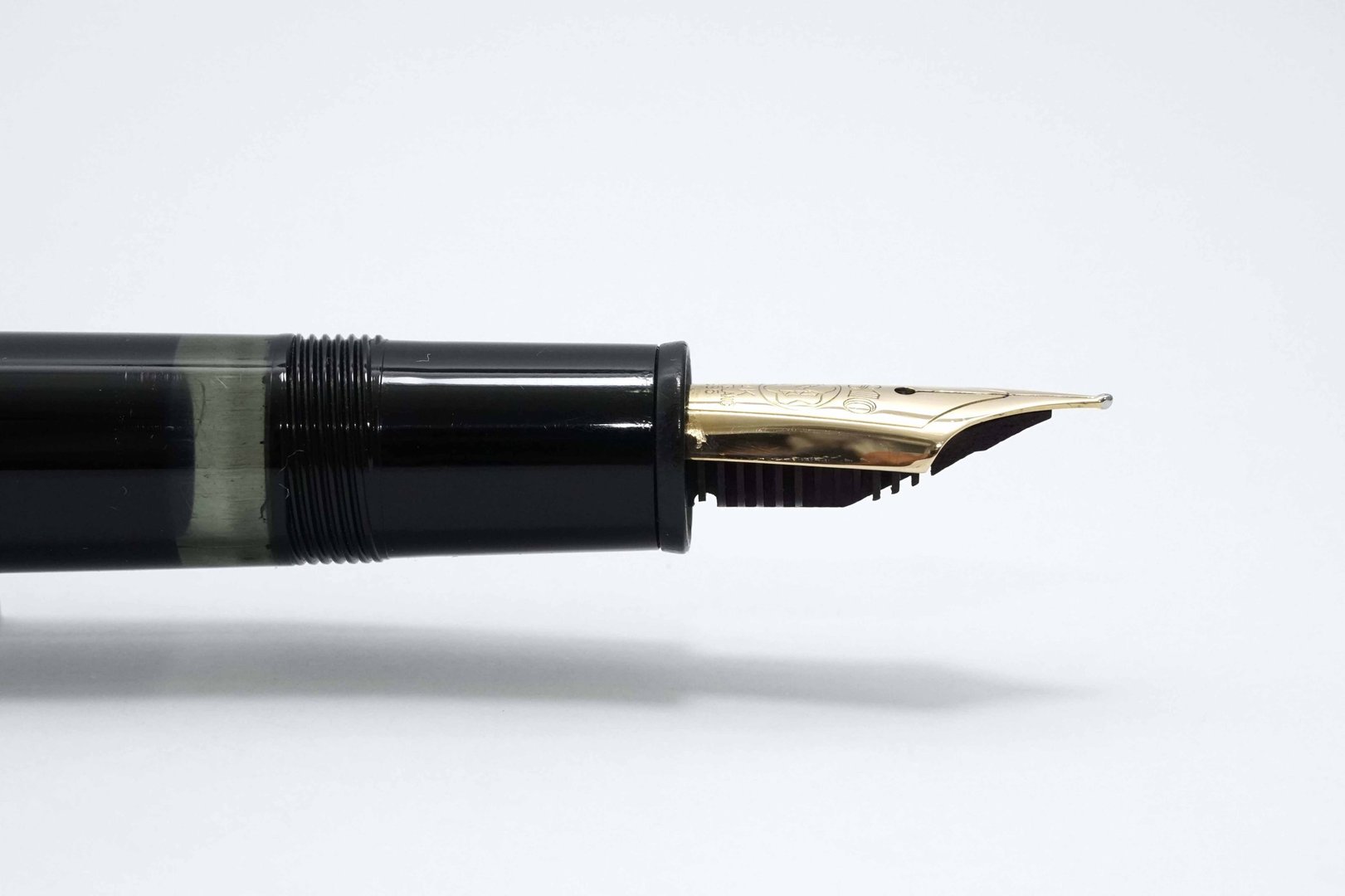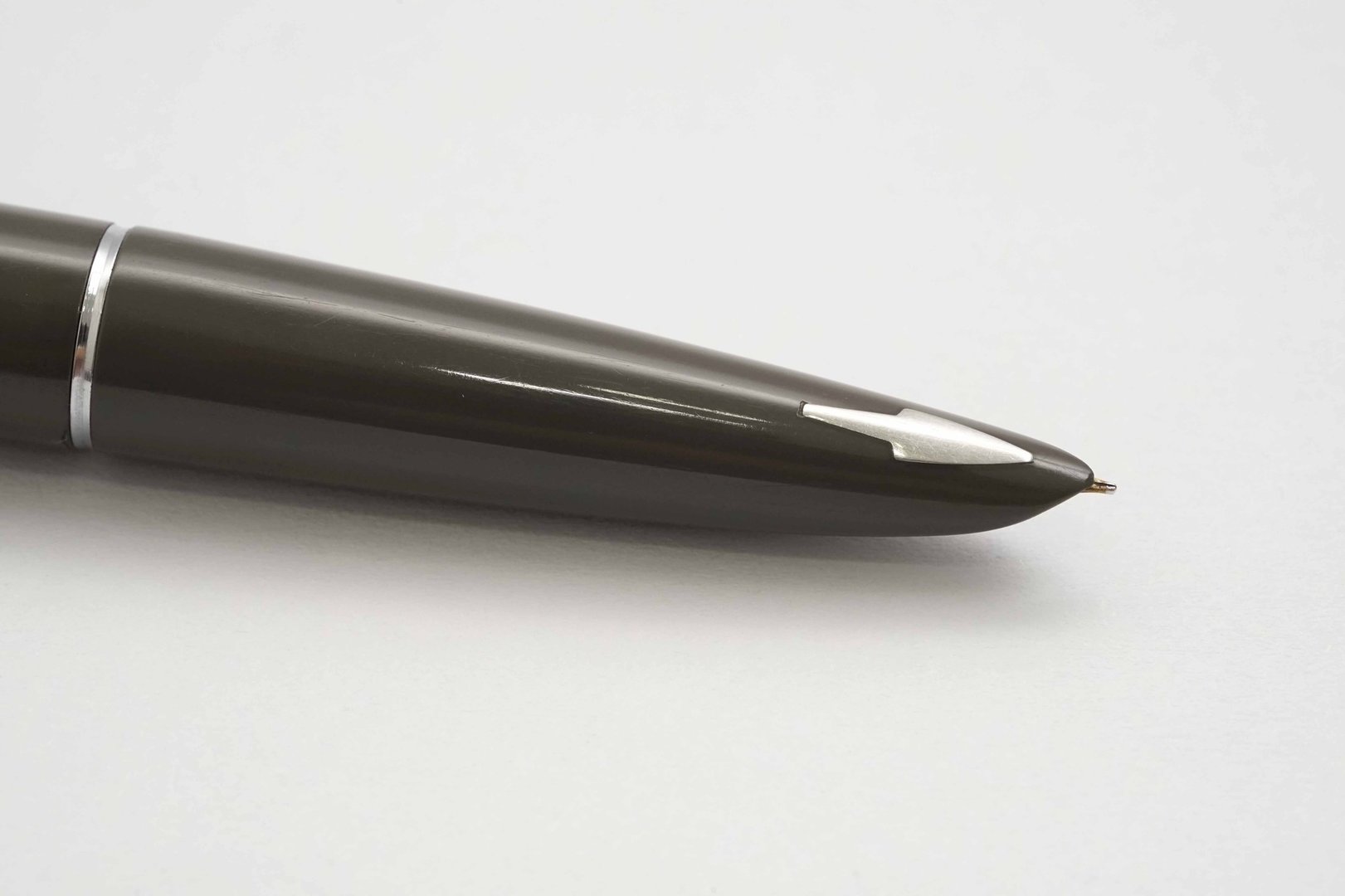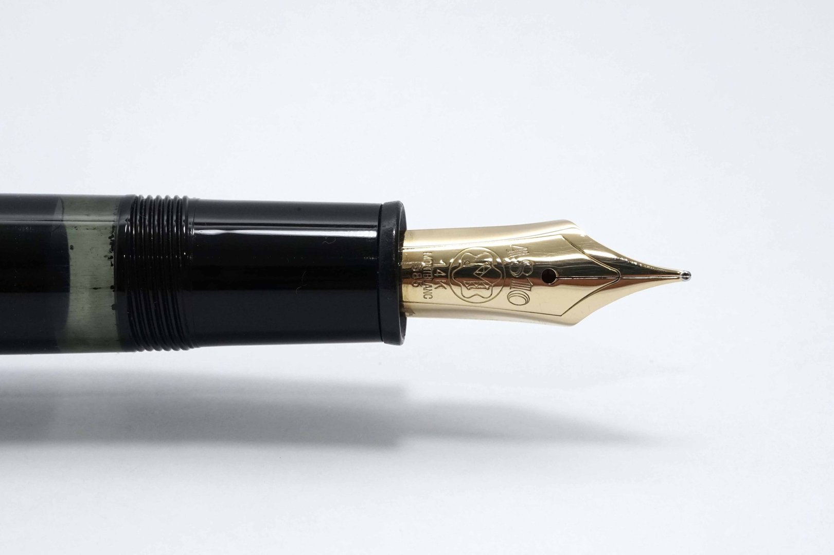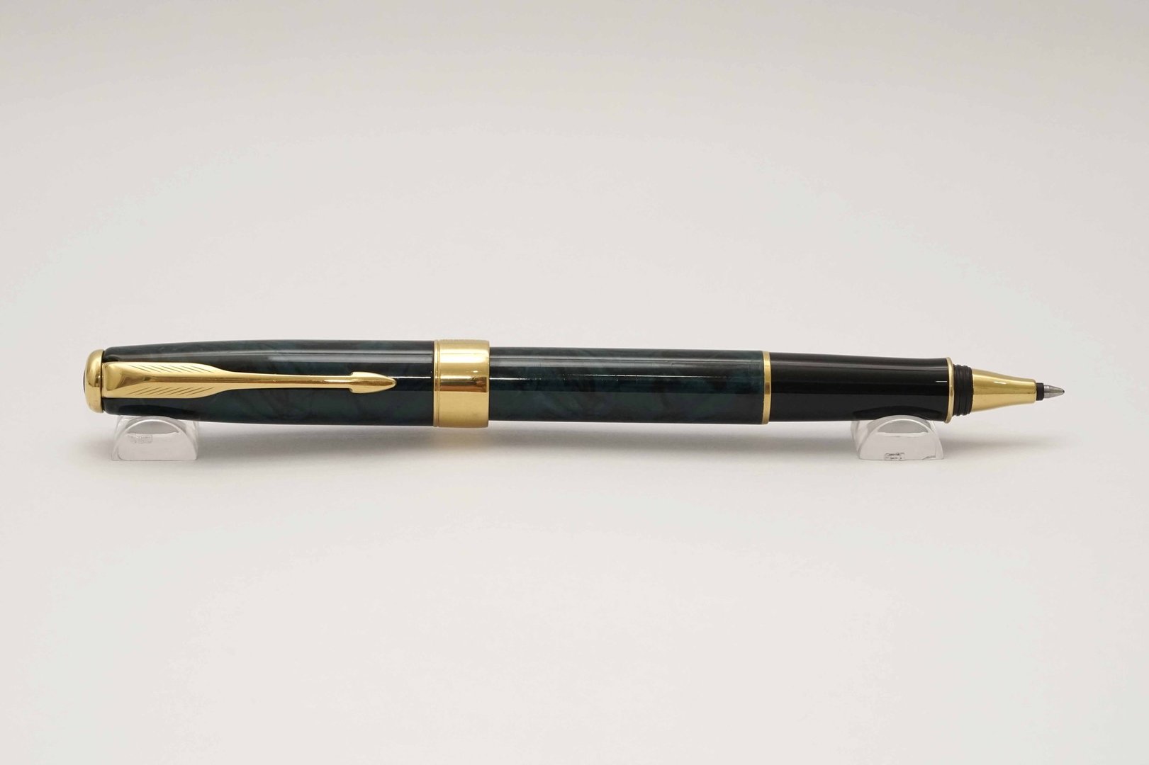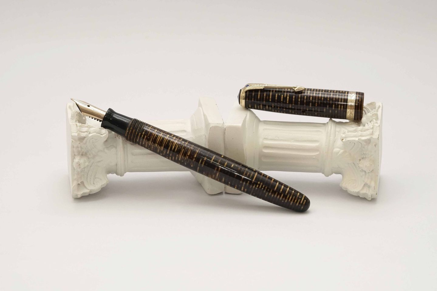 Parker Vacumatic 53 Pearl Green Striped Celluloid thuộc series Vacumatic nổi tiếng giai đoạn những năm 1940s của hãng Parker. Bút có kích thước khá gọn đặc trưng của dòng Parker vintage. Thiết kế của bút đáp ứng được cả yêu cầu về công năng sử dụng lẫn tính thẩm mỹ cao, đây cũng là cây bút tiên phong trong việc sử dụng hỗn hợp nhựa celluloid nhiều lớp để gia công vỏ bút với các vân nhựa màu ngọc trai xanh lá đan xen tạo hiệu ứng thị giác bắt mắt cũng như có thể quan sát lượng mực bên trong. Cài bút bằng hợp kim mạ vàng có hình dáng mũi tên Parker truyền thống rất mộc mạc. Nắp bút đậy kiểu ren vặn, đỉnh nắp có trang trí hạt jewel bằng nhựa màu đen, vòng cap band viền nắp bằng hợp kim mạ vàng. Ngòi bút chế tác từ vàng 14K có độ hoàn thiện cao, lưng ngòi có hoạ tiết mũi tên khắc chìm, bên dưới khắc chữ “Parker Canada 53”, ngòi bút cỡ F cho ra nét chữ êm và trơn mượt khi viết. Bút bơm mực bằng cơ chế vacumatic filler, bấm nhả đuôi bút để xả và hút mực.