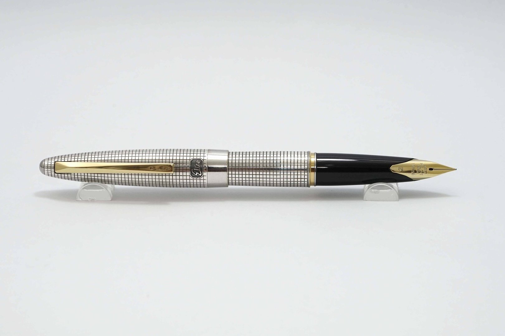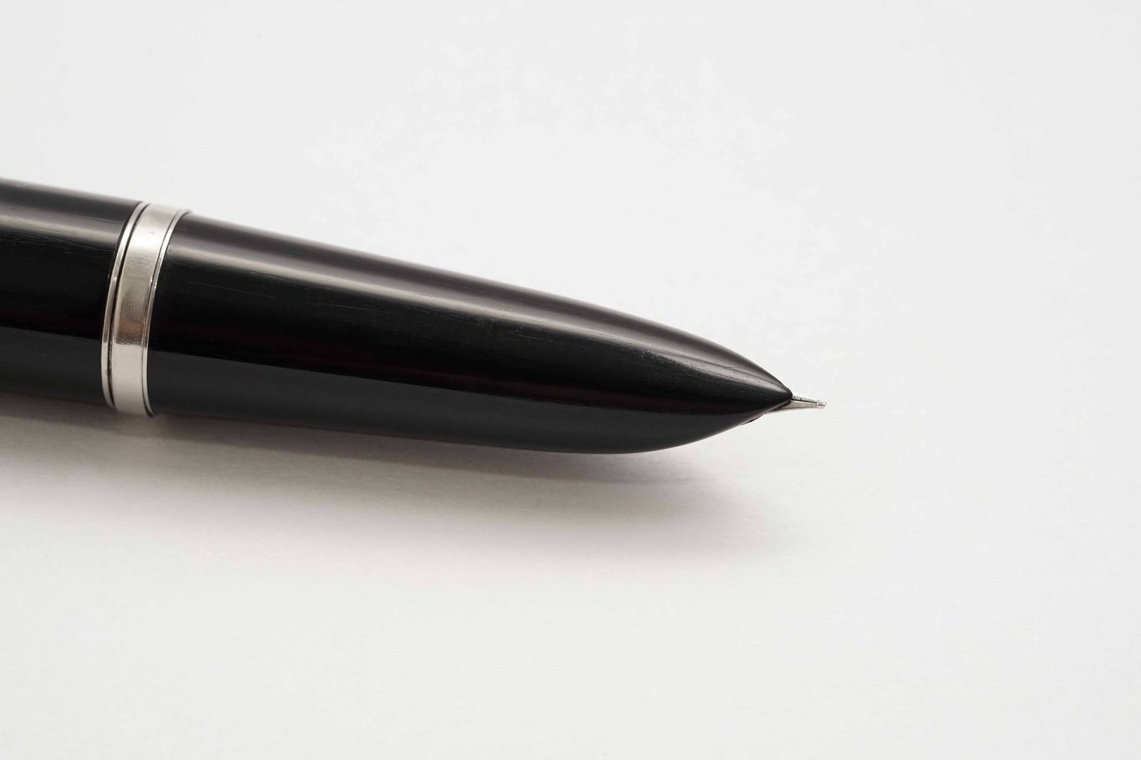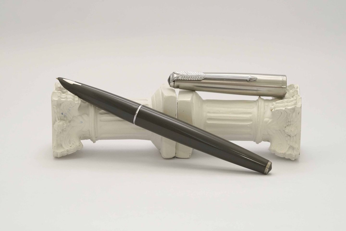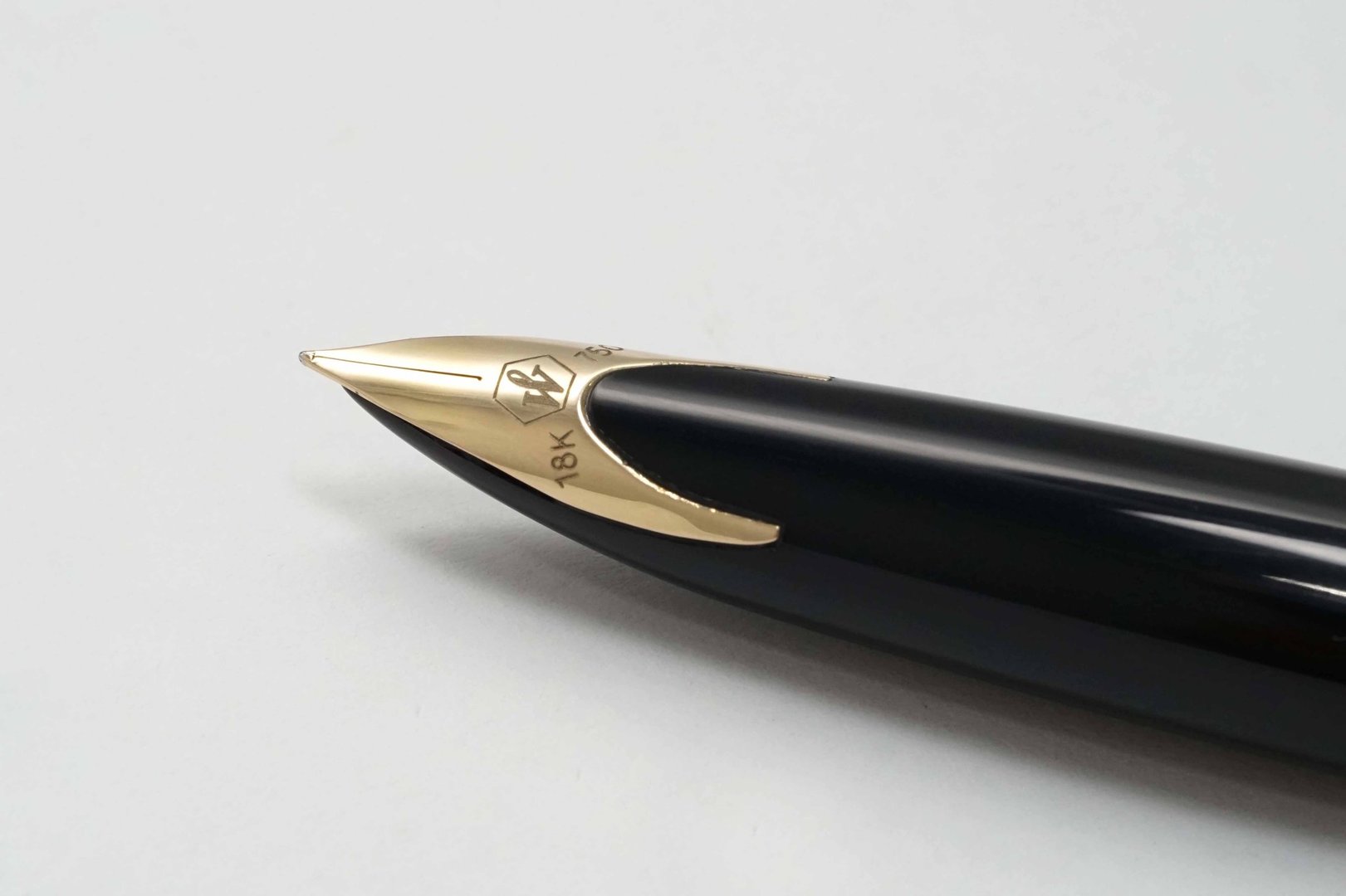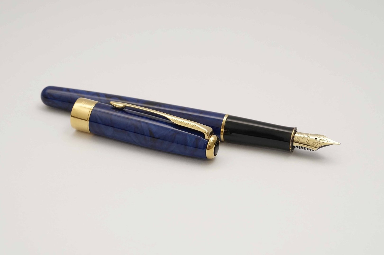 Parker Vacumatic 53 Pearl Green Striped Celluloid thuộc series Vacumatic nổi tiếng giai đoạn những năm 1940s của hãng Parker. Bút có kích thước khá gọn đặc trưng của dòng Parker vintage. Thiết kế của bút đáp ứng được cả yêu cầu về công năng sử dụng lẫn tính thẩm mỹ cao, đây cũng là cây bút tiên phong trong việc sử dụng hỗn hợp nhựa celluloid nhiều lớp để gia công vỏ bút với các vân nhựa màu ngọc trai xanh lá đan xen tạo hiệu ứng thị giác bắt mắt cũng như có thể quan sát lượng mực bên trong. Cài bút bằng hợp kim mạ vàng có hình dáng mũi tên Parker truyền thống rất mộc mạc. Nắp bút đậy kiểu ren vặn, đỉnh nắp có trang trí hạt jewel bằng nhựa màu đen, vòng cap band viền nắp bằng hợp kim mạ vàng. Ngòi bút chế tác từ vàng 14K có độ hoàn thiện cao, lưng ngòi có hoạ tiết mũi tên khắc chìm, bên dưới khắc chữ “Parker Canada 53”, ngòi bút cỡ F cho ra nét chữ êm và trơn mượt khi viết. Bút bơm mực bằng cơ chế vacumatic filler, bấm nhả đuôi bút để xả và hút mực.