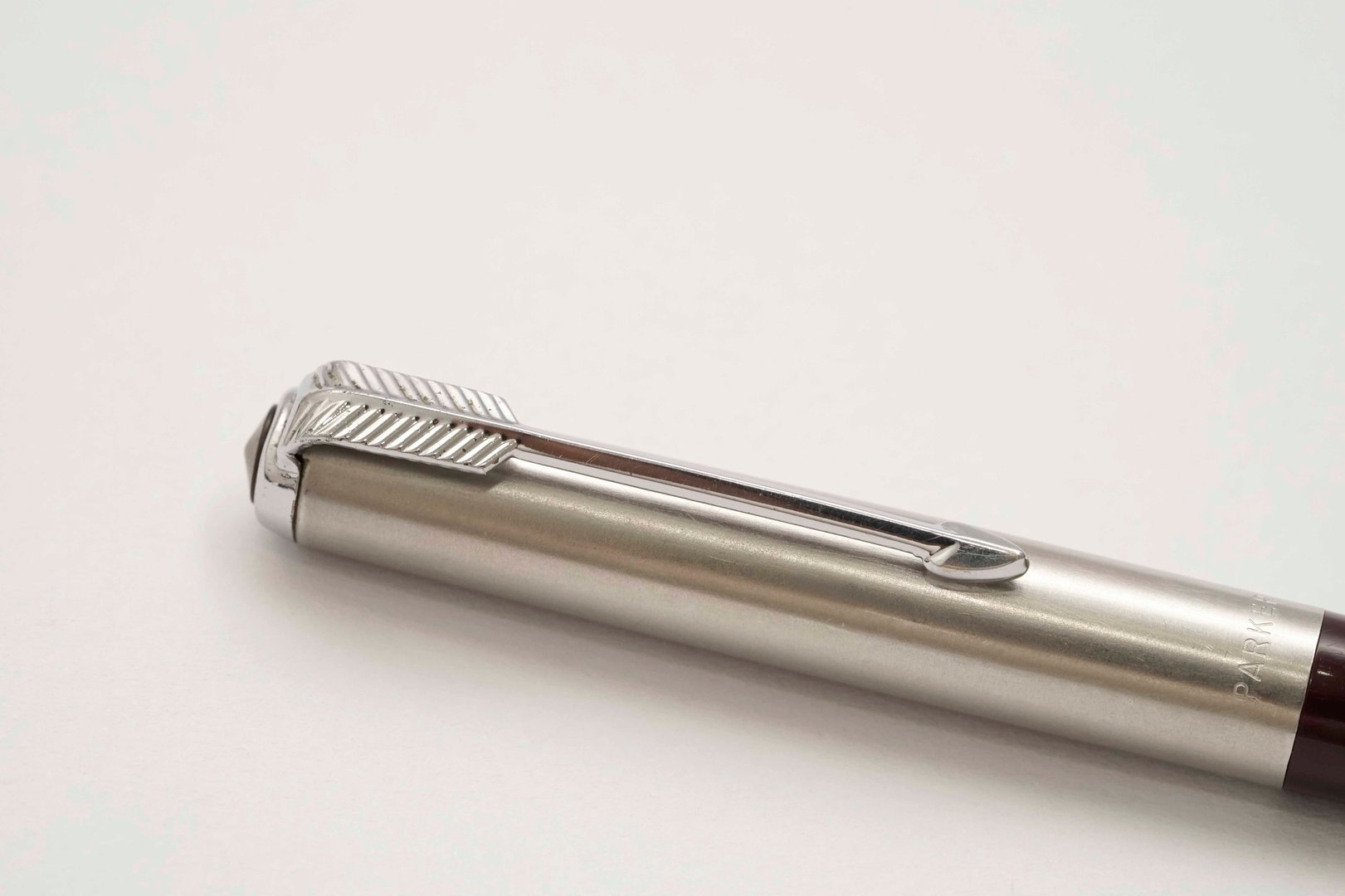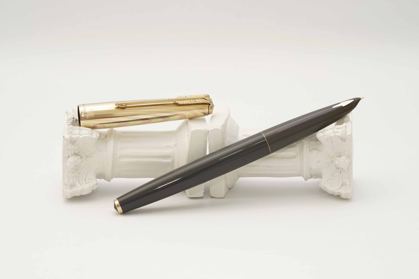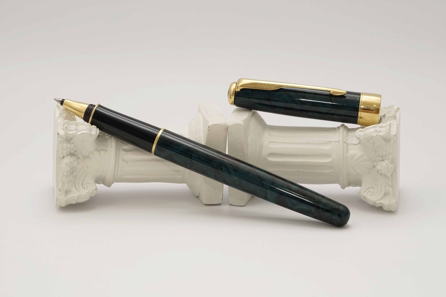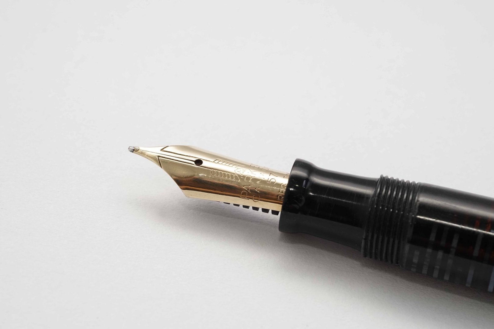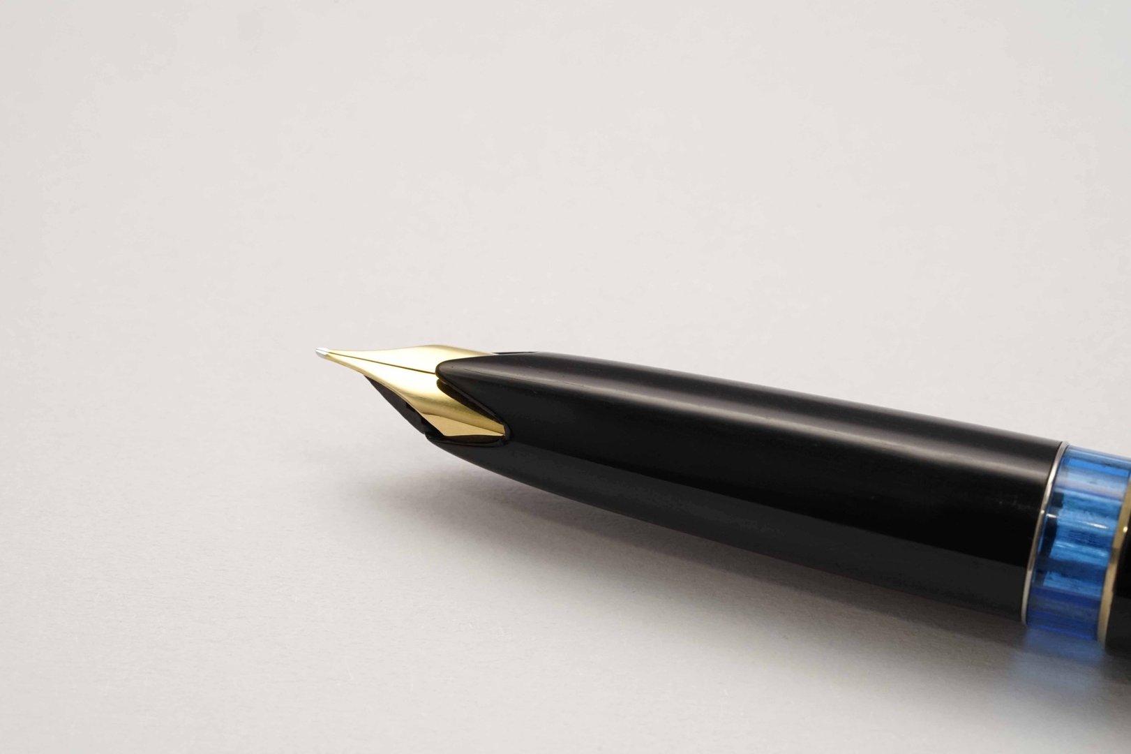 Parker Vacumatic 53 Pearl Green Striped Celluloid thuộc series Vacumatic nổi tiếng giai đoạn những năm 1940s của hãng Parker. Bút có kích thước khá gọn đặc trưng của dòng Parker vintage. Thiết kế của bút đáp ứng được cả yêu cầu về công năng sử dụng lẫn tính thẩm mỹ cao, đây cũng là cây bút tiên phong trong việc sử dụng hỗn hợp nhựa celluloid nhiều lớp để gia công vỏ bút với các vân nhựa màu ngọc trai xanh lá đan xen tạo hiệu ứng thị giác bắt mắt cũng như có thể quan sát lượng mực bên trong. Cài bút bằng hợp kim mạ vàng có hình dáng mũi tên Parker truyền thống rất mộc mạc. Nắp bút đậy kiểu ren vặn, đỉnh nắp có trang trí hạt jewel bằng nhựa màu đen, vòng cap band viền nắp bằng hợp kim mạ vàng. Ngòi bút chế tác từ vàng 14K có độ hoàn thiện cao, lưng ngòi có hoạ tiết mũi tên khắc chìm, bên dưới khắc chữ “Parker Canada 53”, ngòi bút cỡ F cho ra nét chữ êm và trơn mượt khi viết. Bút bơm mực bằng cơ chế vacumatic filler, bấm nhả đuôi bút để xả và hút mực.