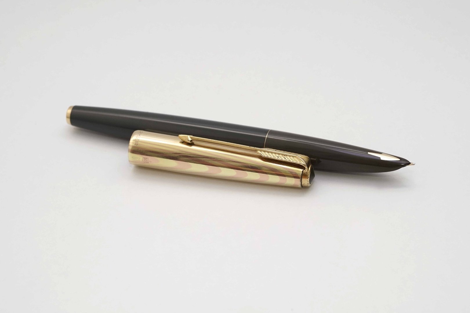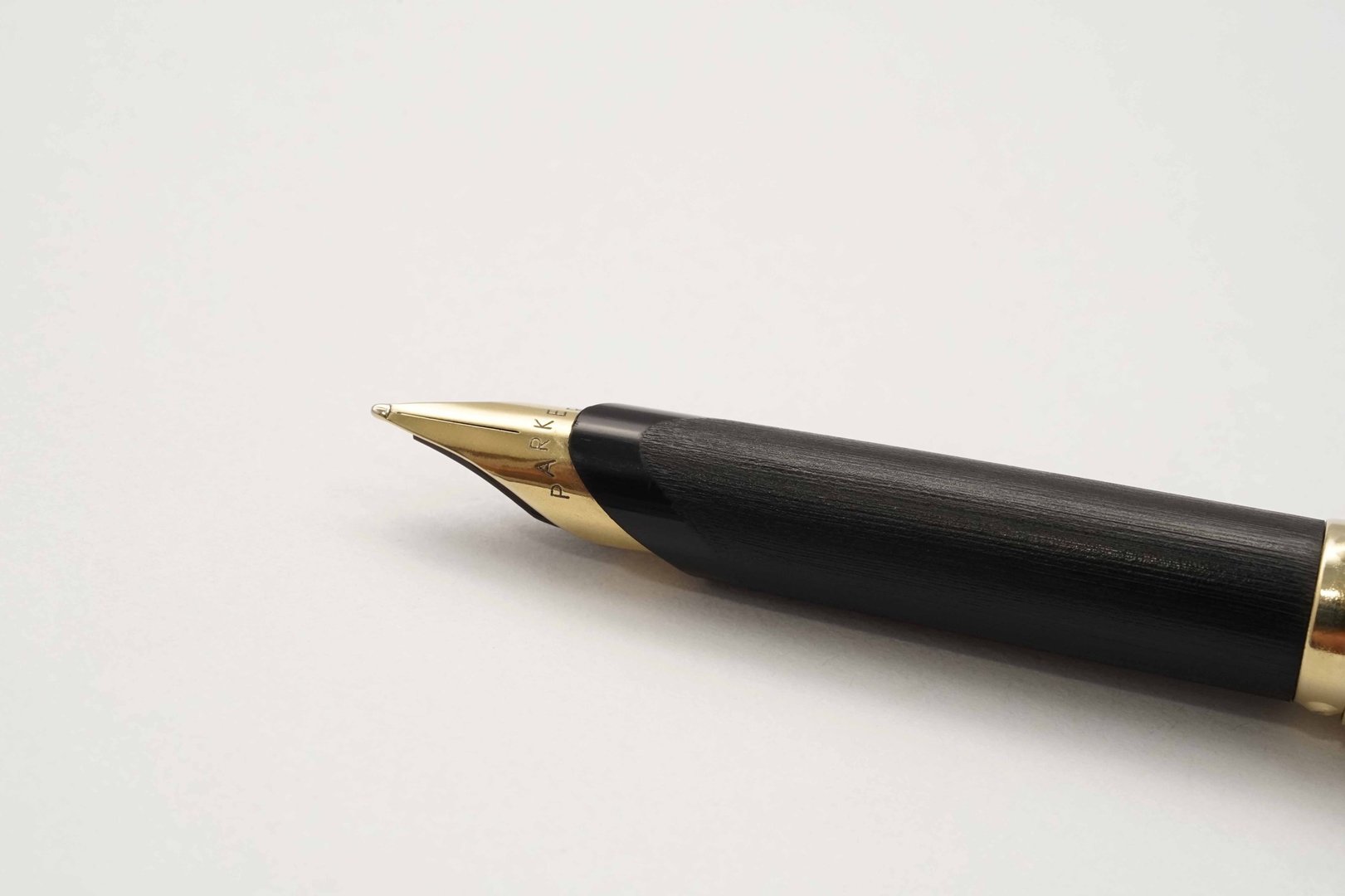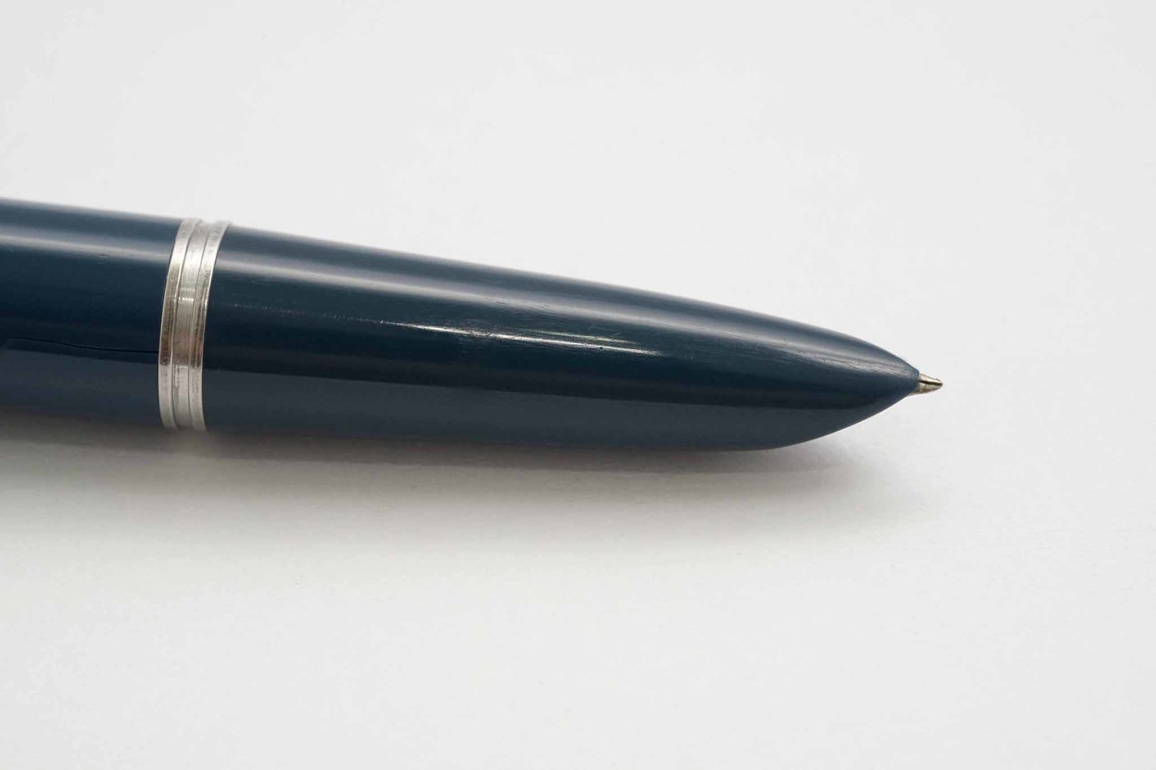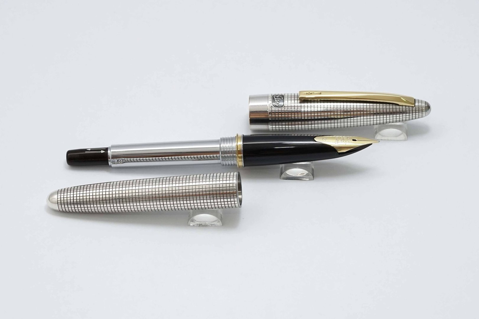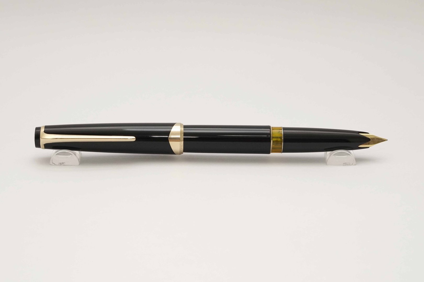 Parker Vacumatic 53 Pearl Green Striped Celluloid thuộc series Vacumatic nổi tiếng giai đoạn những năm 1940s của hãng Parker. Bút có kích thước khá gọn đặc trưng của dòng Parker vintage. Thiết kế của bút đáp ứng được cả yêu cầu về công năng sử dụng lẫn tính thẩm mỹ cao, đây cũng là cây bút tiên phong trong việc sử dụng hỗn hợp nhựa celluloid nhiều lớp để gia công vỏ bút với các vân nhựa màu ngọc trai xanh lá đan xen tạo hiệu ứng thị giác bắt mắt cũng như có thể quan sát lượng mực bên trong. Cài bút bằng hợp kim mạ vàng có hình dáng mũi tên Parker truyền thống rất mộc mạc. Nắp bút đậy kiểu ren vặn, đỉnh nắp có trang trí hạt jewel bằng nhựa màu đen, vòng cap band viền nắp bằng hợp kim mạ vàng. Ngòi bút chế tác từ vàng 14K có độ hoàn thiện cao, lưng ngòi có hoạ tiết mũi tên khắc chìm, bên dưới khắc chữ “Parker Canada 53”, ngòi bút cỡ F cho ra nét chữ êm và trơn mượt khi viết. Bút bơm mực bằng cơ chế vacumatic filler, bấm nhả đuôi bút để xả và hút mực.