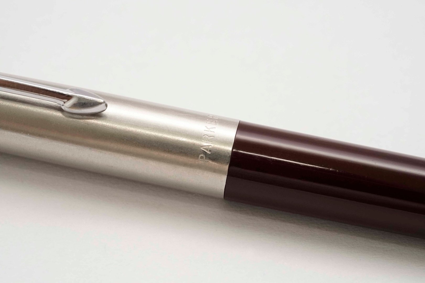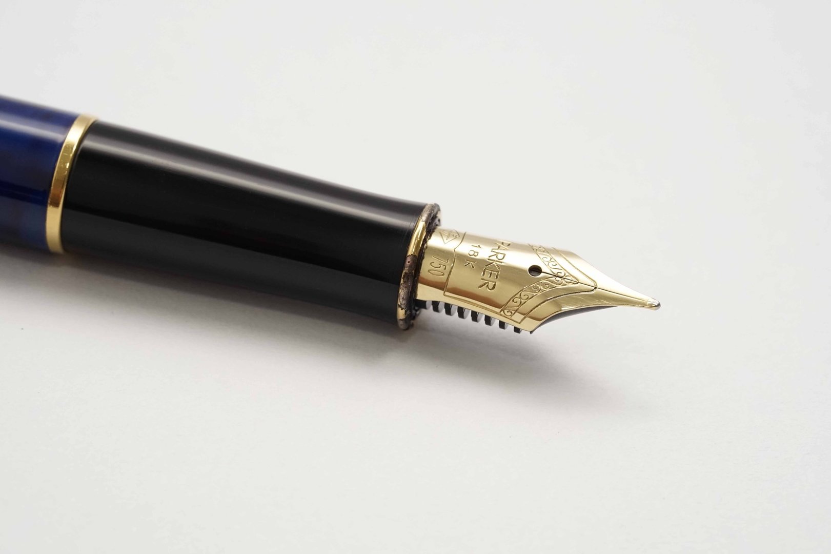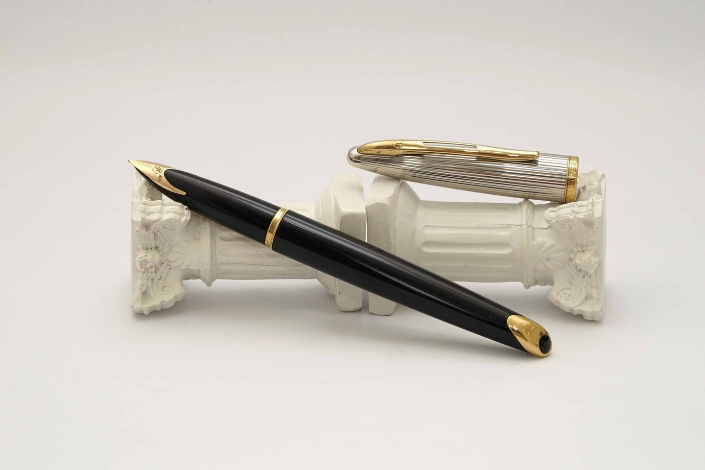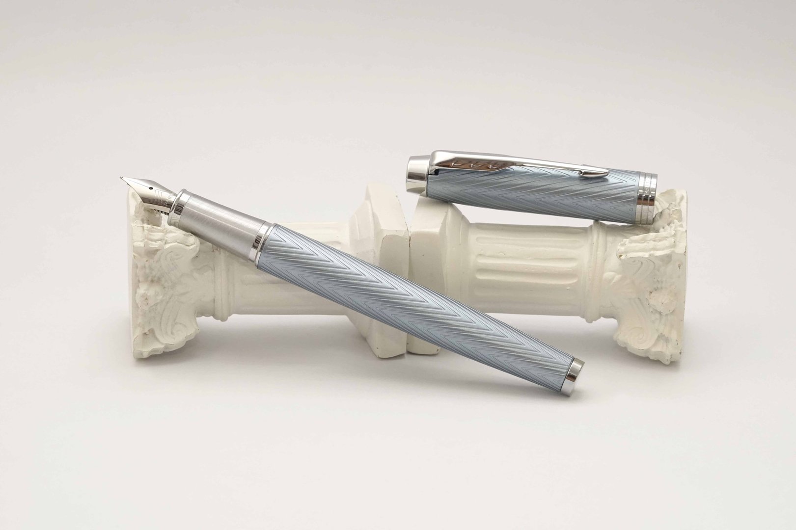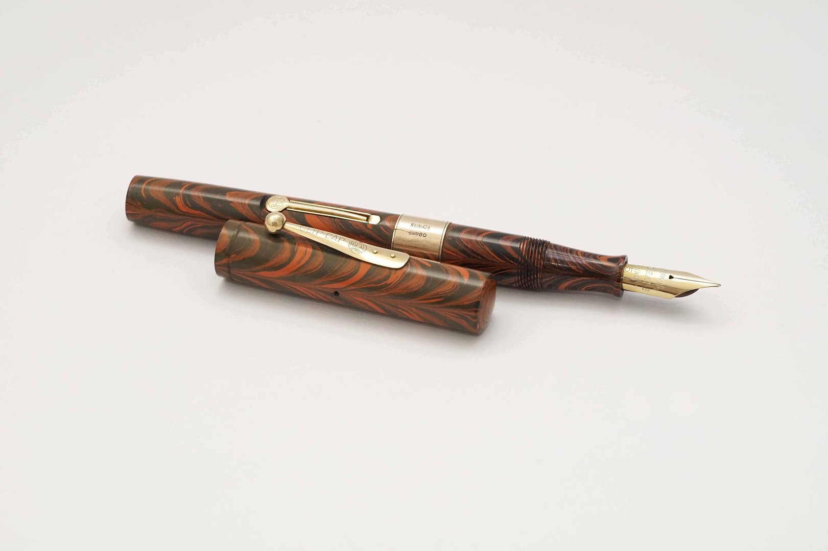 Parker Vacumatic 53 Pearl Green Striped Celluloid thuộc series Vacumatic nổi tiếng giai đoạn những năm 1940s của hãng Parker. Bút có kích thước khá gọn đặc trưng của dòng Parker vintage. Thiết kế của bút đáp ứng được cả yêu cầu về công năng sử dụng lẫn tính thẩm mỹ cao, đây cũng là cây bút tiên phong trong việc sử dụng hỗn hợp nhựa celluloid nhiều lớp để gia công vỏ bút với các vân nhựa màu ngọc trai xanh lá đan xen tạo hiệu ứng thị giác bắt mắt cũng như có thể quan sát lượng mực bên trong. Cài bút bằng hợp kim mạ vàng có hình dáng mũi tên Parker truyền thống rất mộc mạc. Nắp bút đậy kiểu ren vặn, đỉnh nắp có trang trí hạt jewel bằng nhựa màu đen, vòng cap band viền nắp bằng hợp kim mạ vàng. Ngòi bút chế tác từ vàng 14K có độ hoàn thiện cao, lưng ngòi có hoạ tiết mũi tên khắc chìm, bên dưới khắc chữ “Parker Canada 53”, ngòi bút cỡ F cho ra nét chữ êm và trơn mượt khi viết. Bút bơm mực bằng cơ chế vacumatic filler, bấm nhả đuôi bút để xả và hút mực.