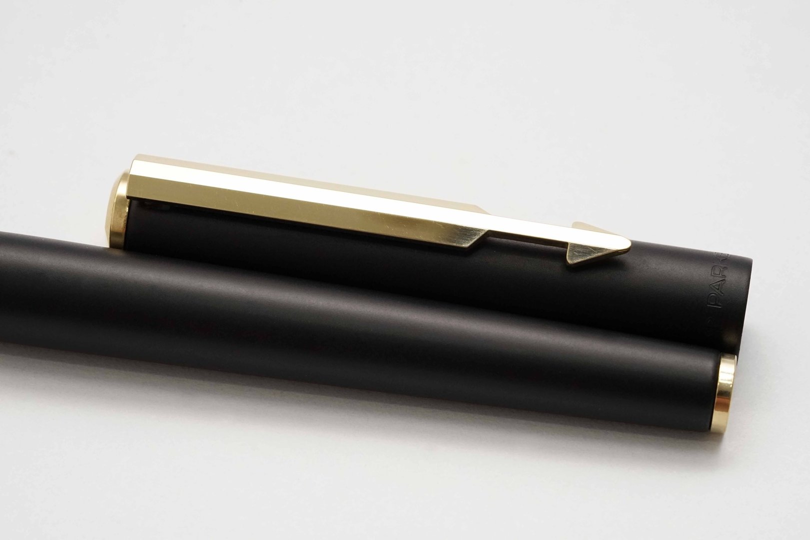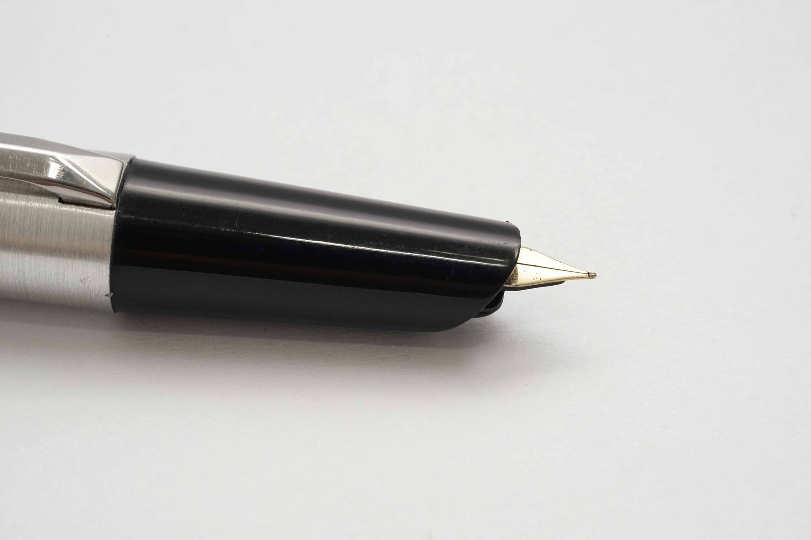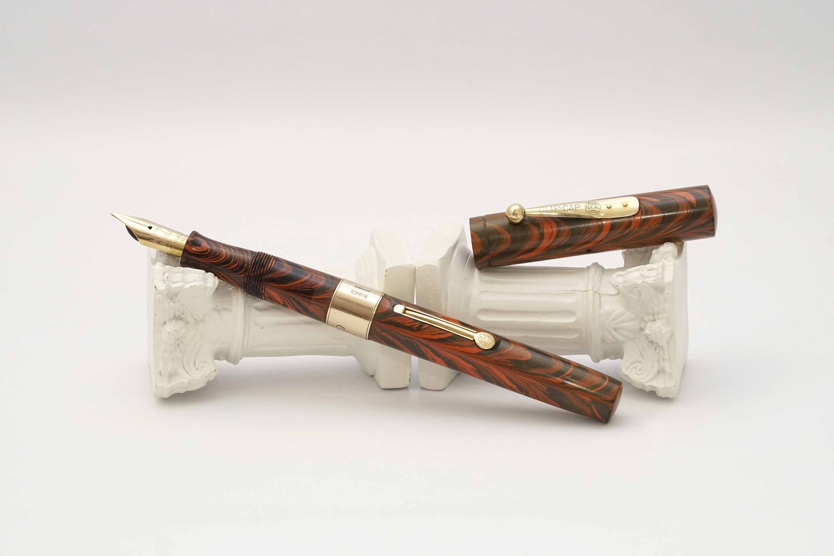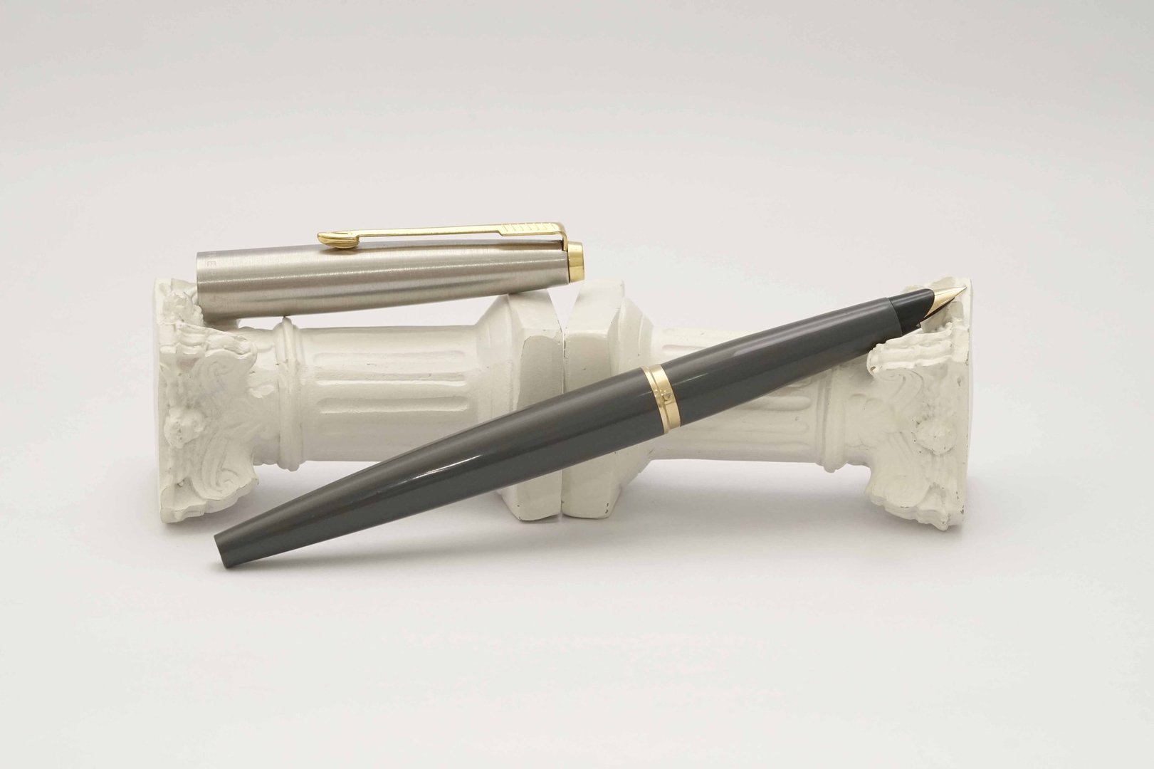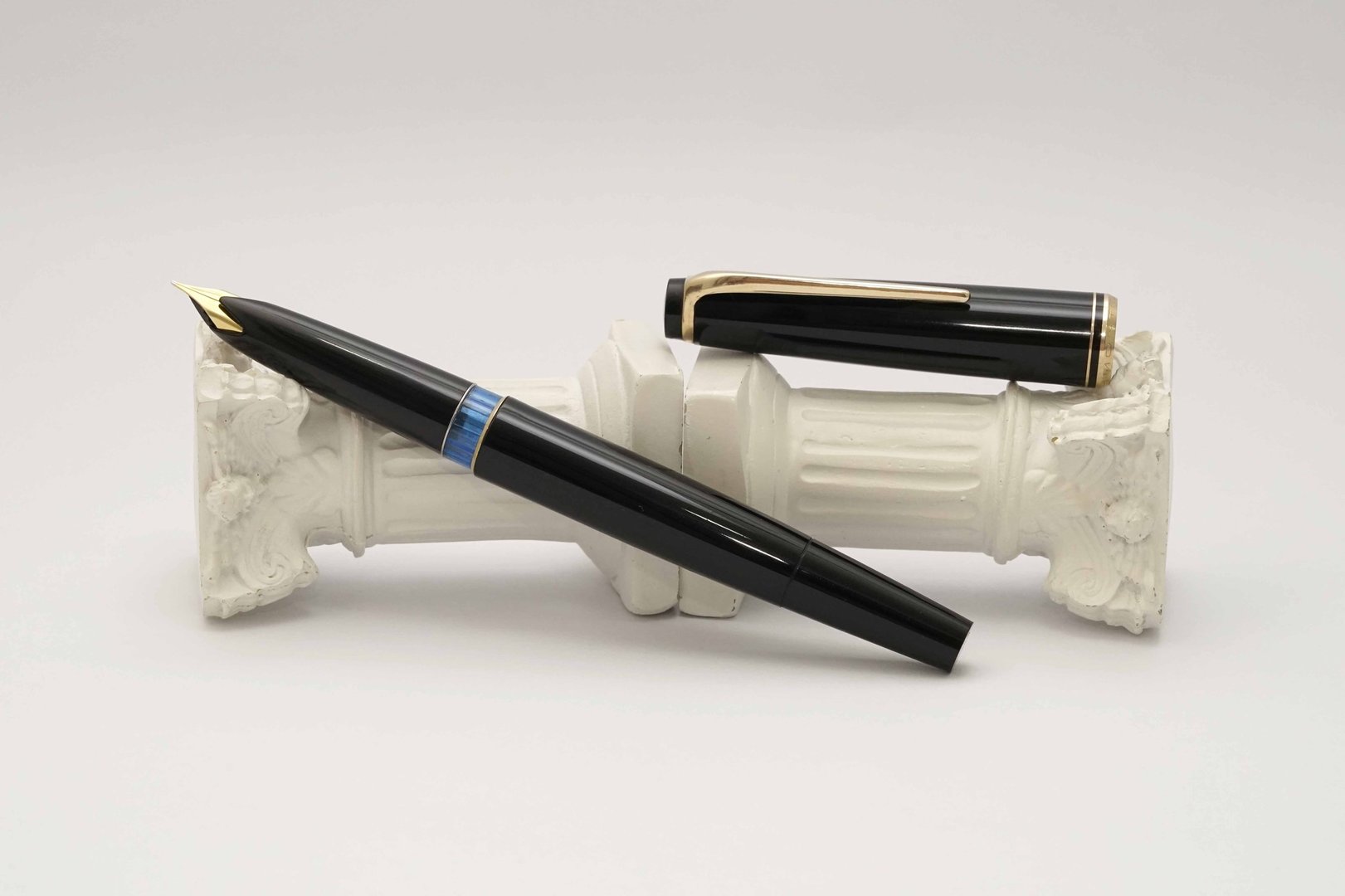 Parker Vacumatic 53 Pearl Green Striped Celluloid thuộc series Vacumatic nổi tiếng giai đoạn những năm 1940s của hãng Parker. Bút có kích thước khá gọn đặc trưng của dòng Parker vintage. Thiết kế của bút đáp ứng được cả yêu cầu về công năng sử dụng lẫn tính thẩm mỹ cao, đây cũng là cây bút tiên phong trong việc sử dụng hỗn hợp nhựa celluloid nhiều lớp để gia công vỏ bút với các vân nhựa màu ngọc trai xanh lá đan xen tạo hiệu ứng thị giác bắt mắt cũng như có thể quan sát lượng mực bên trong. Cài bút bằng hợp kim mạ vàng có hình dáng mũi tên Parker truyền thống rất mộc mạc. Nắp bút đậy kiểu ren vặn, đỉnh nắp có trang trí hạt jewel bằng nhựa màu đen, vòng cap band viền nắp bằng hợp kim mạ vàng. Ngòi bút chế tác từ vàng 14K có độ hoàn thiện cao, lưng ngòi có hoạ tiết mũi tên khắc chìm, bên dưới khắc chữ “Parker Canada 53”, ngòi bút cỡ F cho ra nét chữ êm và trơn mượt khi viết. Bút bơm mực bằng cơ chế vacumatic filler, bấm nhả đuôi bút để xả và hút mực.