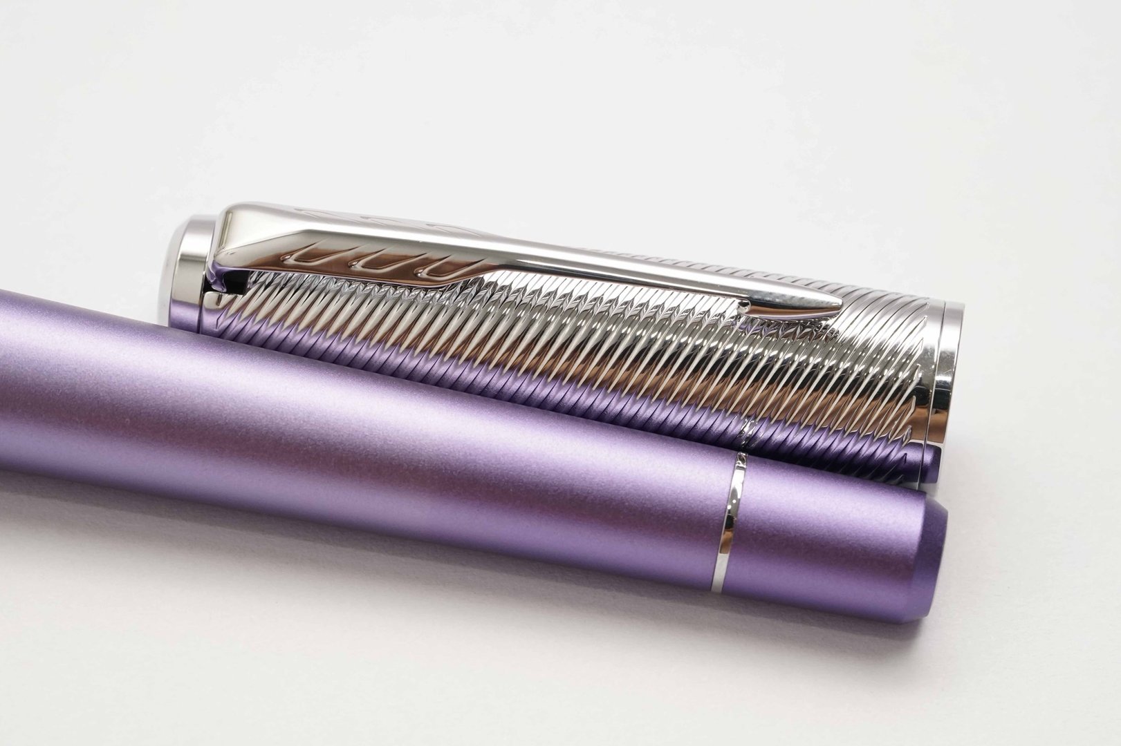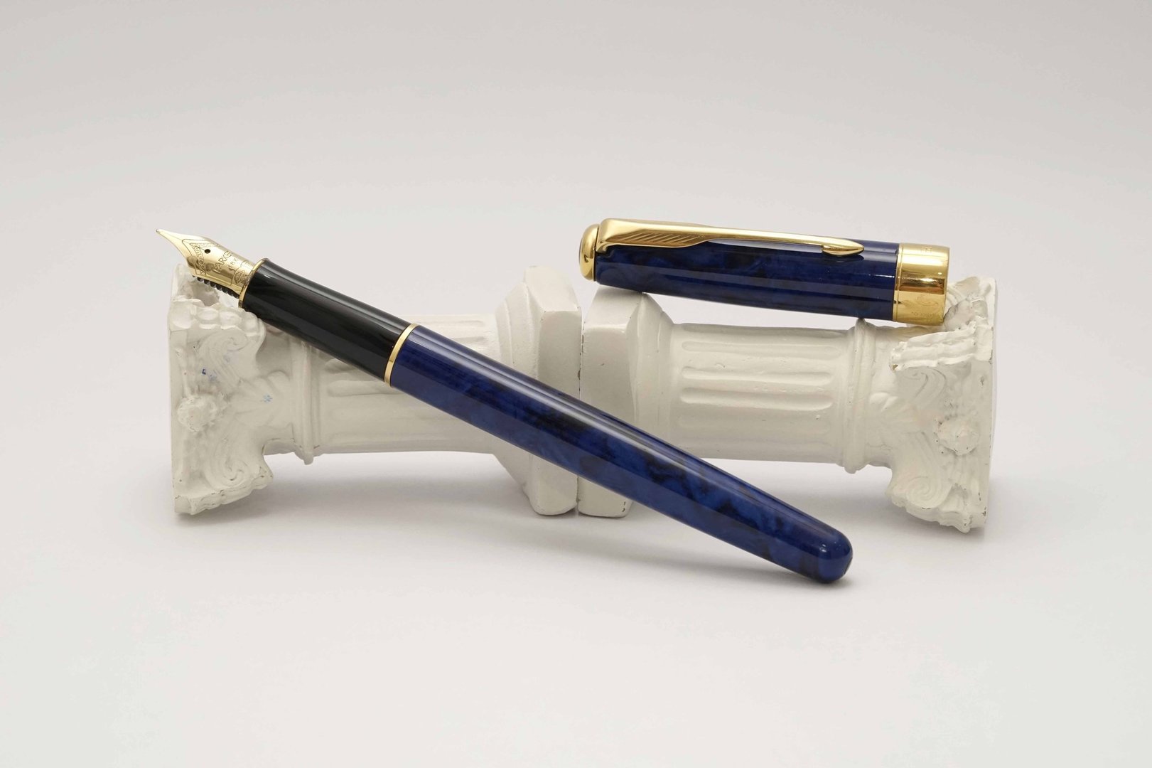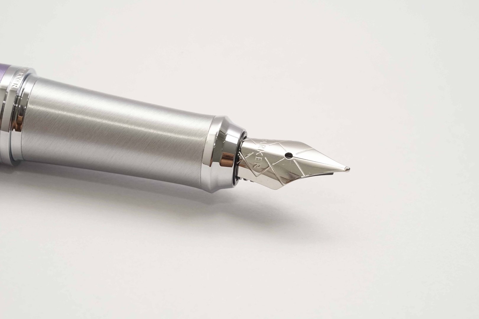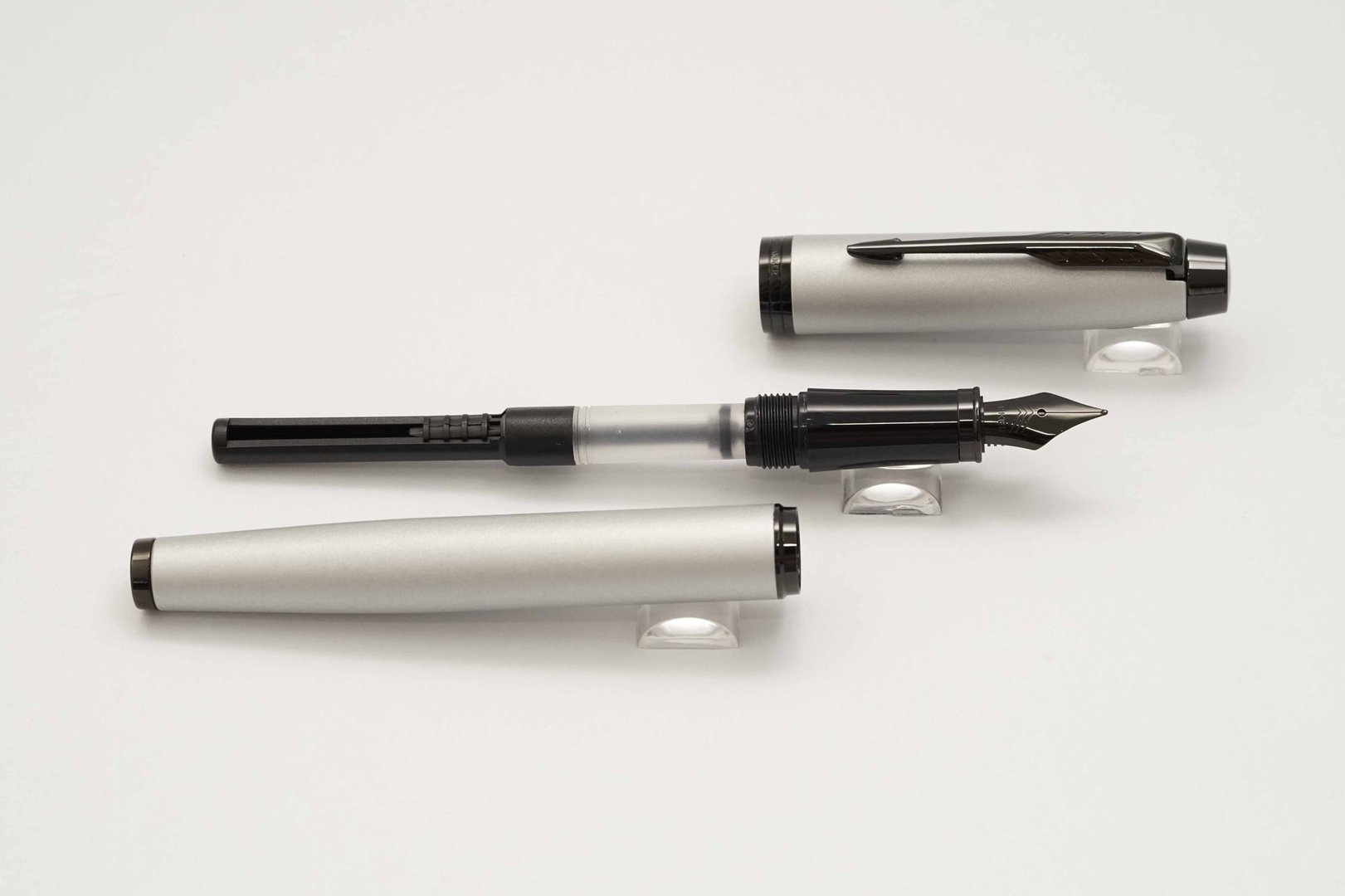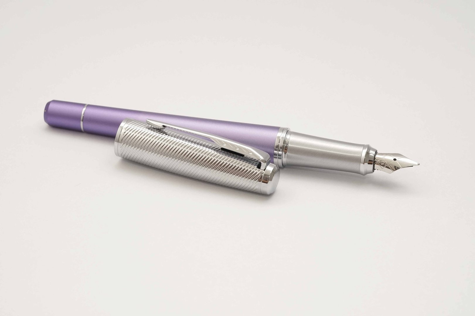 Parker Vacumatic 53 Pearl Green Striped Celluloid thuộc series Vacumatic nổi tiếng giai đoạn những năm 1940s của hãng Parker. Bút có kích thước khá gọn đặc trưng của dòng Parker vintage. Thiết kế của bút đáp ứng được cả yêu cầu về công năng sử dụng lẫn tính thẩm mỹ cao, đây cũng là cây bút tiên phong trong việc sử dụng hỗn hợp nhựa celluloid nhiều lớp để gia công vỏ bút với các vân nhựa màu ngọc trai xanh lá đan xen tạo hiệu ứng thị giác bắt mắt cũng như có thể quan sát lượng mực bên trong. Cài bút bằng hợp kim mạ vàng có hình dáng mũi tên Parker truyền thống rất mộc mạc. Nắp bút đậy kiểu ren vặn, đỉnh nắp có trang trí hạt jewel bằng nhựa màu đen, vòng cap band viền nắp bằng hợp kim mạ vàng. Ngòi bút chế tác từ vàng 14K có độ hoàn thiện cao, lưng ngòi có hoạ tiết mũi tên khắc chìm, bên dưới khắc chữ “Parker Canada 53”, ngòi bút cỡ F cho ra nét chữ êm và trơn mượt khi viết. Bút bơm mực bằng cơ chế vacumatic filler, bấm nhả đuôi bút để xả và hút mực.