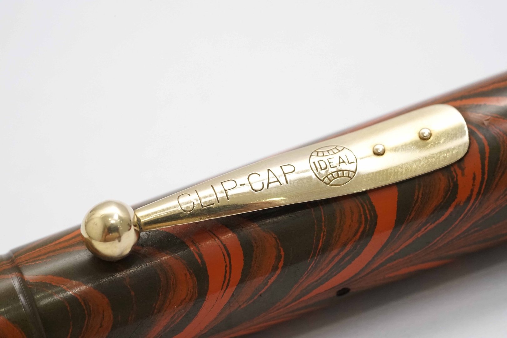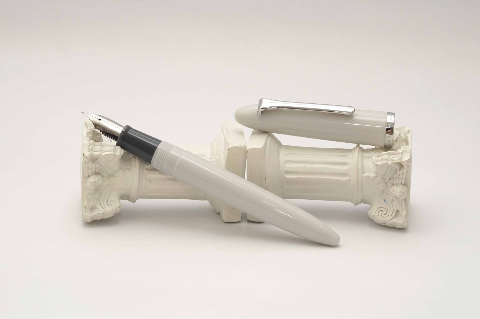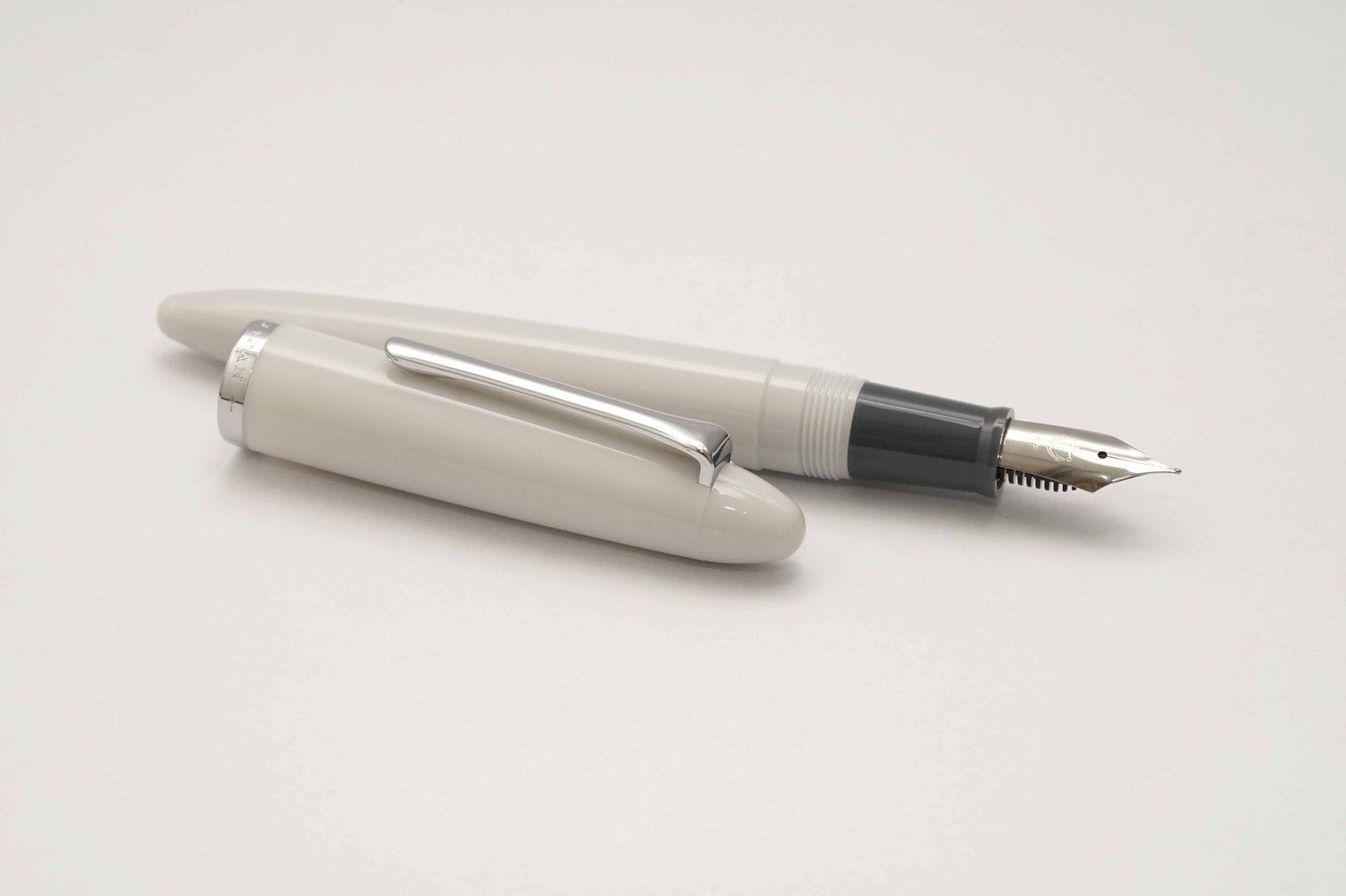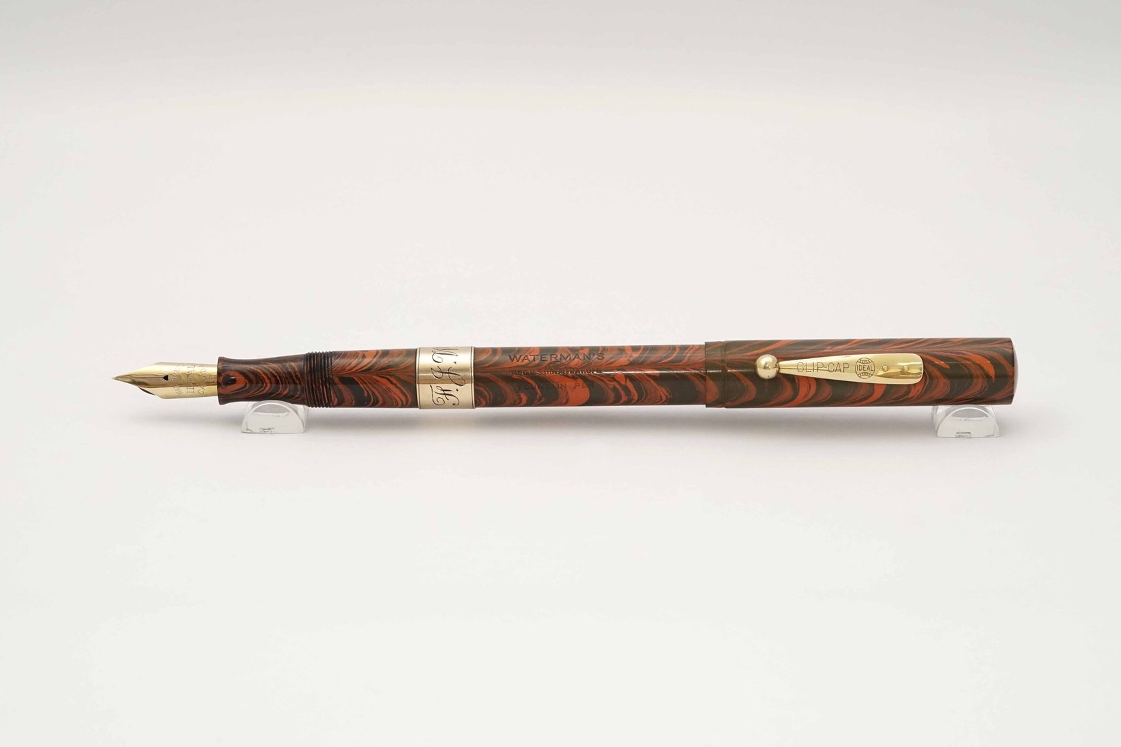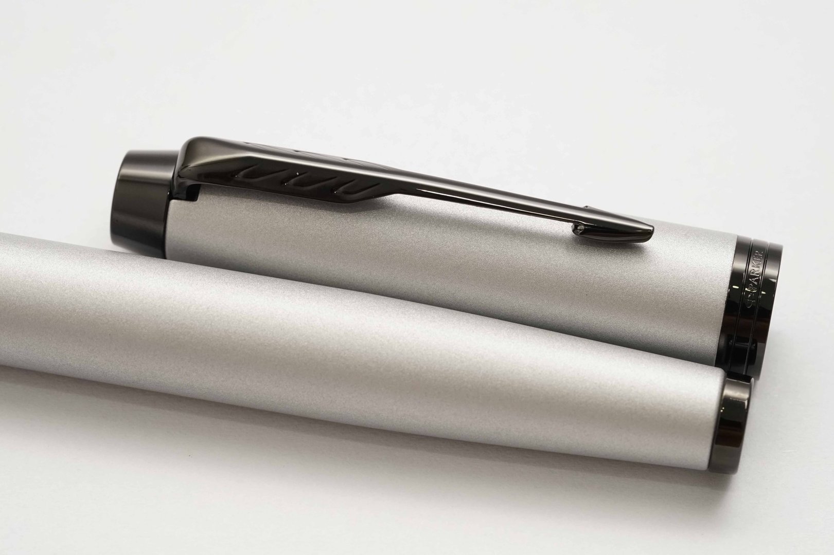 Parker Vacumatic 53 Pearl Green Striped Celluloid thuộc series Vacumatic nổi tiếng giai đoạn những năm 1940s của hãng Parker. Bút có kích thước khá gọn đặc trưng của dòng Parker vintage. Thiết kế của bút đáp ứng được cả yêu cầu về công năng sử dụng lẫn tính thẩm mỹ cao, đây cũng là cây bút tiên phong trong việc sử dụng hỗn hợp nhựa celluloid nhiều lớp để gia công vỏ bút với các vân nhựa màu ngọc trai xanh lá đan xen tạo hiệu ứng thị giác bắt mắt cũng như có thể quan sát lượng mực bên trong. Cài bút bằng hợp kim mạ vàng có hình dáng mũi tên Parker truyền thống rất mộc mạc. Nắp bút đậy kiểu ren vặn, đỉnh nắp có trang trí hạt jewel bằng nhựa màu đen, vòng cap band viền nắp bằng hợp kim mạ vàng. Ngòi bút chế tác từ vàng 14K có độ hoàn thiện cao, lưng ngòi có hoạ tiết mũi tên khắc chìm, bên dưới khắc chữ “Parker Canada 53”, ngòi bút cỡ F cho ra nét chữ êm và trơn mượt khi viết. Bút bơm mực bằng cơ chế vacumatic filler, bấm nhả đuôi bút để xả và hút mực.