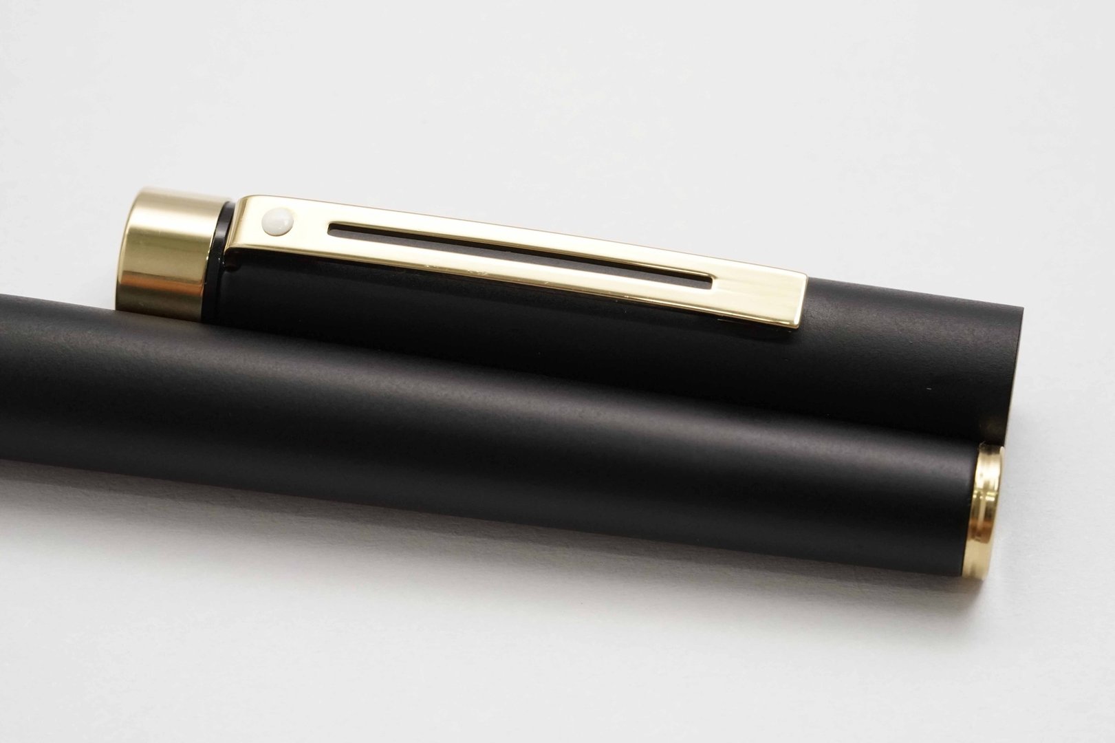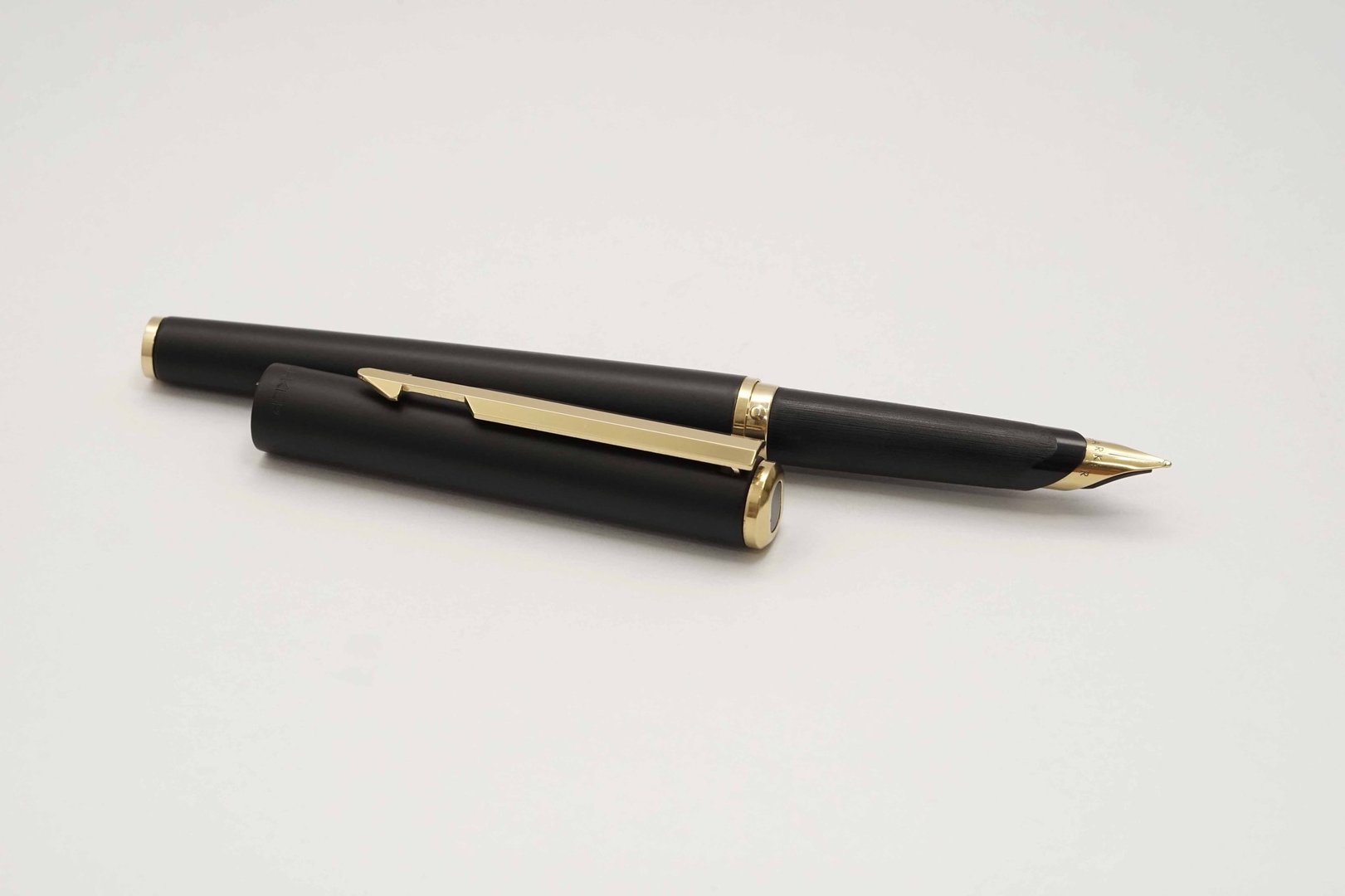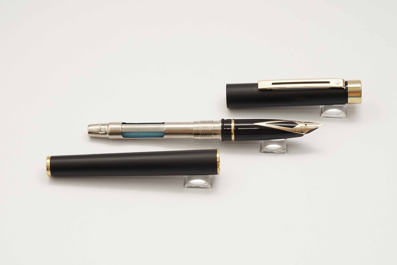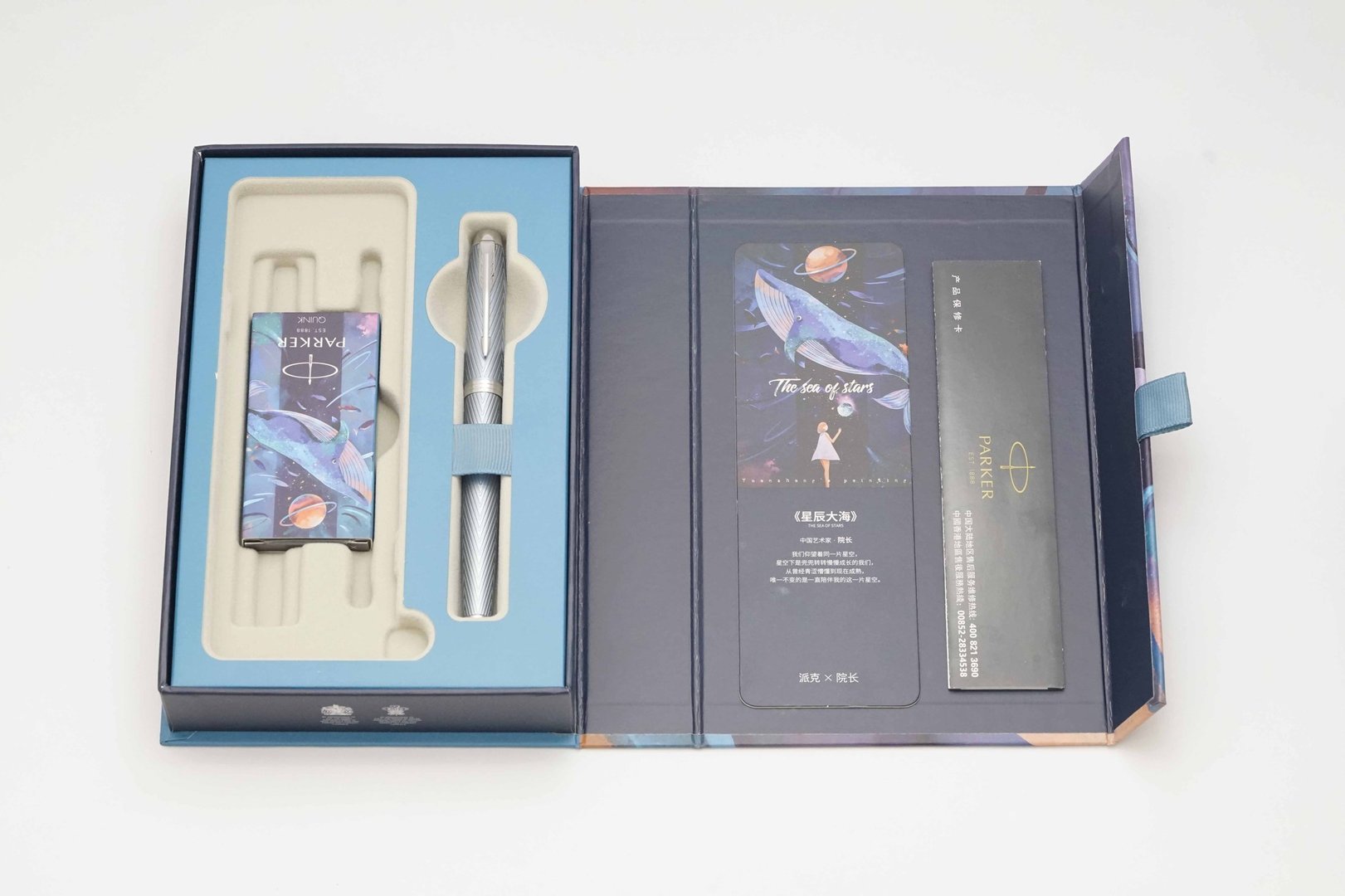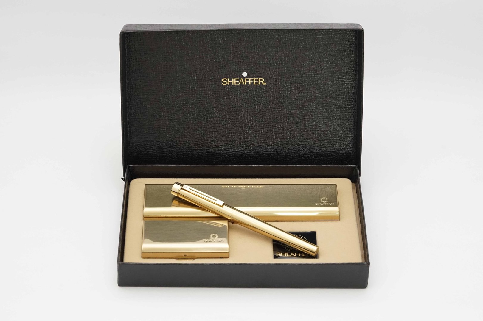 Vì là model cao cấp của Sheaffer nên bút đi kèm set hộp được đầu tư công phu với hộp lớn bên ngoài bằng giấy cứng màu đen bóng, bên trong có 2 hộp kim loại bọc imperial brass gồm hộp dài để đựng bút và piston, hộp nhỏ còn lại đựng 4 ống mực phụ.