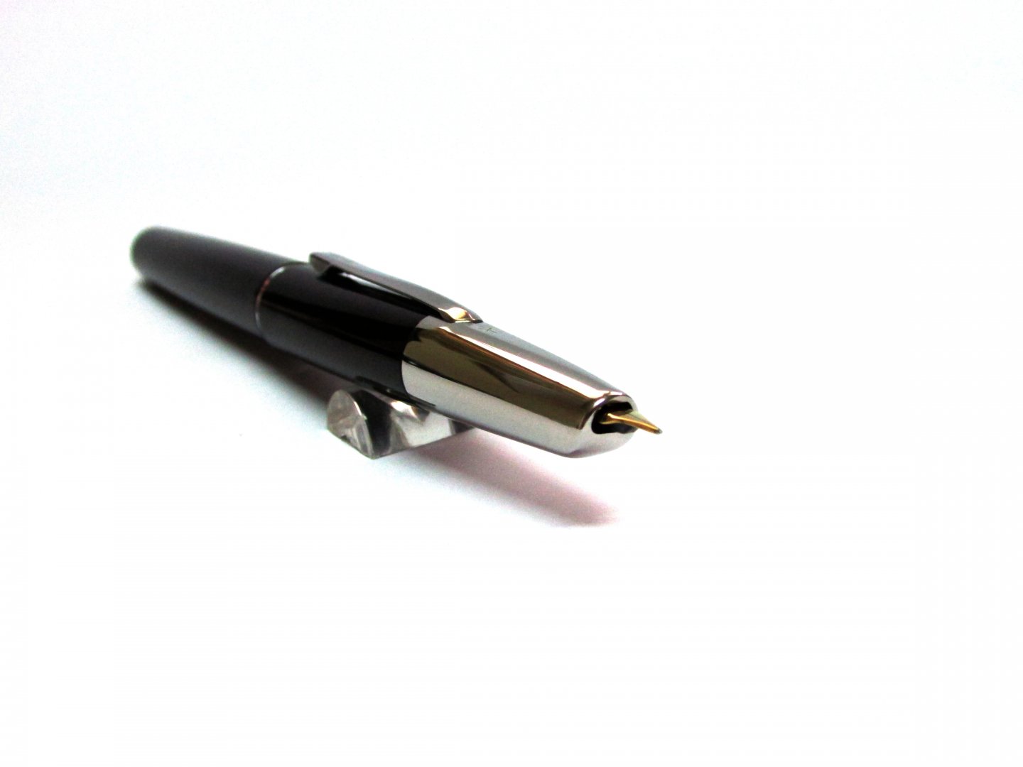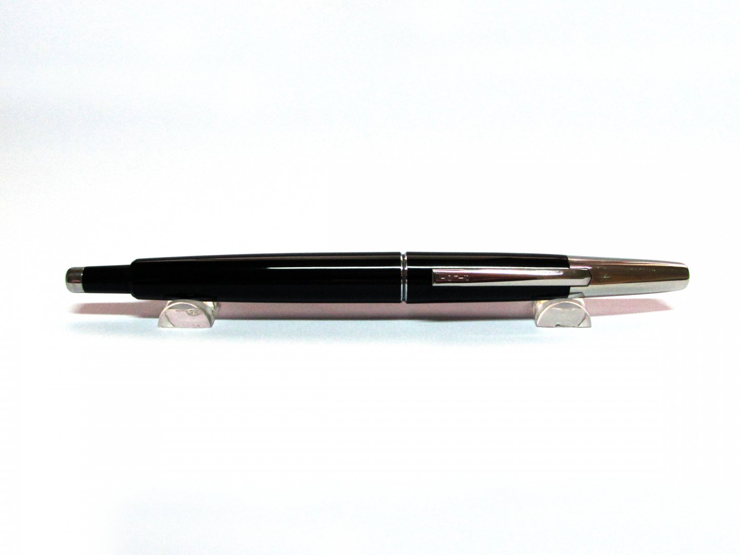 MS136 : Bút máy Pilot Namiki Vanishing (Made in Japan). Thân bút và nắp bút bằng nhựa cứng màu đen bóng. Cài bút và đầu bút bằng thép mạ chrome, cài bút bằng thép được thiết kế chắc chắn với phần tay cầm. Bút hoạt động và bơm mực như bút máy nhưng cách sử dụng như bút bi bấm. Ngòi bút bằng vàng 14K size F với logo Pilot và nhiều ký hiệu nhỏ khắc chìm trên ngòi. Tổng thể bút đẹp 98%-99%. Giá giao lưu 1.500.000 VND.