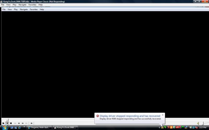 Tình hình là như thế này, laptop mình từ lúc mua về là nó có triệu chưng như thế này, mỗi khi chơi game Thiên Long Bát Bộ, hay là xem phim HD720p (1080p thì ko xem đượ luôn) chỉ được chừng 2 phút là hiện lên lỗi này vào treo game hoặc là treo luôn Media Player Classic, có ai biết ko, giúp mình khắc phục với...mình có chụp hình lại , các bạn xem thử:-$ nó hiện lên cái lỗi này nè "Display Driver Stopped Responding and has recovered" Display Driver R300 Stopped Responding and has successfully recovered