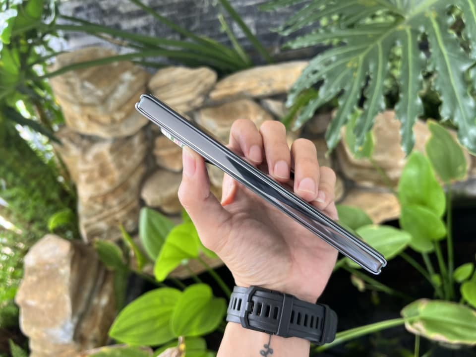 Độ mỏng khi mở ra chỉ 5.3mm , lưng bọc da, cực kỳ nhẹ chỉ hơn 230g. Siêu mỏng nhẹ trong làng máy Fold.