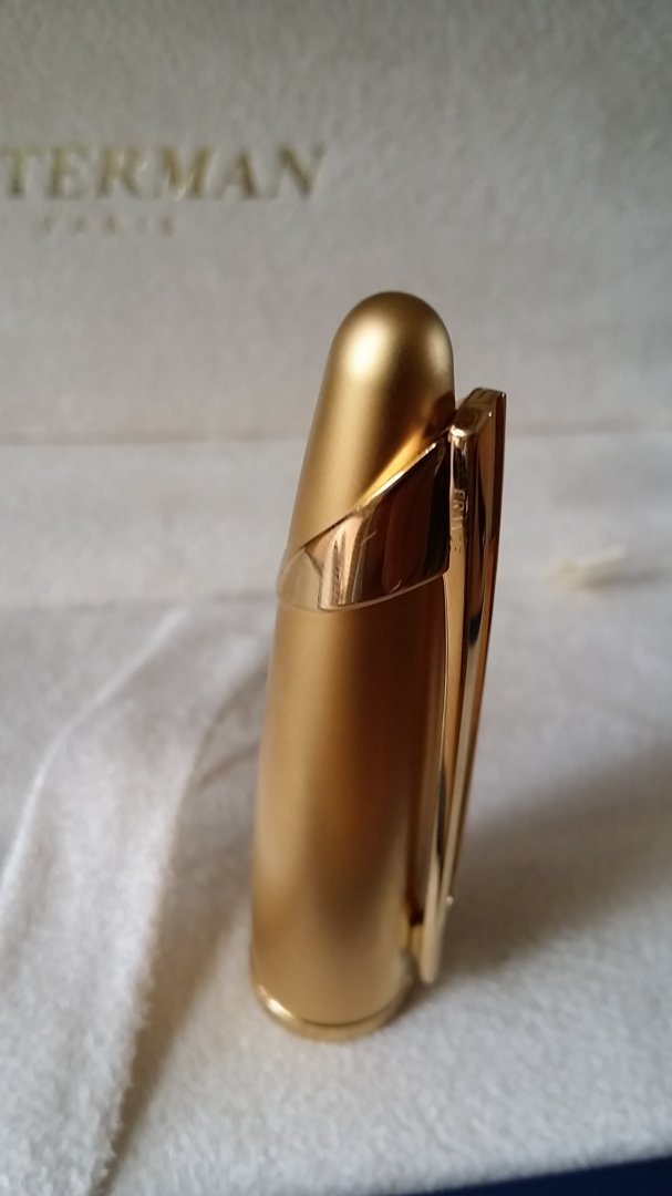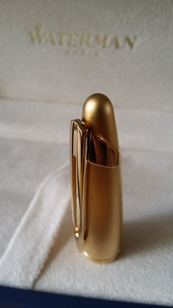 Phần nắp rất nặng, được ghi chú vàng 23k. Hoàn thiện bề mặt mờ mịn hoàn hảo. Rất cứng khi giắt trong túi áo, một điều an toàn cần thiết để giữ cho cây bút nặng.