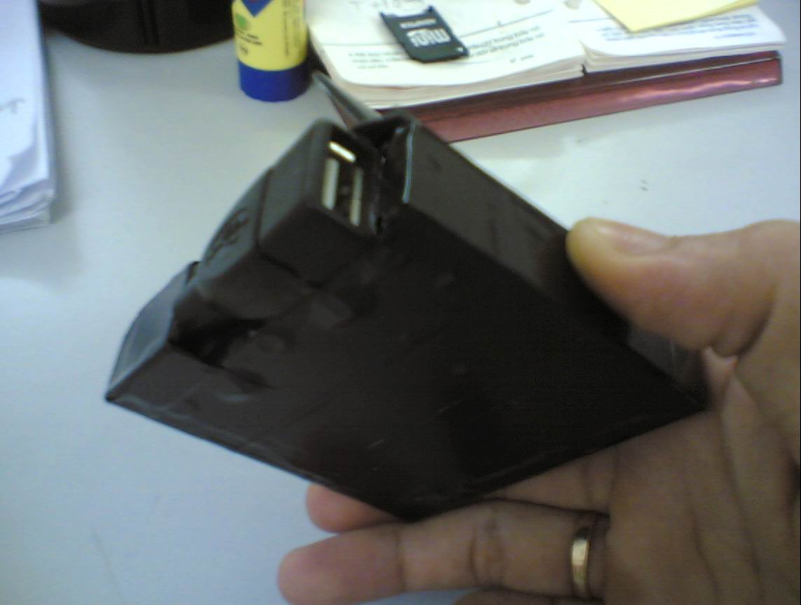 Xong lấy băng dính quấn kín lại, lấy keo con voi gắn cái cổng cắm USB chặt vào cái lắp pin, thế là xong bộ sạc.