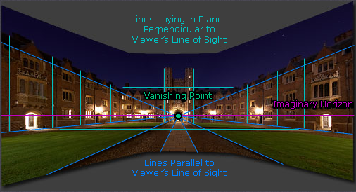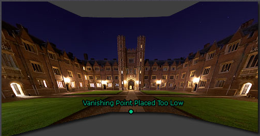 Trong ví dụ trên, điểm trọng tâm bị dịch chuyển lên trên hoặc dưới đường chân trời khiến tác động đến hình ảnh rõ rệt, nhìn toà nhà như đang đổ xuống hoặc ngửa ra tại góc nhìn.