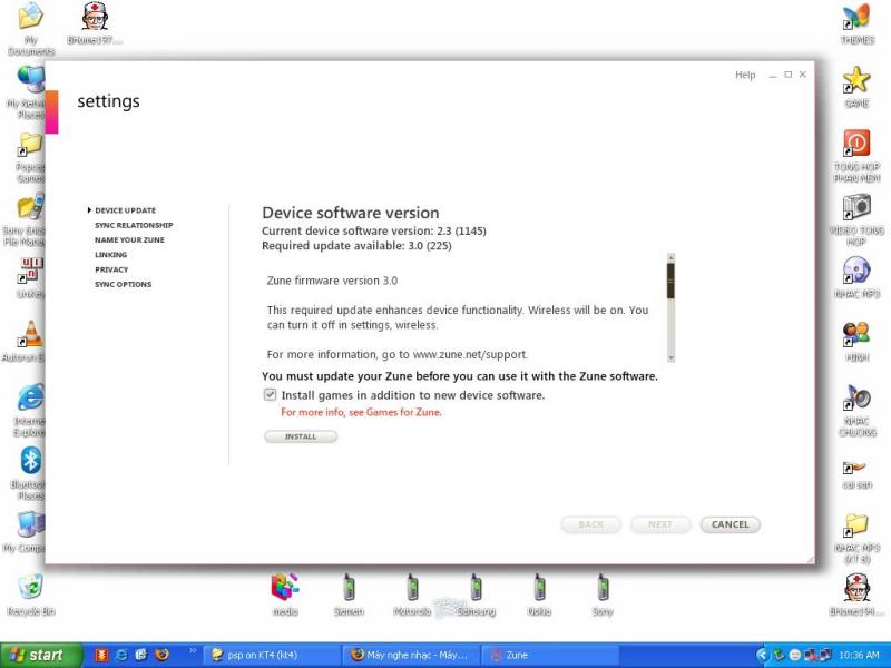 Mình có 1 máy Zune 8G version 2.3,đã cài zune software 3.0 vào PC.Khi kết nối với máy thì hiện lên bảng thông báo sau .Mình chọn update thì lại hiện lên bảng báo lỗi,không thể update lên được,Cancel thì chương trình không nhận máy,bác nào rành máy này hướng dẫn mình với,không tài nào cài nhạc,hình,video cho máy được #-o